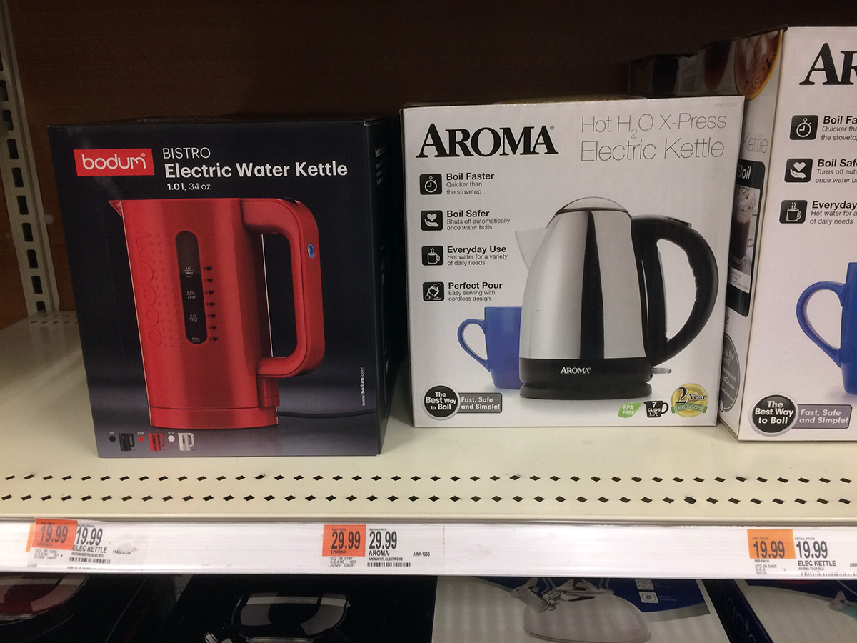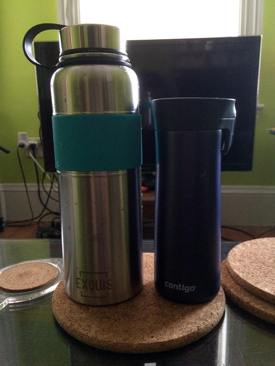 i looked for a small cutting board at marshalls but they didn't have any that met my specifications: around 11x7" in dimension with a loop handle. next i browsed the extension selection of insulated bottles. i decided to get an exquis 40 oz. bottle ($10), advertised to keep cold for 24 hours and hot for 12 hours. i was more interested in the cold insulation.