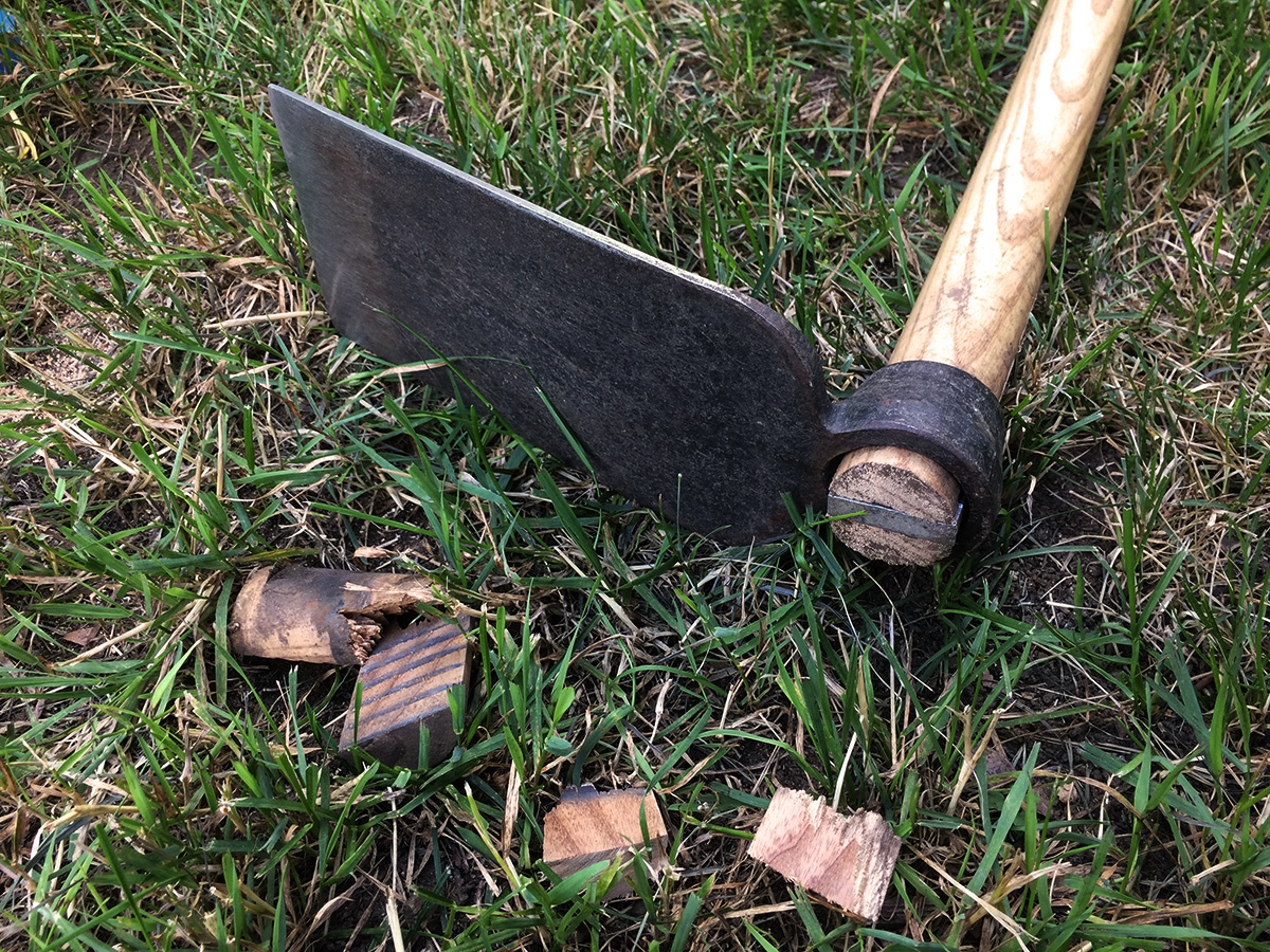 my father and i spent some time in the backyard digging up some more bamboo rhizomes. there was a long patch of what looked to be miniature bonsai bamboos that grow between a border of bricks and dead logs. they were easy to pull up (basically follow the trail of bamboos) but once we started digging, we discovered a large mass of underground bamboo roots. my father managed to break the head of his wooden grub hoe pole; he fixed it by cutting a new opening to insert the wedge pin.