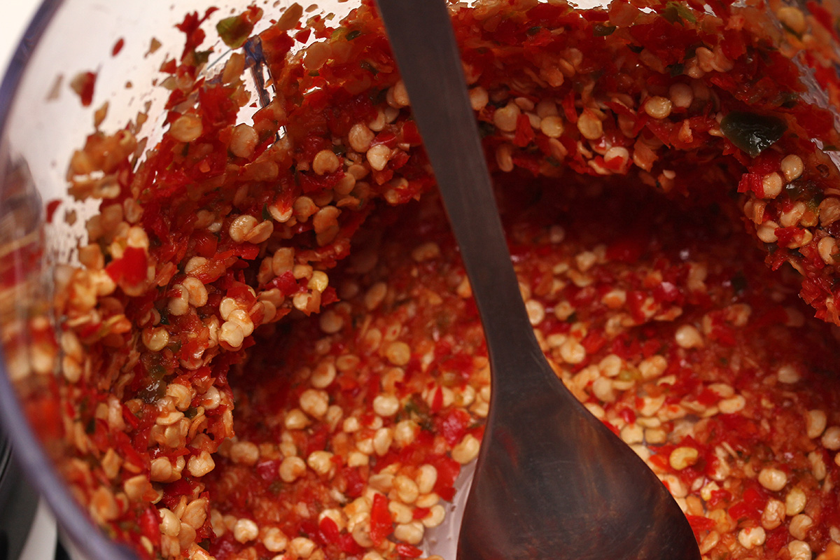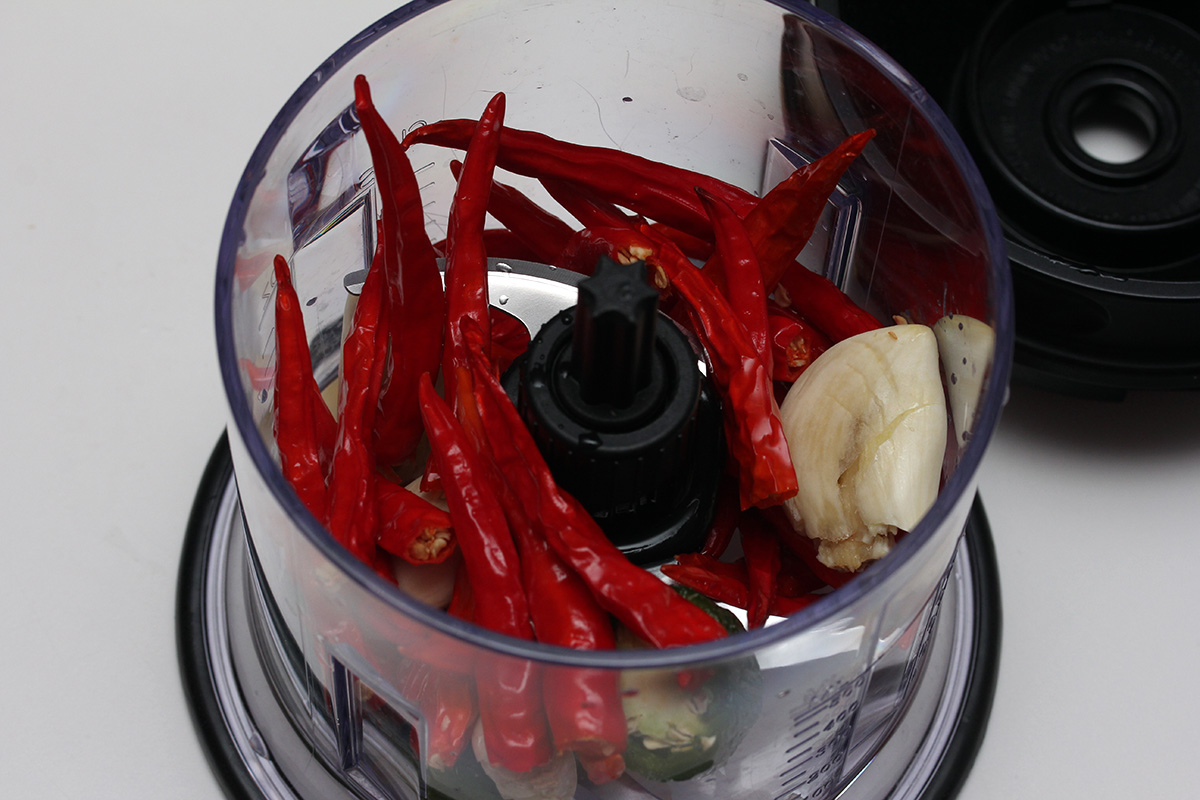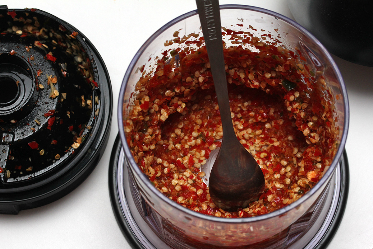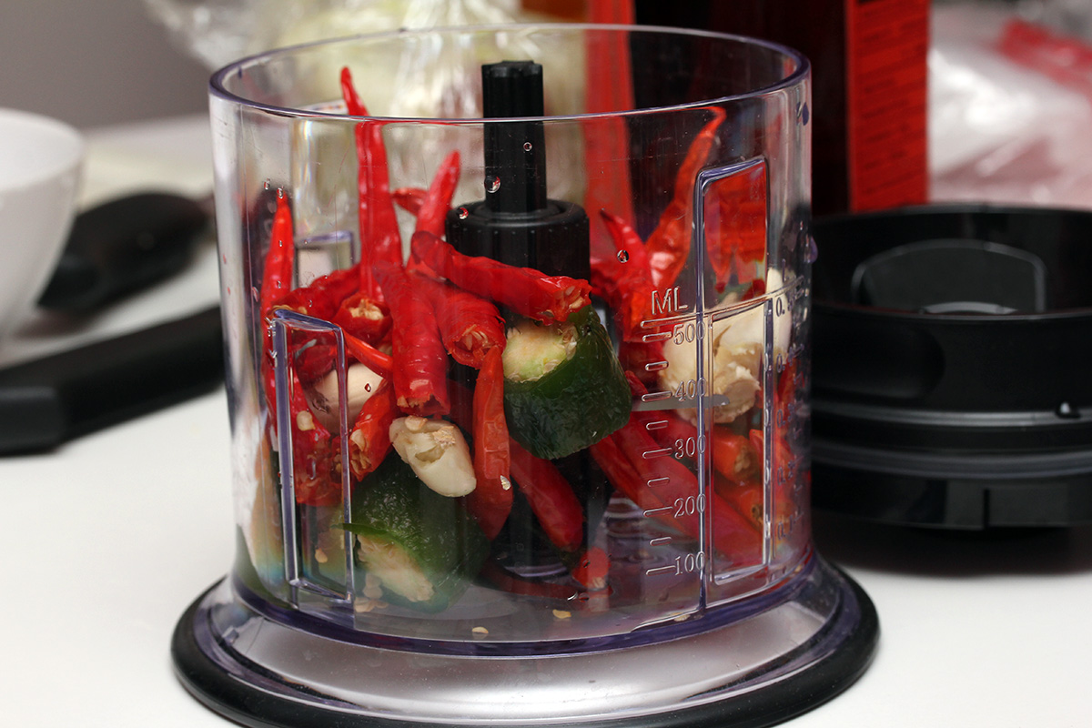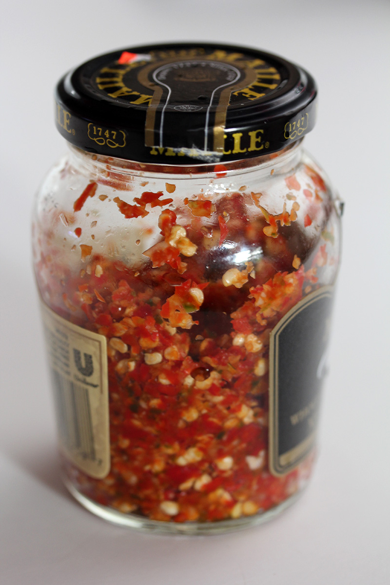 i finally decided to throw them into the food processor and turn them into a hot sauce paste. i cut off the stems from the handful of red cayenne peppers and did the same with the one lone jalapeno. i also added a few cloves of garlic, a dash of chinese baijiu, and some salt and sugar. the sauce ended up being a lot of seeds with not too much pulp since the peppers were a bit dried out. there was no way to judge the flavor without testing, and no way to test the flavor without burning my mouth, but at least these weren't habanero peppers. after an initial test taste i decided to add another tsp of salt to enhance the flavor. the final result tasted like a somewhat generic but very spicy hot sauce, maybe the flavor will get better once it's had some time to ferment. i will give the jar of sauce to my mother, the ultimate connoisseur of hot sauces.