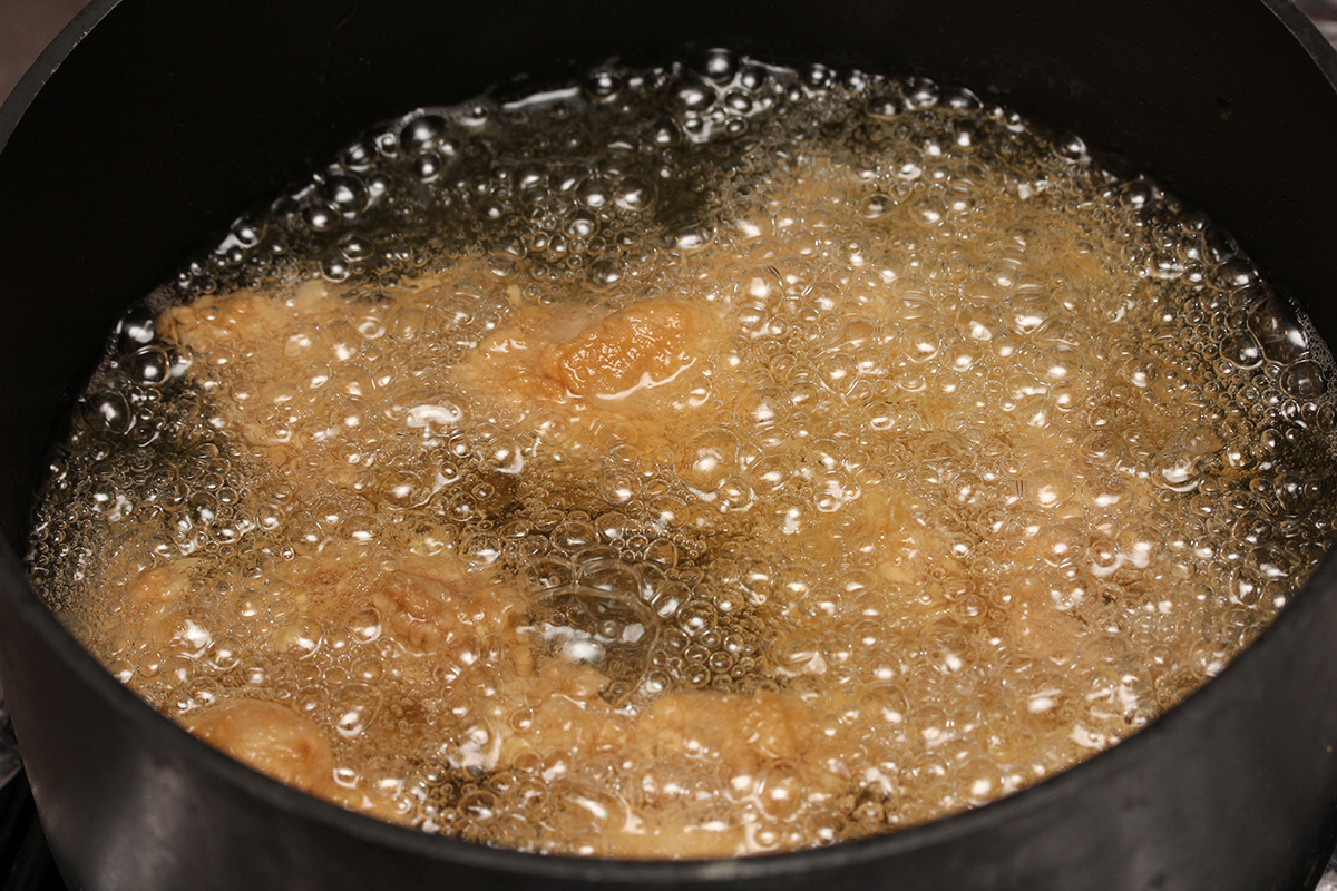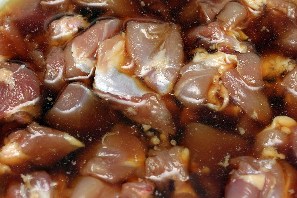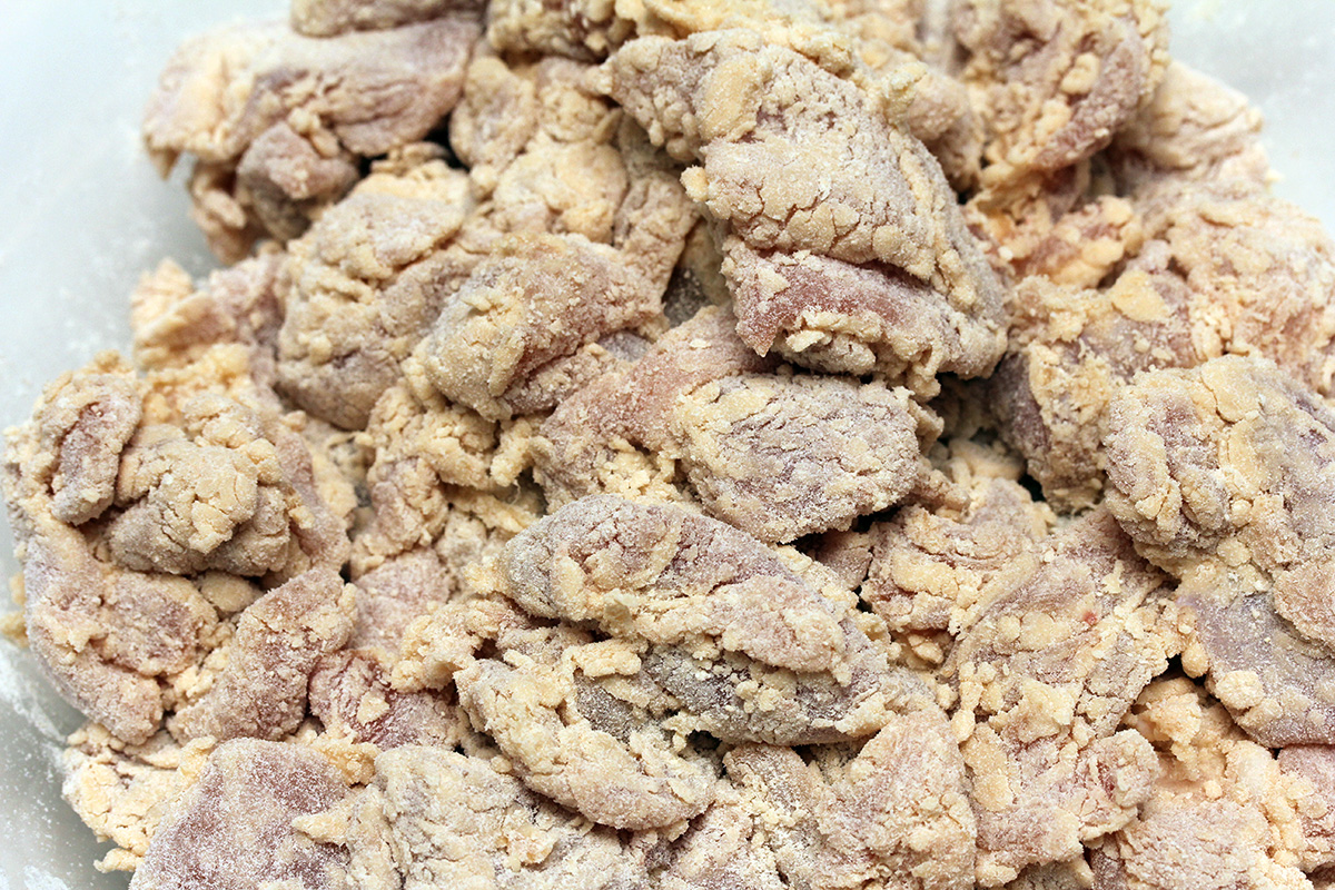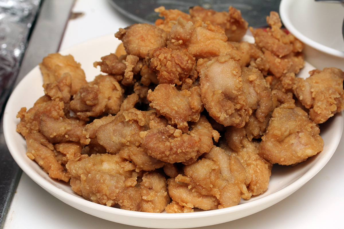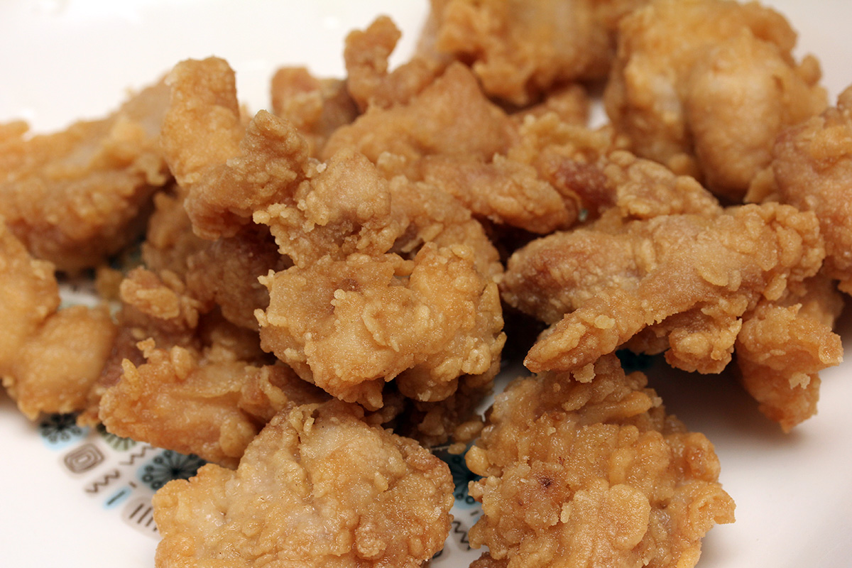 (marinade): 1 cup rice wine 1/4 cup soy sauce 1 lbs. chicken thighs (batter): 1 cup flour 1 tbsp salt (frying): vegetable oil |
