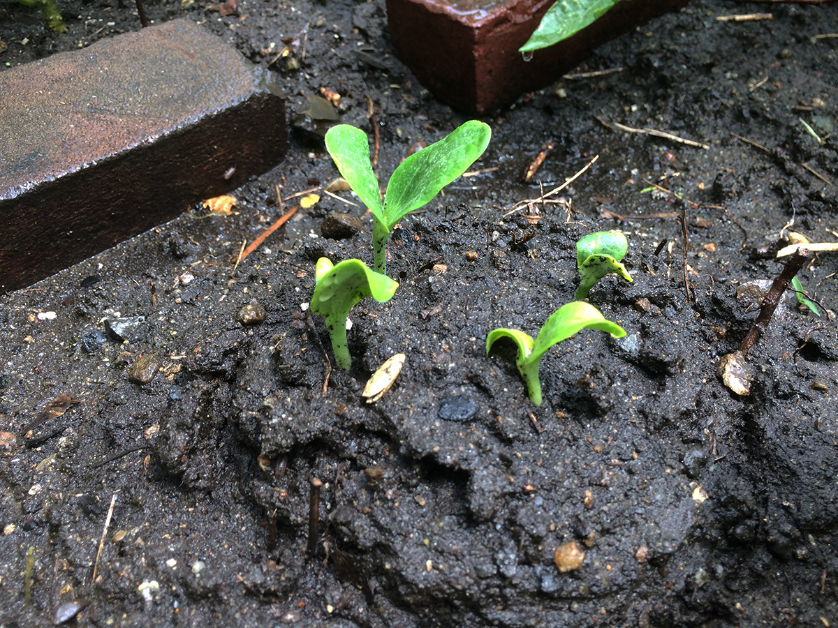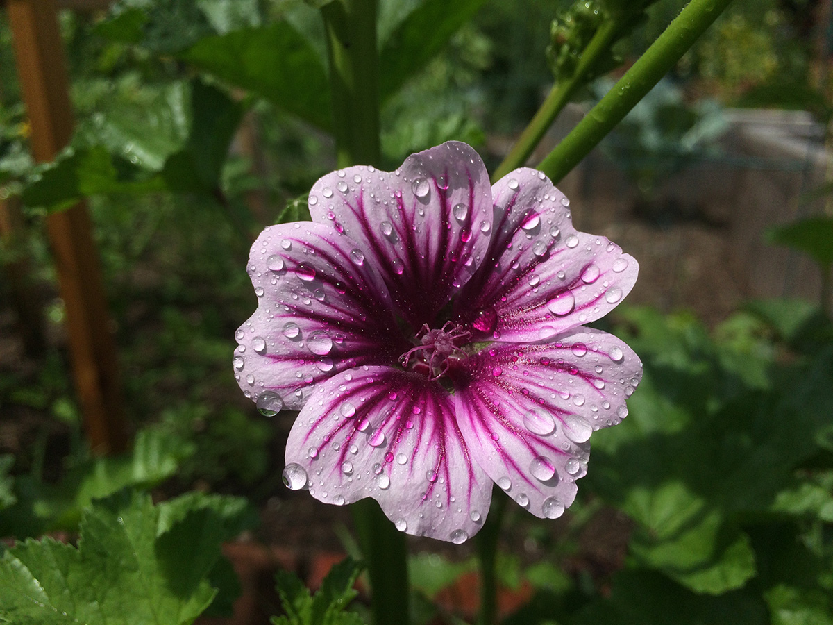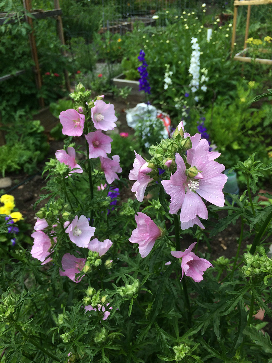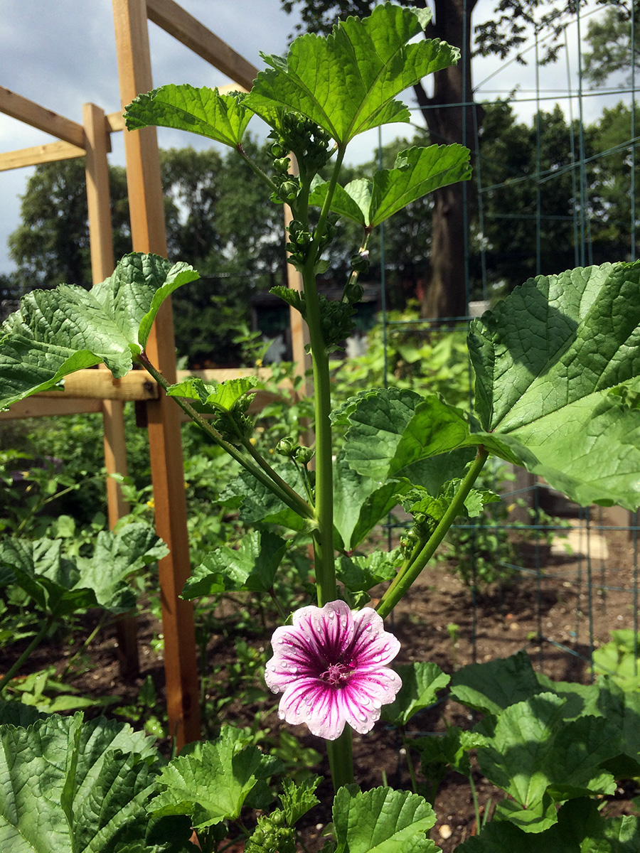 i went to the community garden first to water my plants. all the vegetables seem to be doing well. i found a small immature cucumber, hopefully it can develop into a mature fruit. one of my tomatoes has unusually large flowers, which maybe means unusually large tomatoes down the line. the larkspurs were putting up more of a color show, with whites, violets, deep purples, and pinks. but the thing i was most excited about seeing was the flowering of my very malva zebrina. as i noted a few days ago, the plants themselves are not very tall - maybe 2 ft high - but there are many flower buds and hopefully it'll put on a long show. so far no insect pests, which is good, as these hollyhocks tend to attract a specific type of weevil invaders. i am the only gardener who's growing them and i wonder if other gardeners have noticed. they will look more spectacular once more flower buds open up.