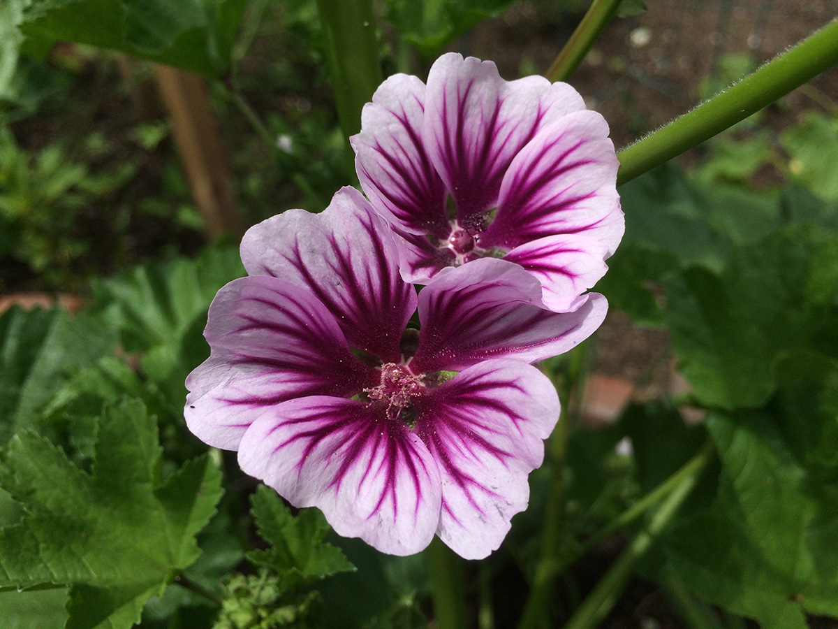 a second malva zebrina flower had blossomed in the community garden. while i was there joel showed up. i realized i really enjoy talking gardening, i could chat about it all day. joel was impressed with all the lush growth in my plot, half of which were already there when i moved in. it was a sharp contrast to his own plot, where it was mostly a bare patch of dirt. not that he didn't try growing anything there, but all the seeds he planted were eaten once they emerged. he thought it was rabbits and showed me some of the damage on his bokchoi leaves, but to me they looked like slug damage, rabbits would've completely eaten the entire plant.