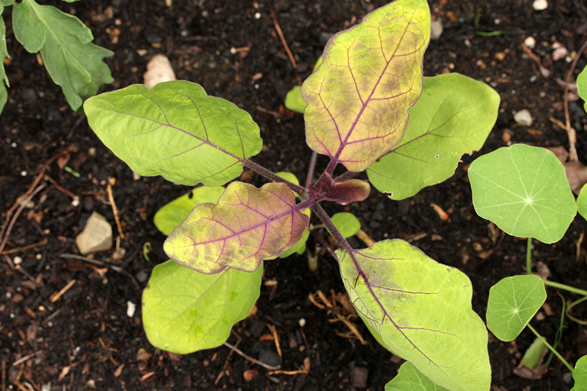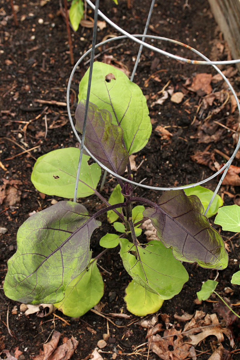 the eggplant leaves aren't particularly green. one eggplant has new leaves that are yellow, another plant has new leaves that are purple. is there something wrong with the soil? besides the strange colors, the leaves seem to be doing well. hopefully they'll turn green eventually.
