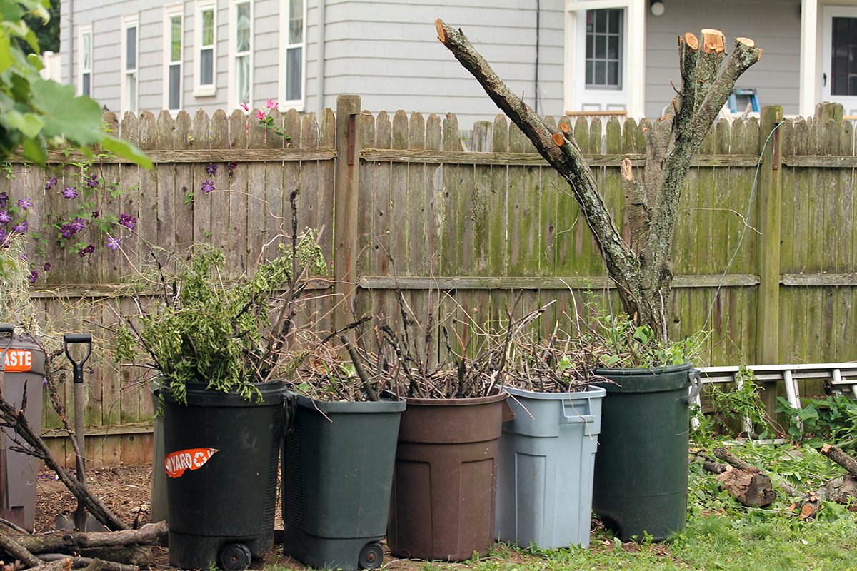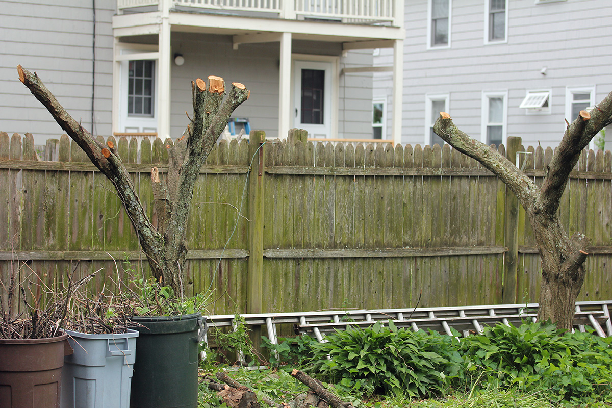 my father and i managed to clean up most of the debris we cut from the dead plum trees on monday. we're waiting until the next garden refuse pickup on tuesday (or later in the week, depending on when's the new trash day due to the 4th of july holiday weekend) before chopping down the rest of the trees since we don't have anymore empty bins left. twigs and branches we threw into the bins but the wisteria vines we tied up into 4 neat bundles. now that the dead trees are mostly gone, it's quite jarring to be able to see our backyard neighbors so clearly now.