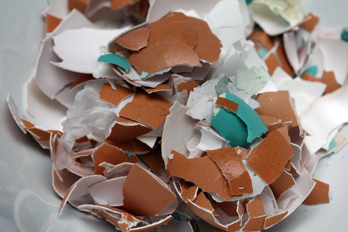 back at home i began crushing some leftover eggshells so i could make a slug prevention barrier. i even crushed a small robin egg eggshell that i found a few days ago, no shells shall go to waste. i used a meat tenderizer at first, but once the shells got small enough i could just easily break them down further using my fingers. i ended up with a fine powder which i poured into an empty plastic prescription drug bottle.