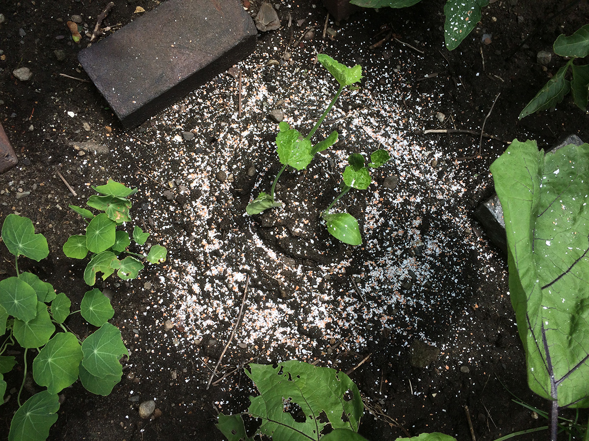 i returned to the garden in the afternoon to sprinkle the crushed eggshells around the zucchini seedlings. since i already watered earlier, i didn't have to water again so could avoid washing away the crushed eggshells for the time being.