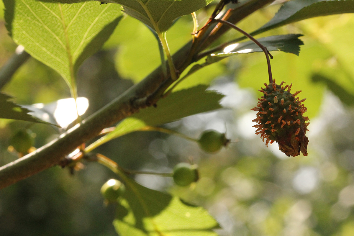 the hawthorn tree seems to be doing well in its little corner of the yard. ever since we chopped down the invasive black cherry and cut most of the pussy willow, there's been more sun there, which is good news not only for the hawthorn but also for the patch of garlic chives. one thing about the hawthorn is that some of the berries seemed to have been infected by some gall and form these spiky balls. hopefully it's only for a few of them and we can still get some red berries in the autumn and winter.