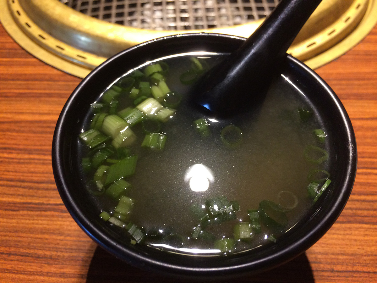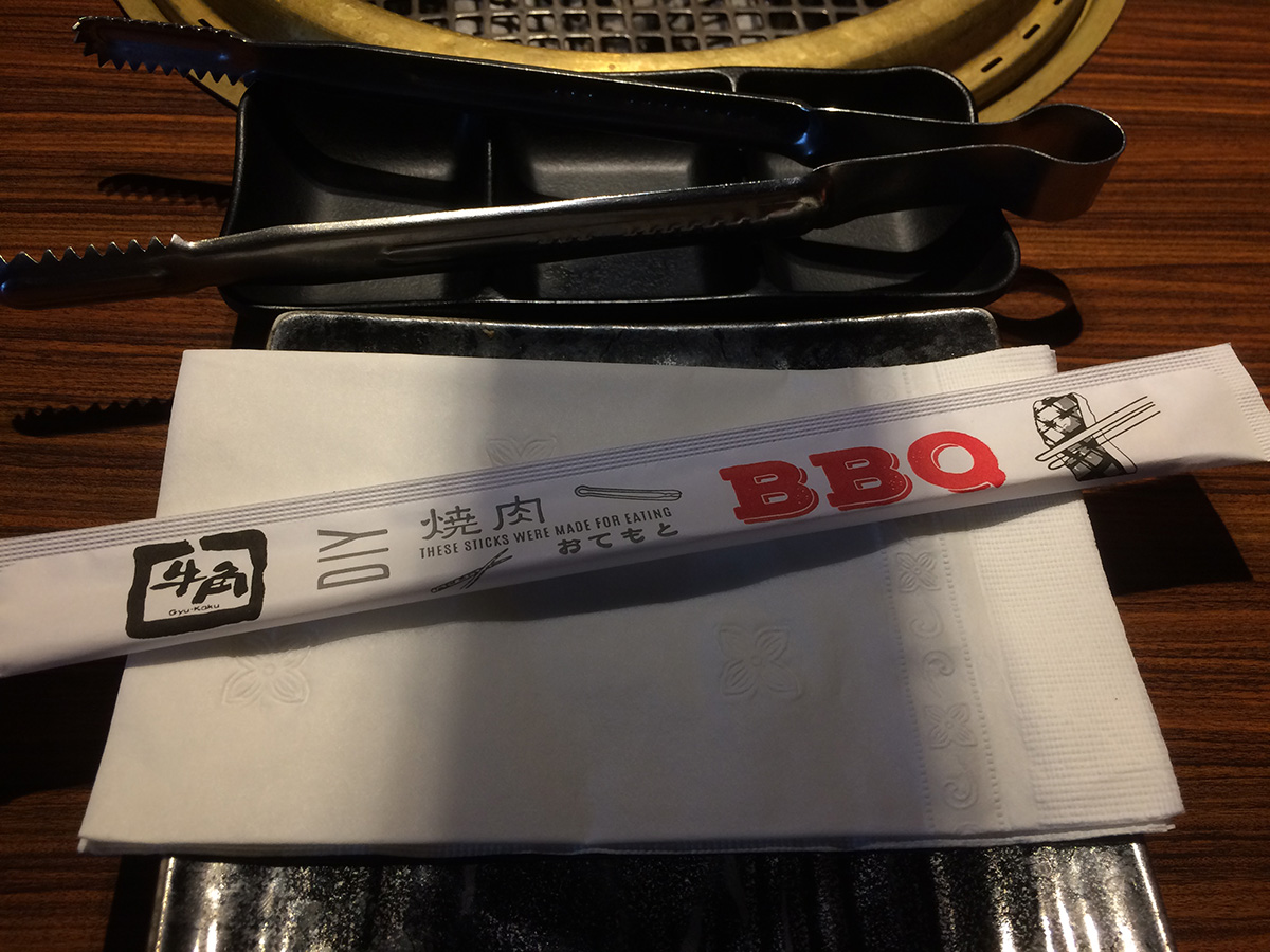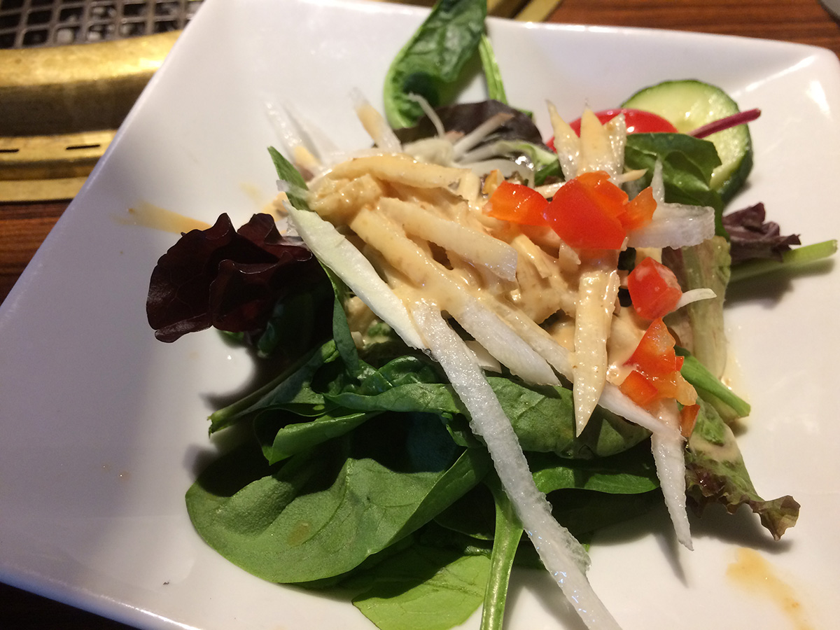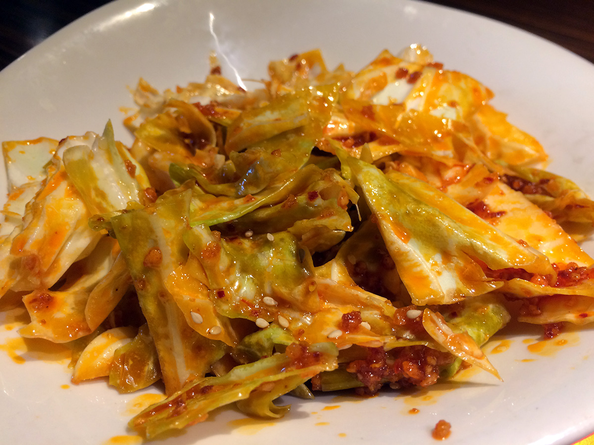 although gyu-kaku is a japanese barbecue restaurant, i associate it with korean barbecue, and a lot of items on the menu are korean inspired. typically korean barbecue can be pricey, but i discovered that gyu-kaku has a pretty (relatively) cheap lunch menu. i got the 3 meat lunch special ($14.95) which comes with miso soup, a salad, and rice, along with 3 choices of barbecue meats. i ended up selecting huromon miso, yaki shabu beef miso, and beef tongue (with was a $3 extra option). eliza went with the more conservative 2 meat special and ordered the chicken basil and the bistro hanger steak miso. i also ordered a plate of addictive spicy cabbage ($4), intrigued by the description.