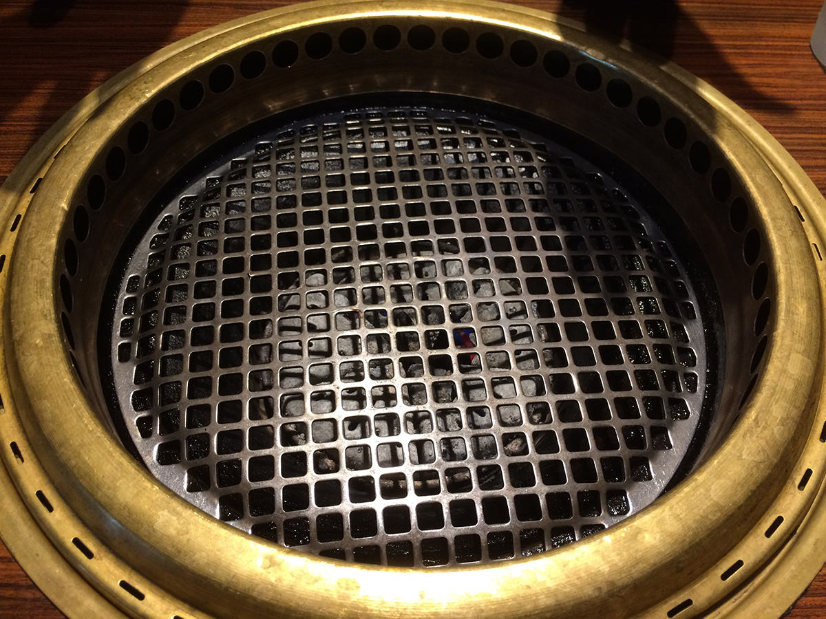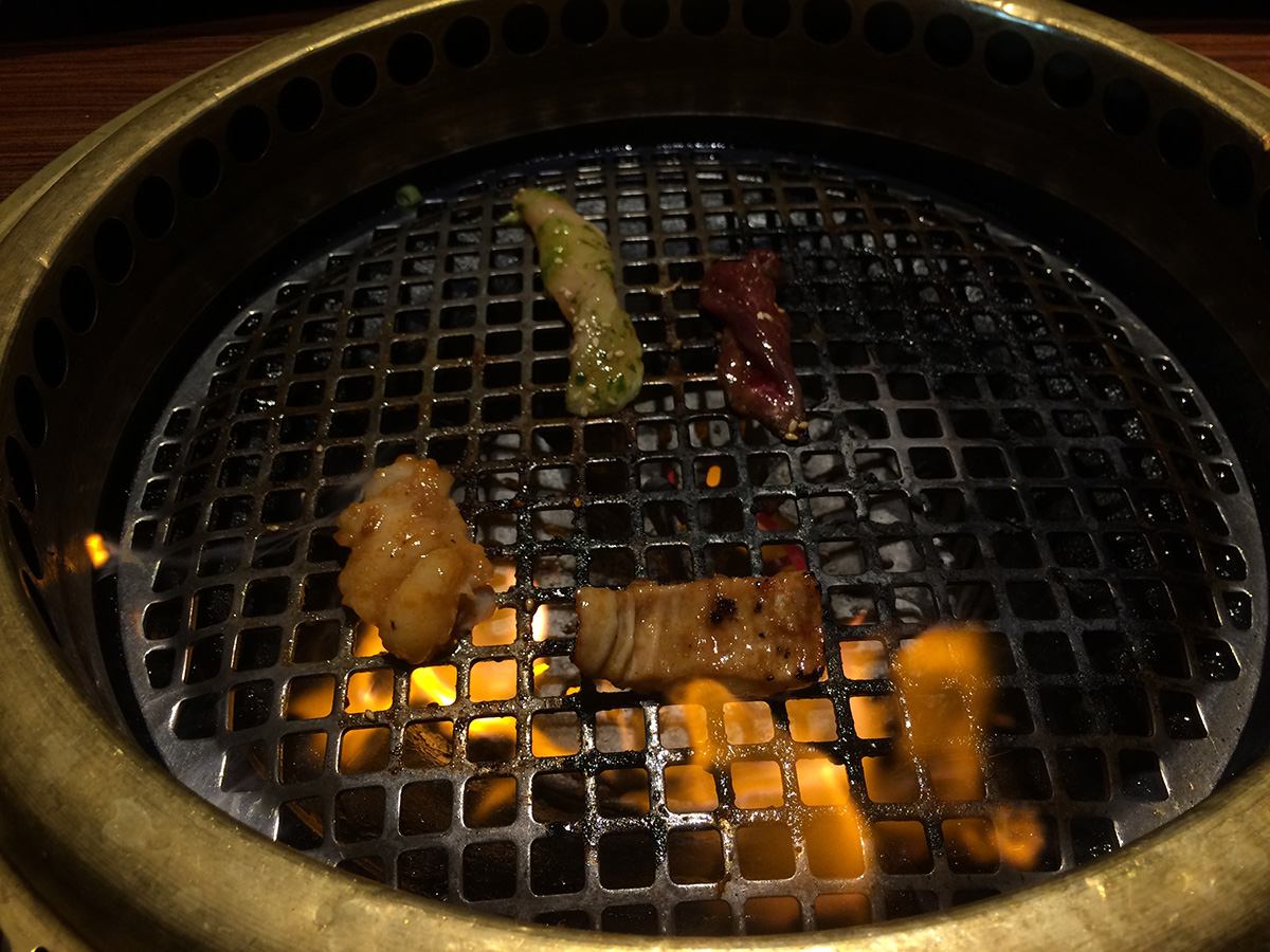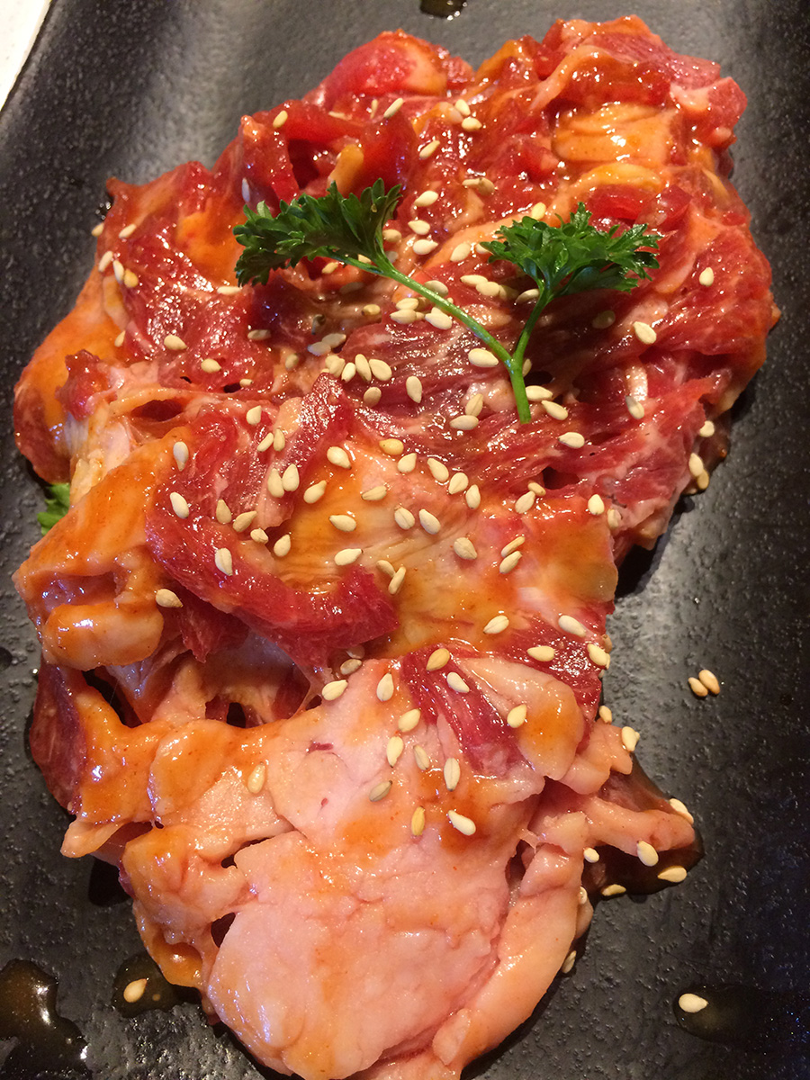 the soap and salad arrived first, followed by the assortment of different meats. there's a certain visceral element to korean barbecue, that close proximity to raw flesh can be unappetizing for some people. there was a wait on our rice so we began to barbecue.