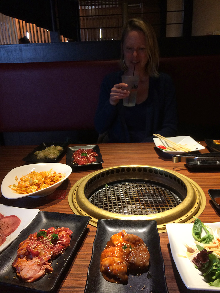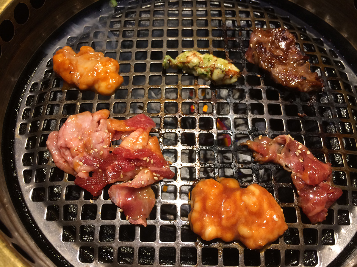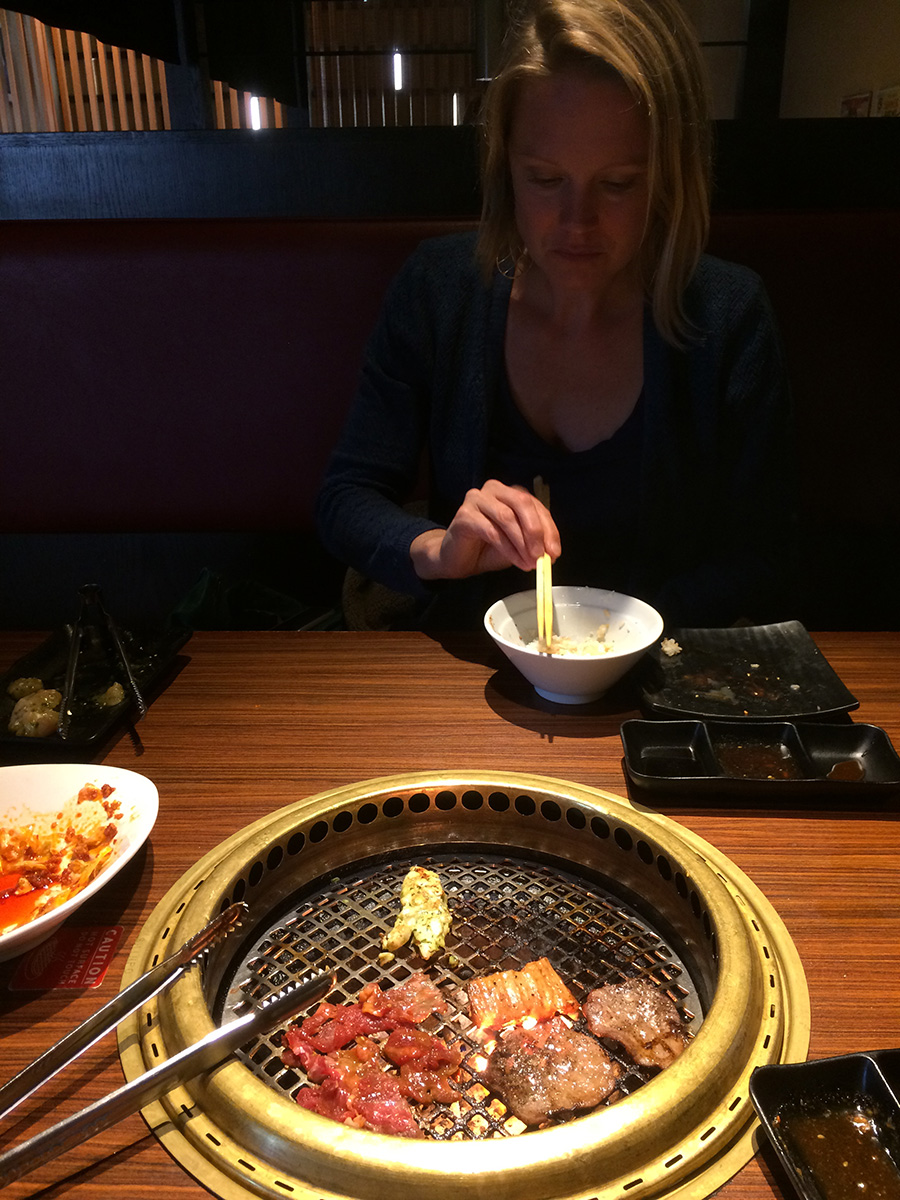 the yaki shabu beef tasted like typical korean bulgogi. the tongue was bland and tongue, not worth ordering again for future visits. i discovered that huromon is actually intestines, it didn't taste how i remembered it, mostly fat with a bit of intestinal wall lining crunch. i didn't give eliza any huromon to try and she wasn't interested anyway. eliza's bistro hanger steaks were really good, a delicious marinade that didn't need any additional sauce. the chicken was chicken, i didn't really taste any of the basil. we finished eating by 3:15pm, after spending more than an hour with our japanese barbecue adventure.