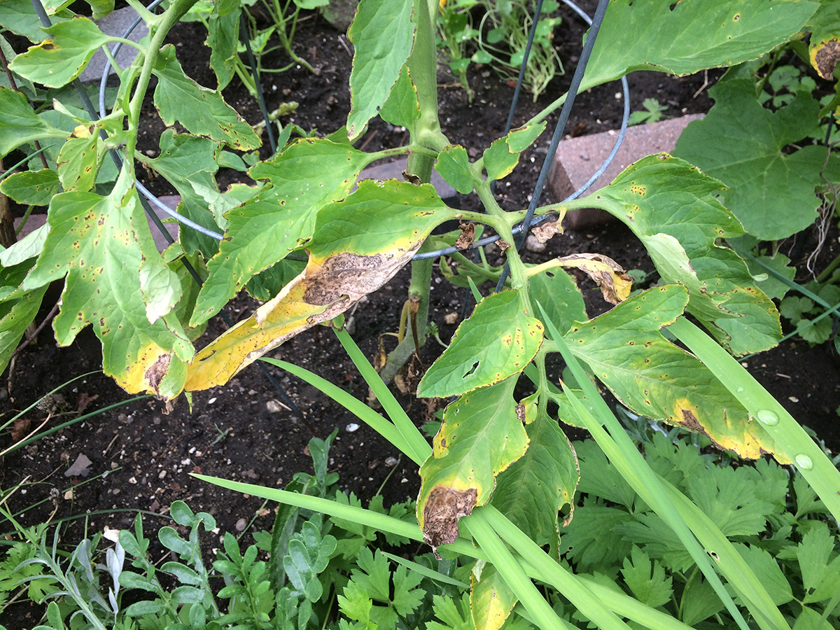 i went back to my community garden plot to cut off all the tomato leaves affected by early season blight. i removed a lot, i hope what leaves remain will be enough to mature the green tomato fruits. the cherry tomatoes seemed to be the most affected since they have thin stalks and branches. one of the two varieties of larger tomatoes doesn't seem to have any blight, while the other has a little. i think the good variety is the best boy, while the heirloom lifer is susceptible. currently i don't think it's easy to buy blight-resistant tomato seeds, at least none of the big seed sellers carry them (burpees, park). at this rate i might decide to forgo planting tomatoes next season and plant other vegetables, like eggplants, which so far don't have any diseases and the only pests were early season slugs.