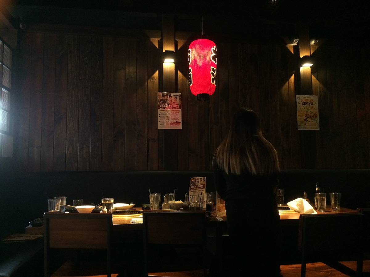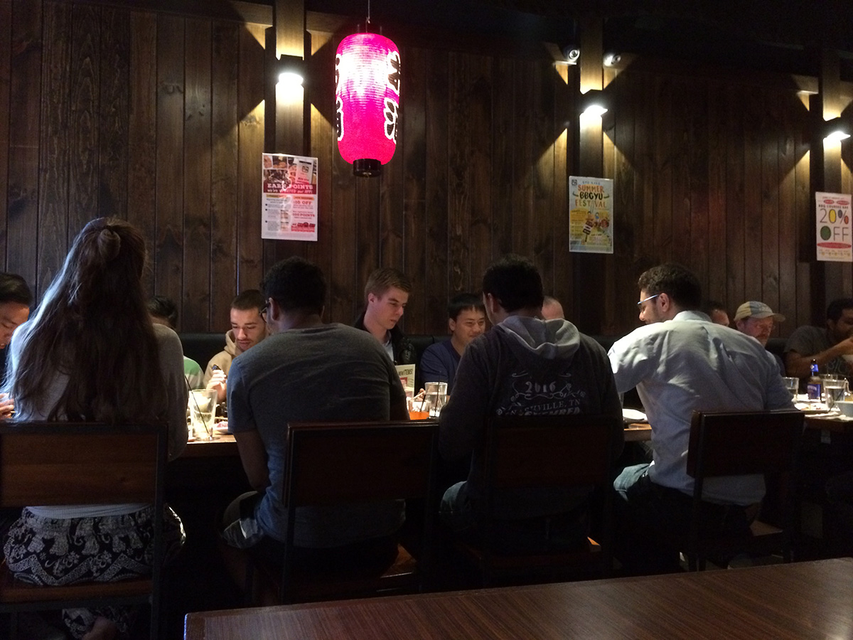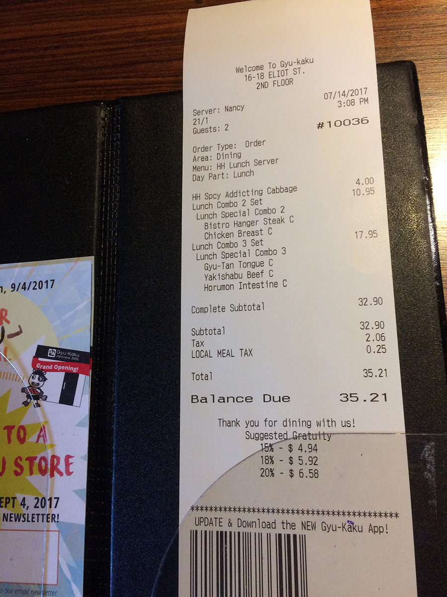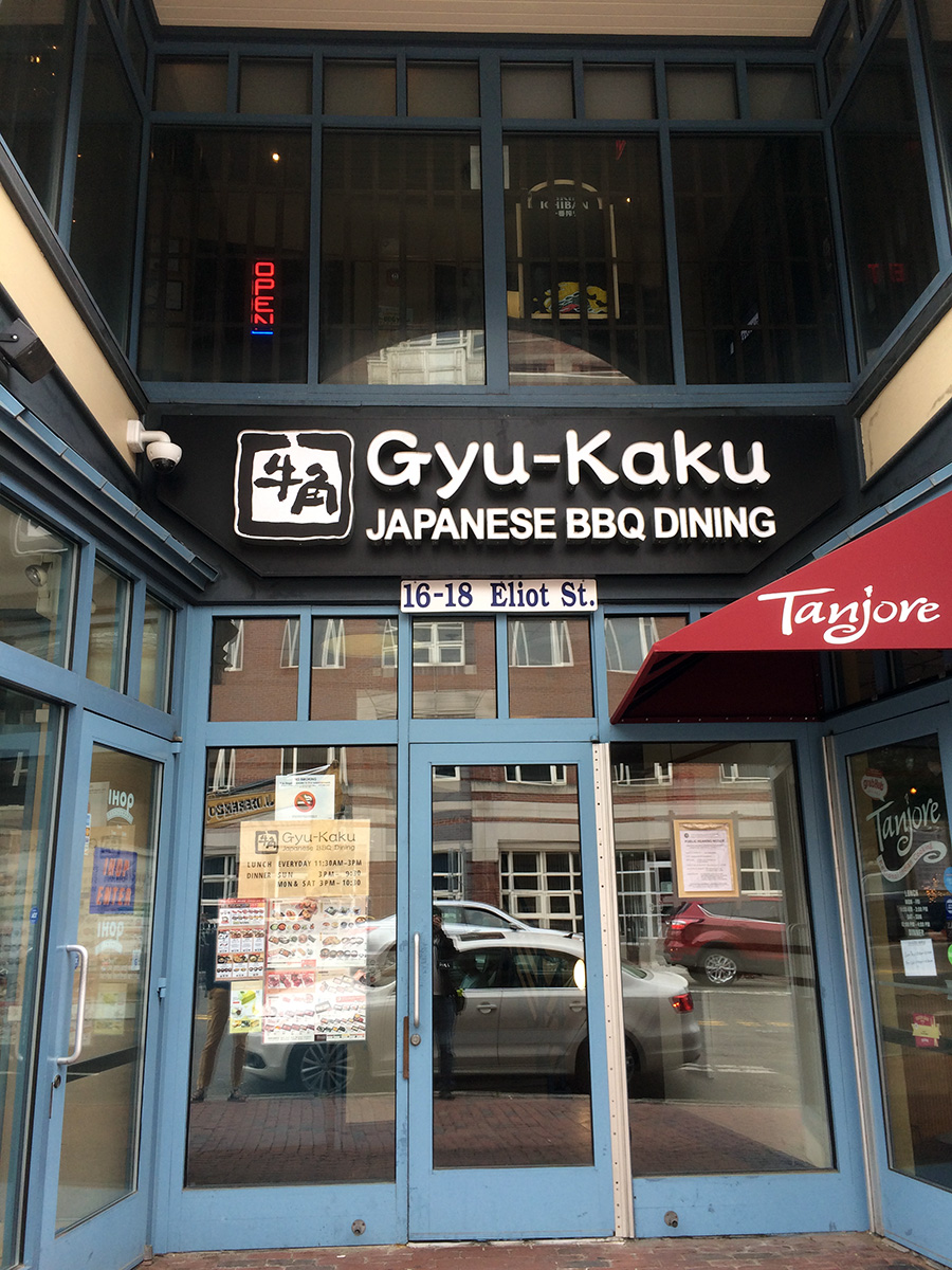 so we continued searching, tracing around the perimeter of the building clockwise to eliot street. while eliza got some cash from the ATM, i went ahead to scout, where i finally discovered gyu-kaku, above the IHOP.