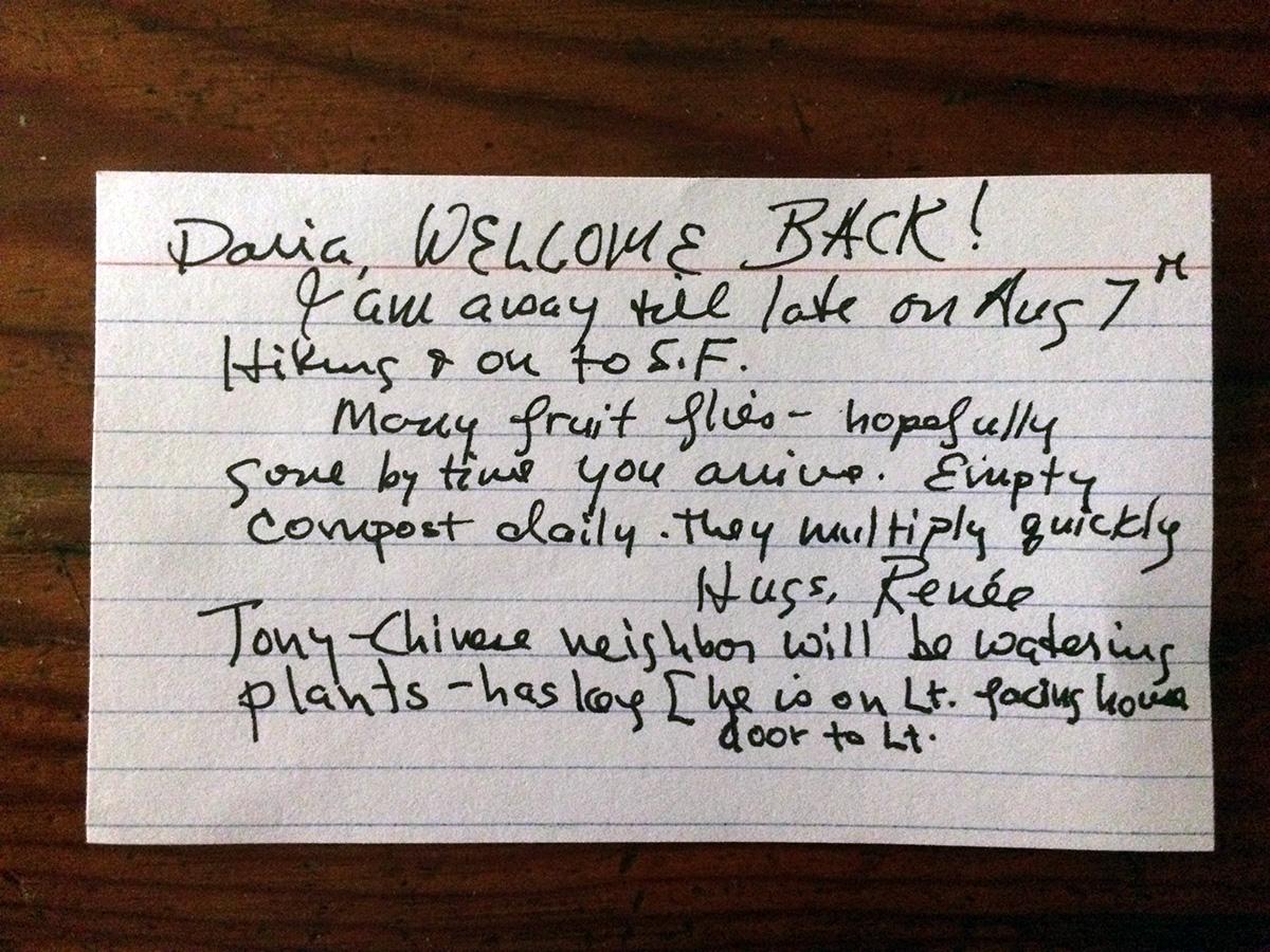my upstairs neighbor steve asked me a few times, including once to empty daily a bucket of water from our leaking roof while they went on vacation. nobody seemed to be in renee's house, although there was the possibility that her son might be there or her roommate. renee left her roommate a note on the kitchen counter. "Tony - Chinese neighbor will be watering plants." chinese neighbor. why not just neighbor? or next door neighbor? i felt a little weird afterwards, suddenly becoming aware of my minority status and how others might see me, not as a person but rather a race. the plants ended up not needing all that much watering, as she watered plenty before she left last friday. as for her fruit flies problem, there were none today because she finally got rid of her fruits which were lying outside. no fruits, no fruit flies!