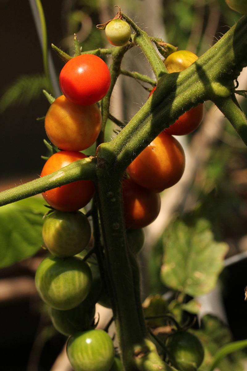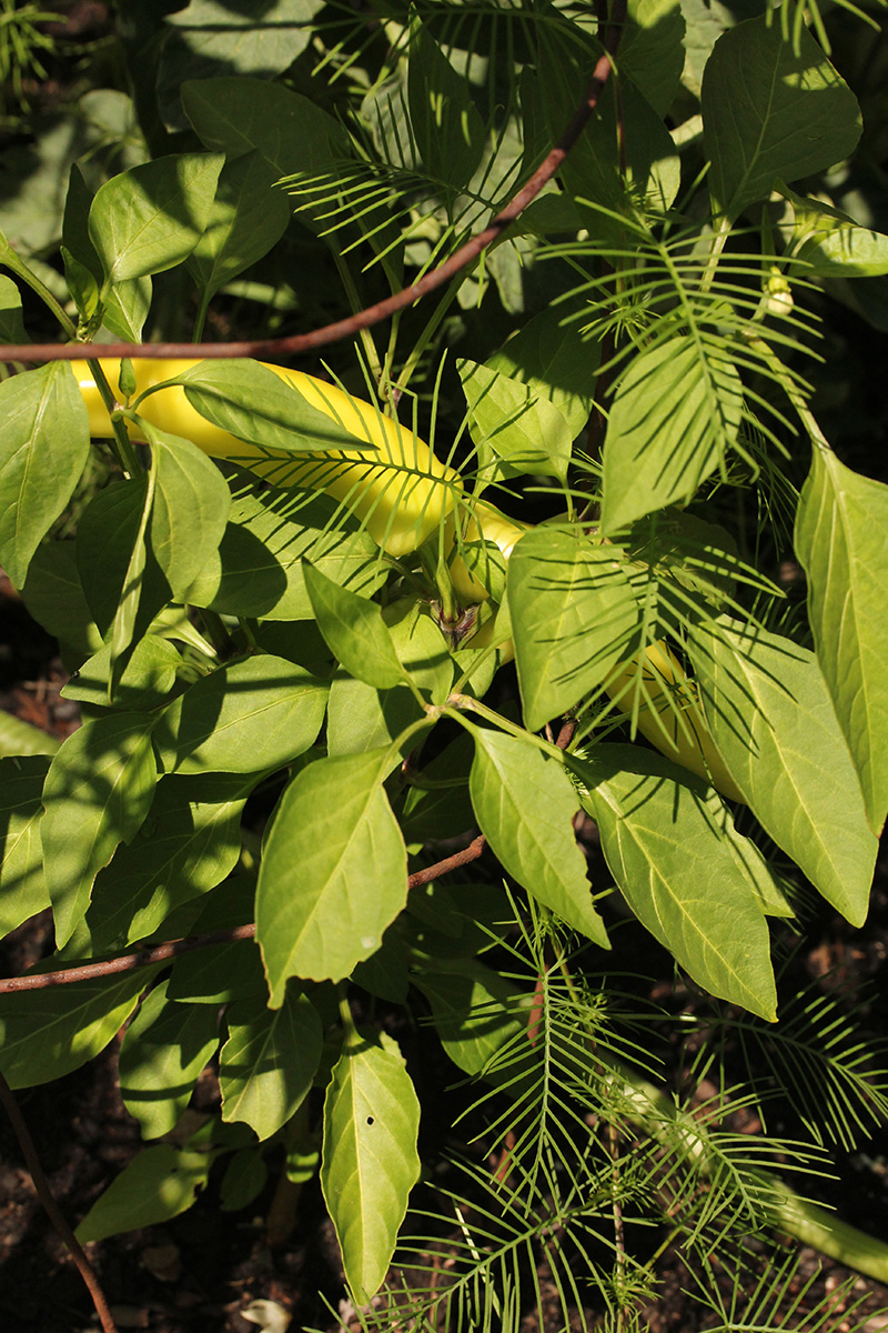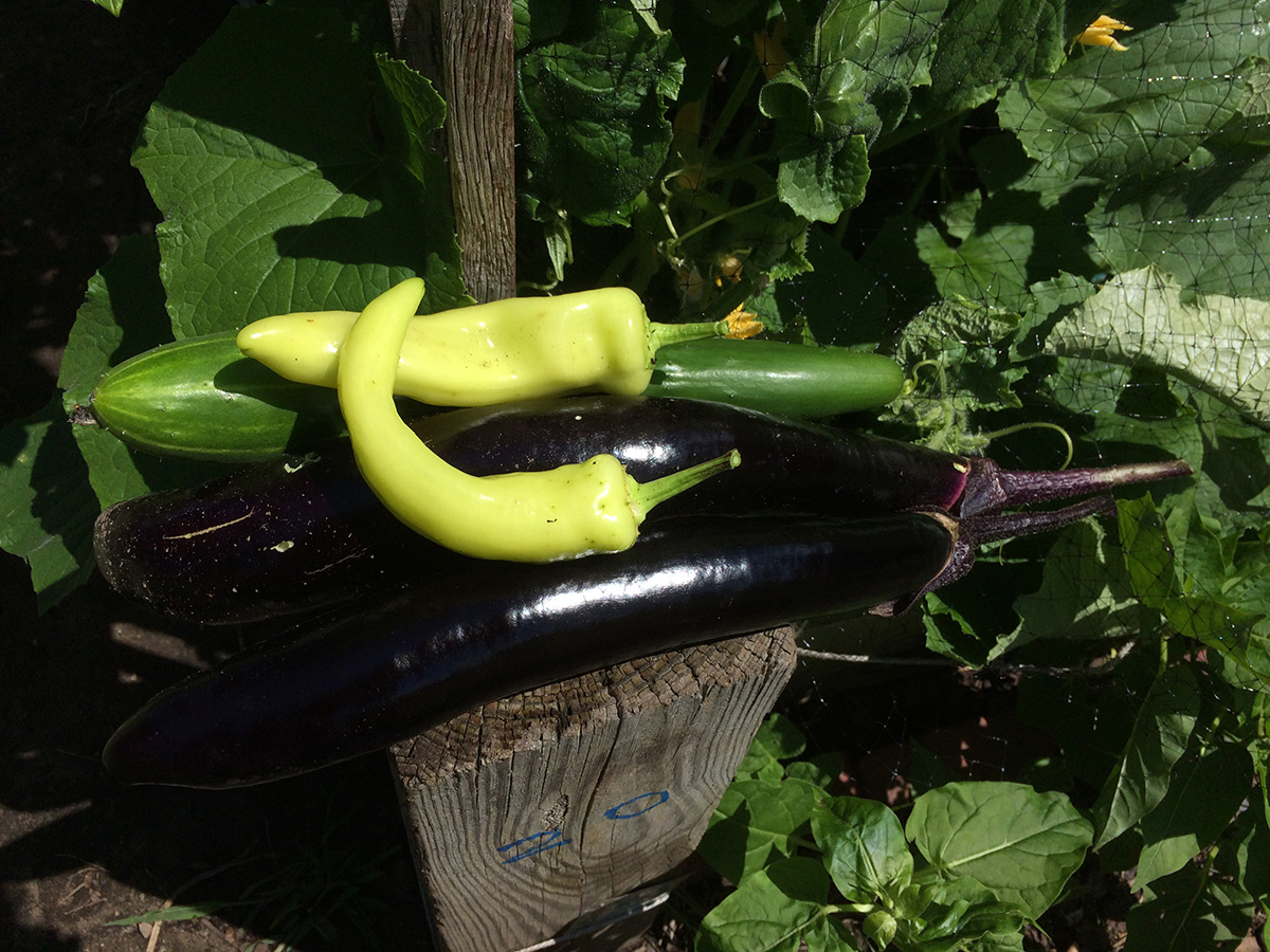 it's been 4 days since i last visited the community garden. besides watering and general inspection, there were also at least a few japanese eggplants that needed to be harvested. i ended up collecting 2 eggplants, 2 hungarian wax peppers, and a cucumber. while the peppers could be pried off by hand and the cucumber cut with my tiny key knife, the stems of the eggplants are almost woodsy, and required the service of a pair of pruning shears in the tool shed. the eggplants were long and had dangerous thorns on the stems so i had to be careful.