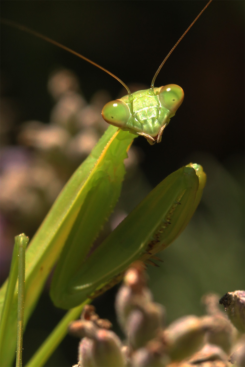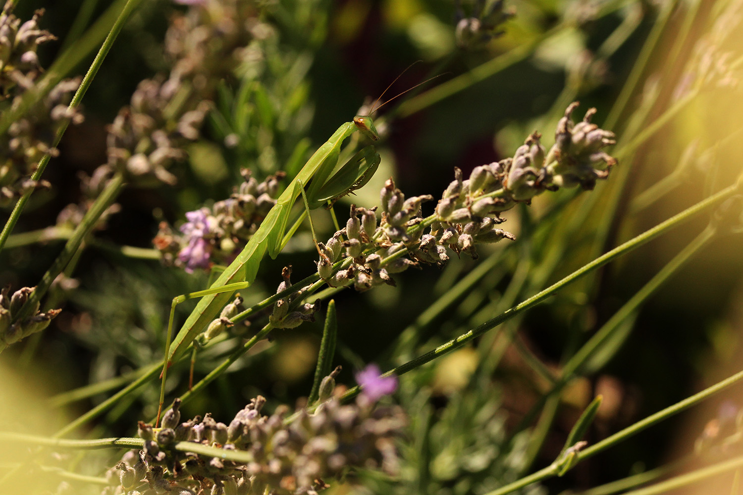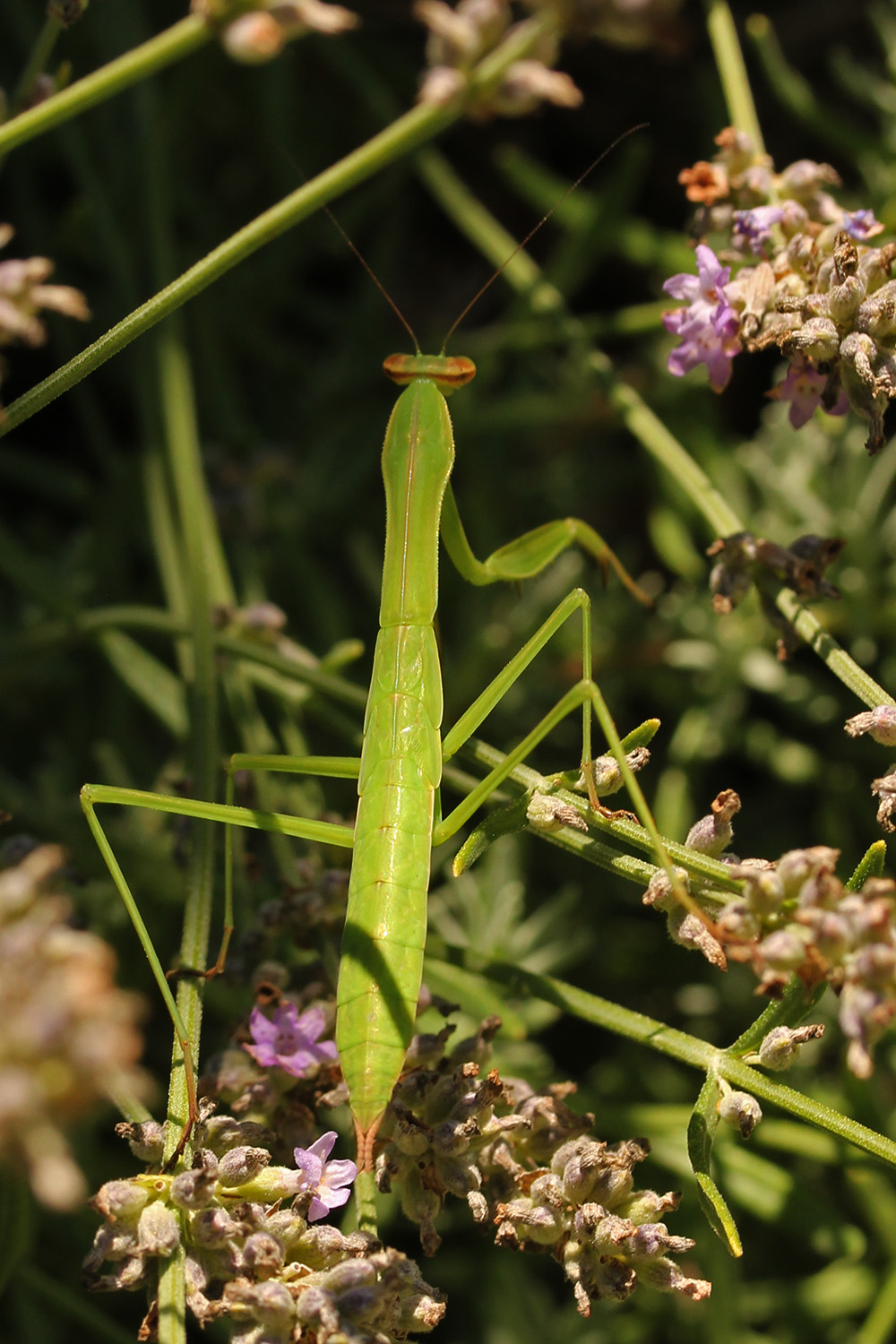 i found the mantis again, hiding in the lavender patch. it's actually bigger than before, 2-1/2 inches at this point, but with wings still undeveloped. i'm curious how it got in raised bed 3, considering it's the only one. of course i also saw baby mantises on the western side of the backyard (in the perennial flower bed, in the raspberry patch), but those were brown variety and this one was green. as it can't fly (yet), i shouldn't be surprised it's still living in the lavender patch. and it's obviously eating well since it's still growing. i'm still not quite sure what kind of mantis it is. originally i thought it was a european, but i can't really see the tell-tale eyespots on its armpits. european males grow to about 3" in size. maybe once it's fully developed will i be able to tell what kind it is.