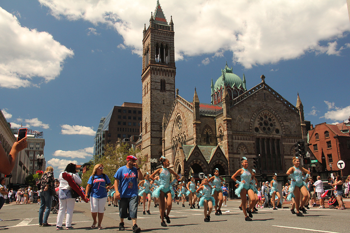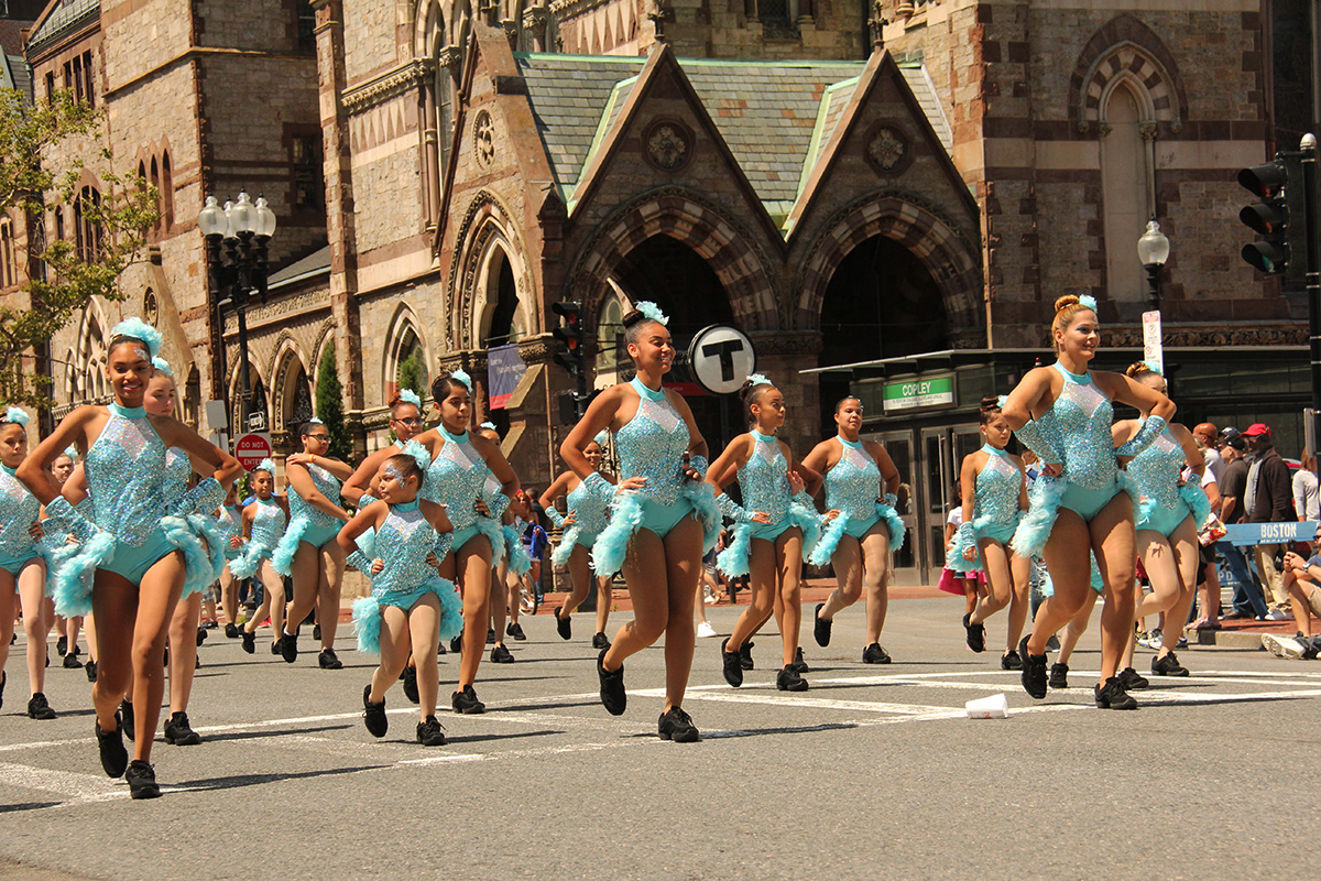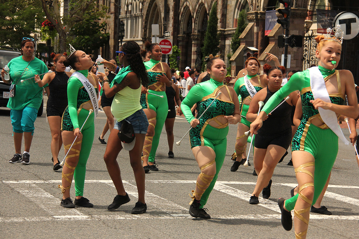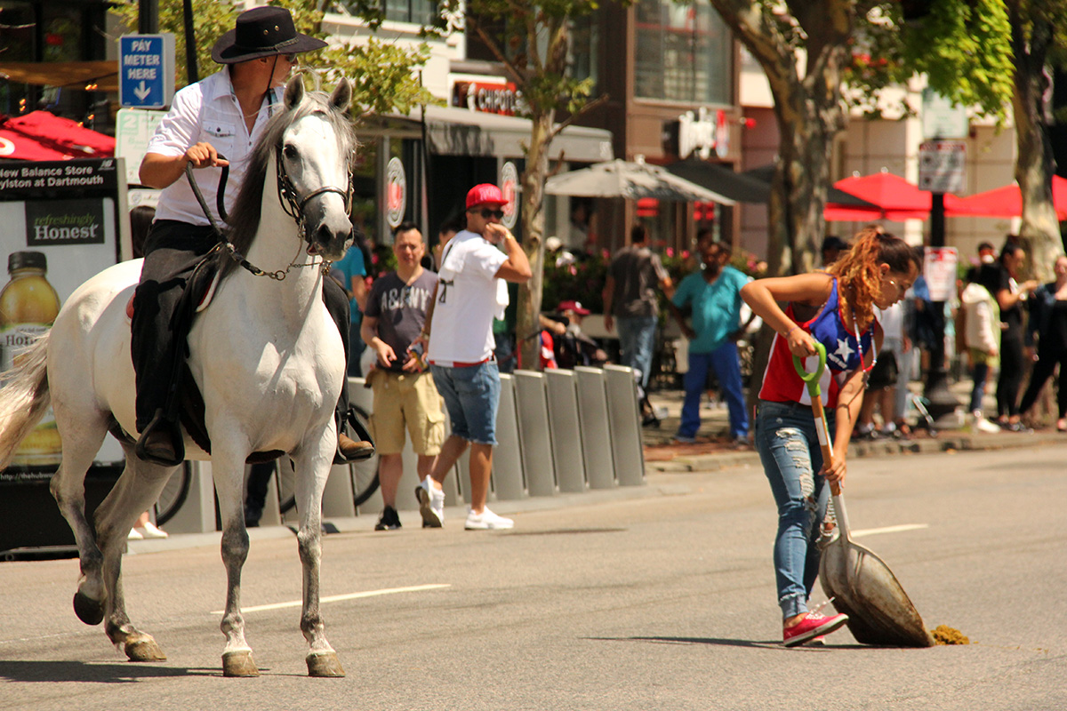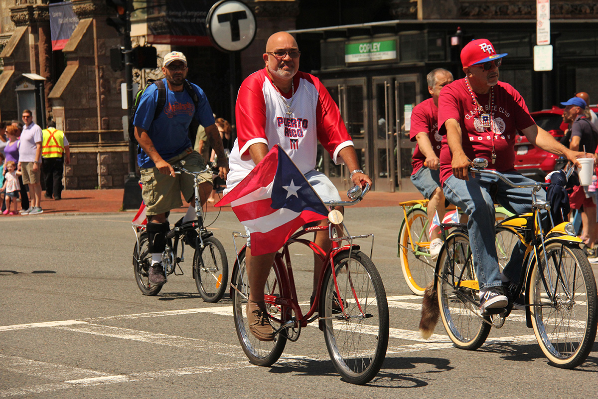 we didn't leave until 11:17am, taking us 24 minutes of riding to get to copley square. it was a nice day, not too cold, not too warm, although it felt hotter after a bit of riding. i wore pants but it was definitely shorts weather. i've never taken GC into boston before via bike, and i haven't biked into boston myself in a while. the farthest we've gone in the direct of boston was just to central square. we found a post to lock the bikes to along boylston street and waited at the southeastern corner of dartmouth and bolyston, my usual spot. actually not exactly usual, as it was a sunny day and GC suggested we waited underneath a tree. for for shade, but bad for photography, as i typically like to shoot some crowd pics before the parade begins. we stepped up to the curb once the parade started, but a puerto rican family to my left kept crowding into the street, blocking my view.