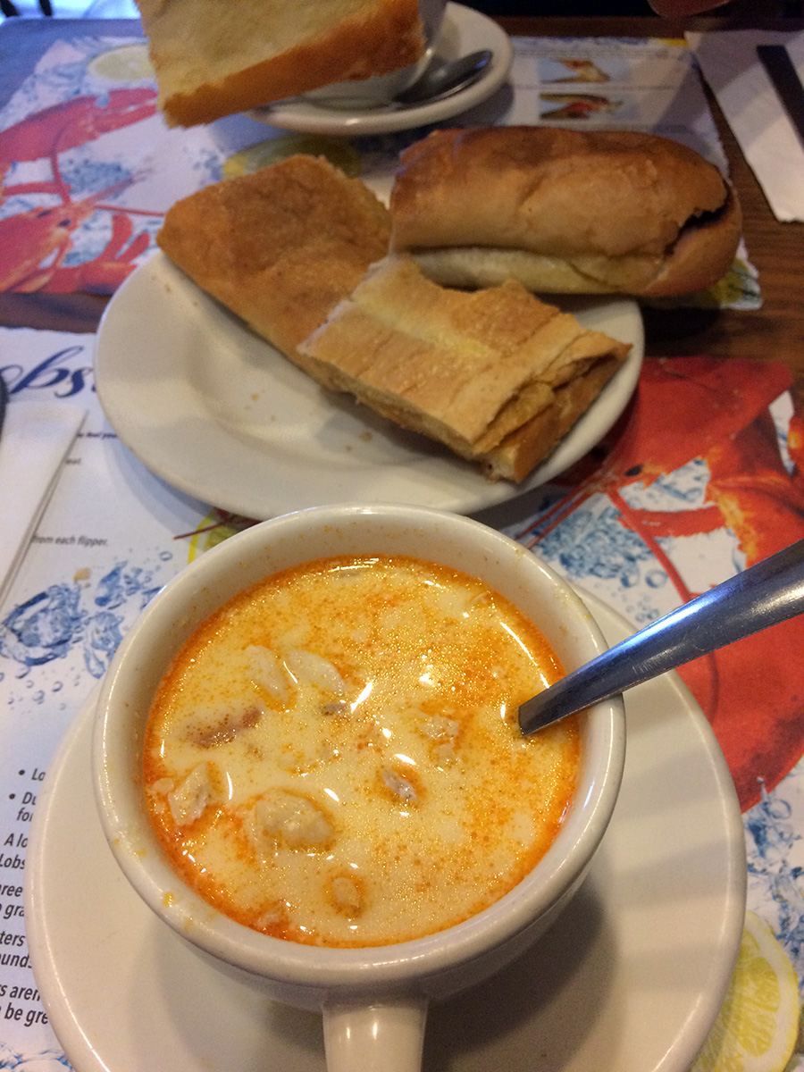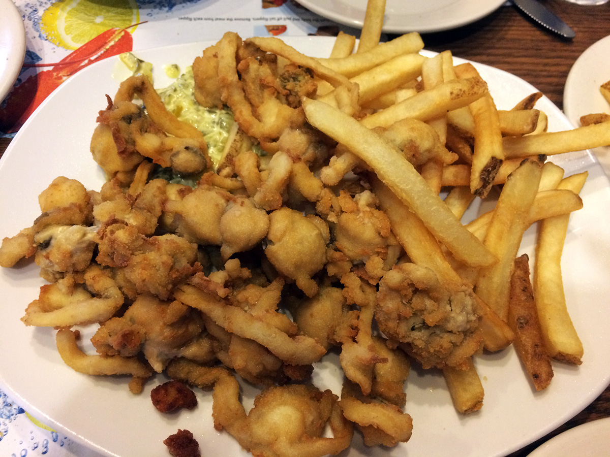 we decided on two cups of seafood chowder ($5/each) and a shared plate of fried clams ($22). nicholas brought out some more garlic bread and gave us an additional plate of complimentary french fries. the chowder was kind of watery, not one of those thick chowders, with bits and pieces of mystery meat from the sea. i even saw some bits of shrimp in my chowder, though it all tasted the same in the end. the clams were good, with medium-sized bellies rich with mollusky flavors, though not as big as the clams my father and i had at the clam box in quincy. the homemade tartar sauce was less tartar and more just mayonnaise and relish. with the chowder, with the bread, with the french fries, and then the fried clams, it was a very filling meal. good thing we were riding back home so we could work off the calories, the only risk being if we even had the energy after eating so much.
