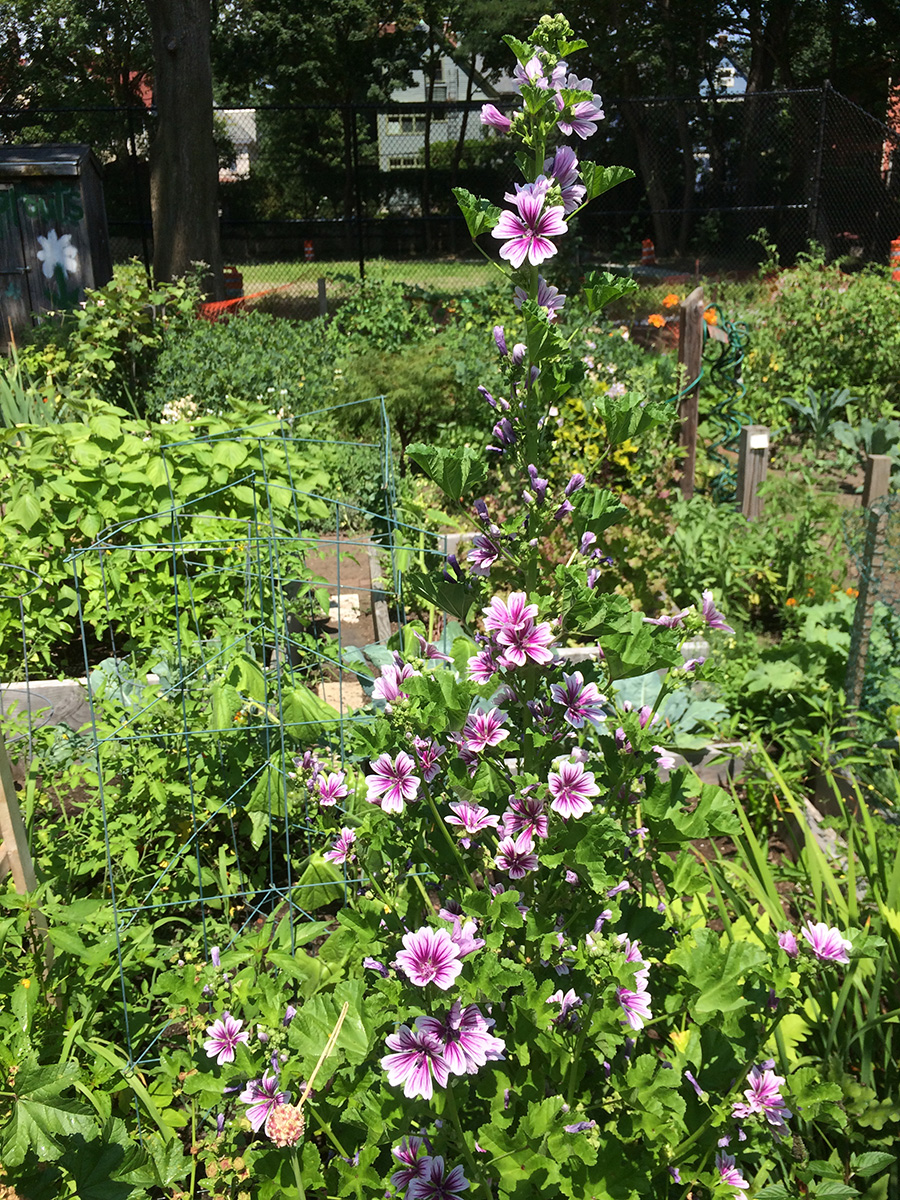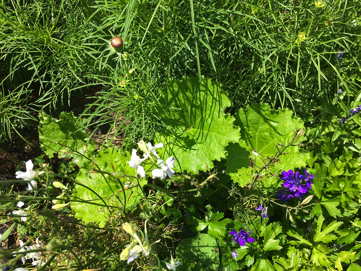 a new flourish of striped mallows were blooming from a plant that has up until now been rather quiet (late bloomer). as for the other mallows, not much flowers on them as they're now making seeds. judging from the amount of seed pods i'm expecting a lot of seeds this season, so expect to see more striped mallows in the future. hidden amongst my larkspurs is a hollyhock plant, a transplant from my old plot. i don't know if i'll see any hollyhock flowers in my plot this year (in belmont they've already finished blooming for the most part), but definitely next season.