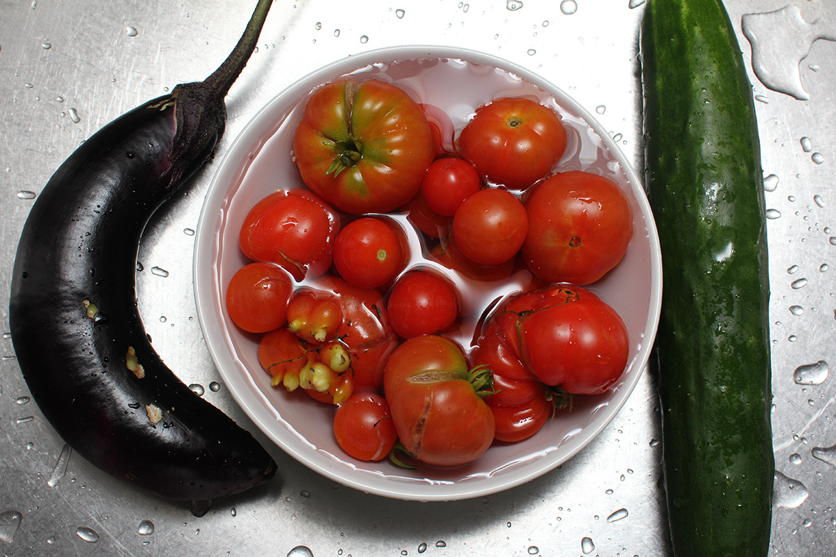 the new fence was up, a far fancier affair compared to the chain-link fence we had before. one issue i noticed right away was the door can no longer swing all the way inside (our previous door had a large gap at the bottom); this is a problem if i want to bring in my bike, so instead i had to swing the door outwards, which was a little awkward. while watering the plot i noticed the new shrink hose had already developed a leak 8-10 feet down from the sprayer. that didn't take long. who the hell is destroying all these hoses? or are they naturally delicate by their very design? i collected some vegetables before a left, a cucumber, an eggplant, and a collection of cherry tomatoes and deformed plum-sized tomatoes. it was a hot and humid day and i was sweat soaked by the time i returned home.