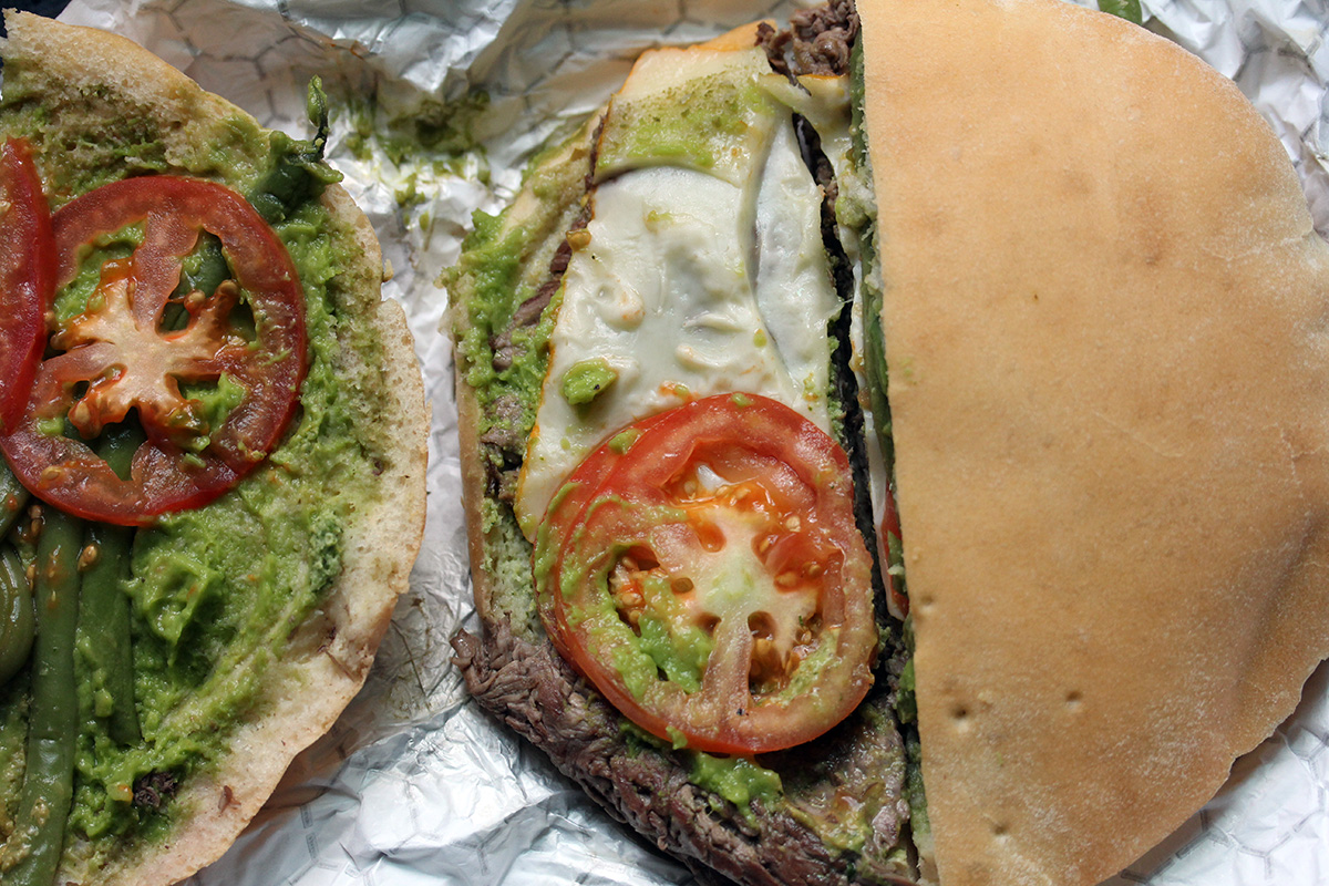 there was a lunchtime line out the door as i waited patiently. once inside, the place had nice air conditioning. the first line was for ordering, followed by a second line for pickup. i got 2 large beef sandwiches ($10/each), one for myself, one for my parents who've never had chacarero before. the order gets transmitted to the cook, who confirms your other (beef or chicken, big or small, mild or spicy). it's all done based on the order your order was made, so if you switch places in line, it messes up their system, which apparently was must've happened, because they gave me a chicken and a beef when i asked for 2 beefs. but i caught the mistake beforehand and they were able to switch the orders around, giving me the right order.