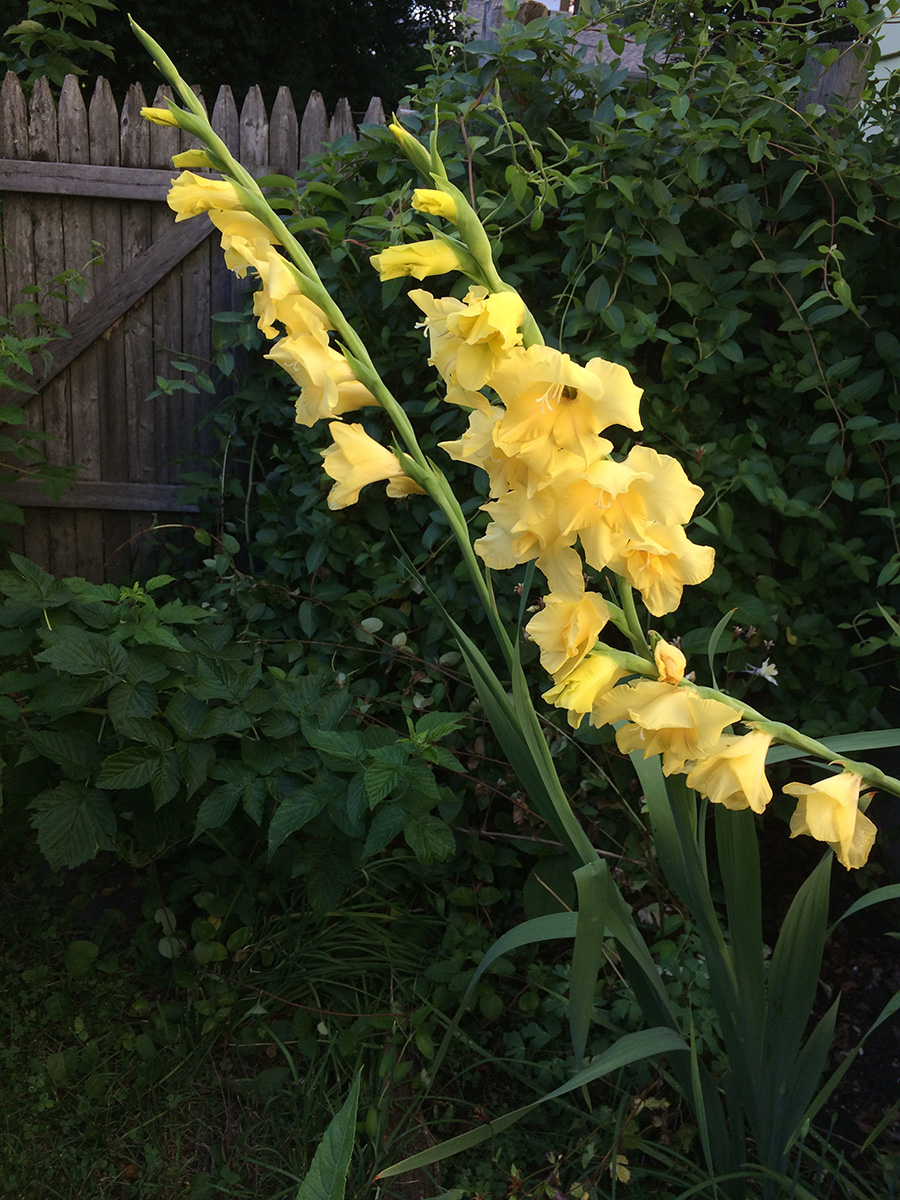 i noticed it a few days ago, but yellow gladiolas have bloomed in the western perennial garden. i completely forgot i had them and had to check my records to remind myself. supposedly they're tender perennials (i.e. you're supposed to dig them up at the end of the season if you want them to survive the winter and replant) but they seem to come back on their own, although i don't remember seeing them last year. this season there was only yellow ones, one of the reds from past photos. they're showy and good for some late season bloom, but i don't like them as they have a tendency to topple over without staking.