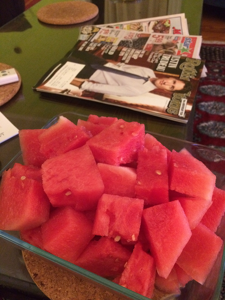 when i returned home i carved up the remaining half of watermelon, splitting it with GC. we watched a few more better call saul episodes before calling it a night.