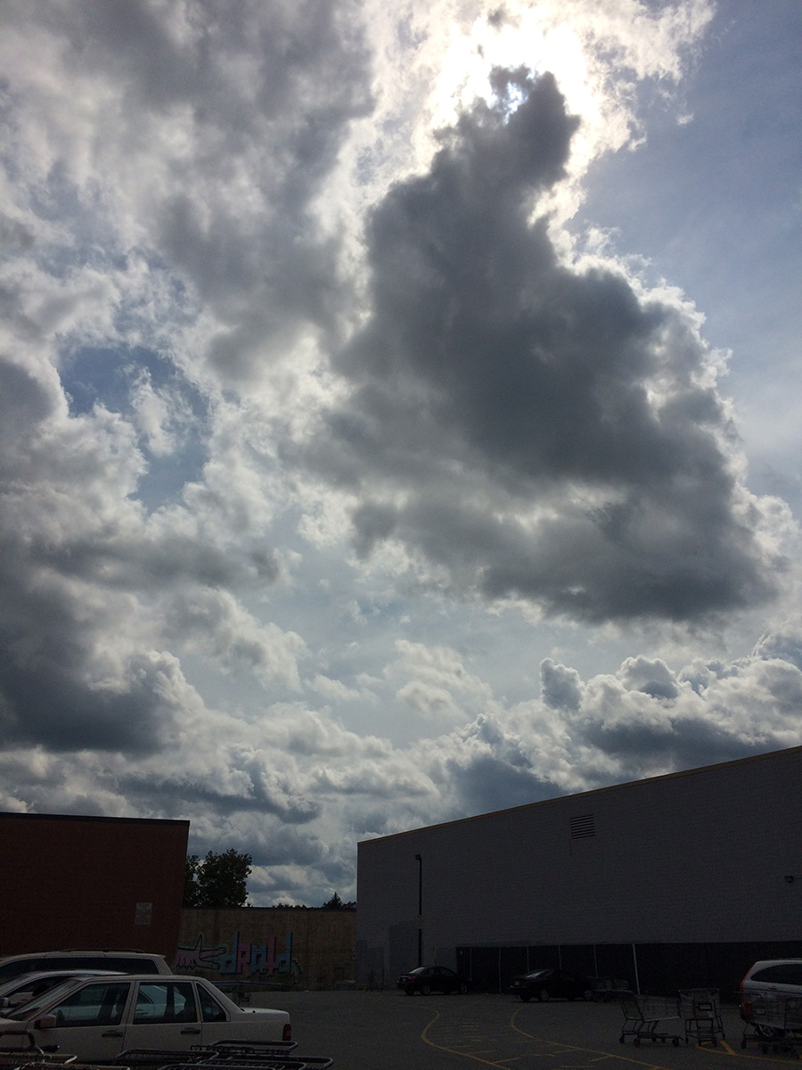 later in the afternoon i biked to market basket on my fuji with my backpack to pick up a few things (kleenex, condensed clam chowder, oyster crackers). the sky was a jumbo of exotic clouds. a rather annoying cyclist was waiting for me to leave so he could lock his bike on the end, when in fact there were plenty of empty spots.
