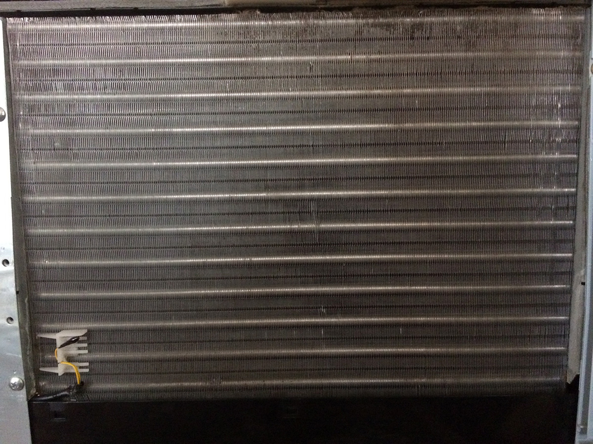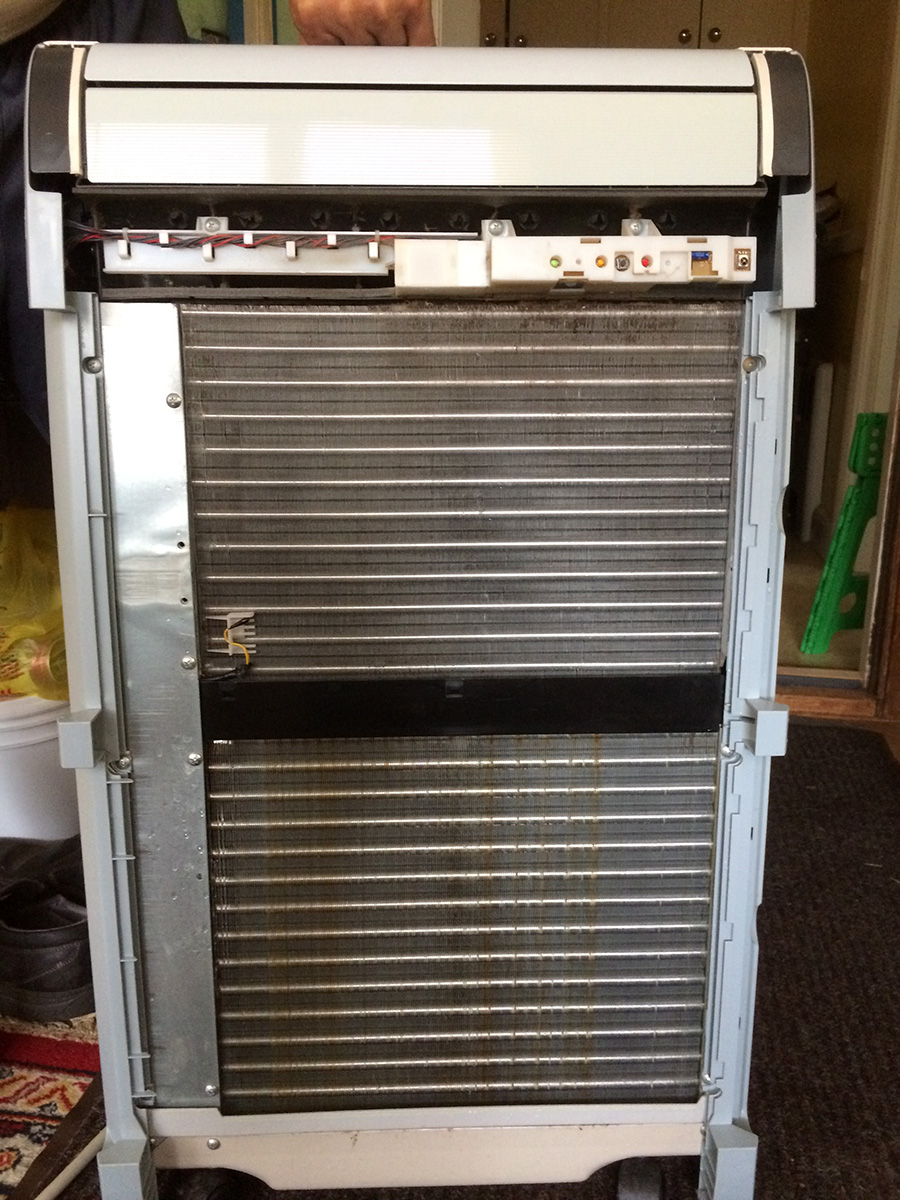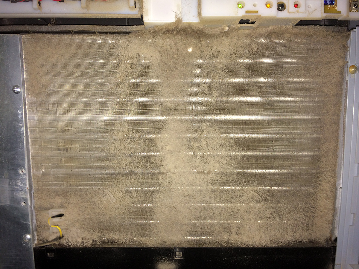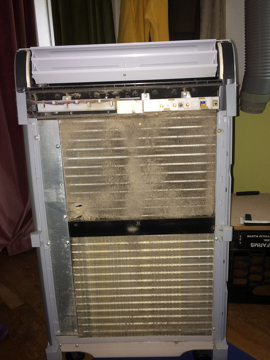 what we saw inside was horrifying: two sets of condenser coils, the one on the bottom didn't look too bad, but the one on top was covered in a thick layer of dust and pet hair. but at least we knew what was making the AC so inefficient. why the top one would be so much dirtier than the bottom one we're not sure. and from this design, it looks like two AC's running every time we power it up, so technically it should be super cool. regardless, cleaning should be easy, or so we thought.