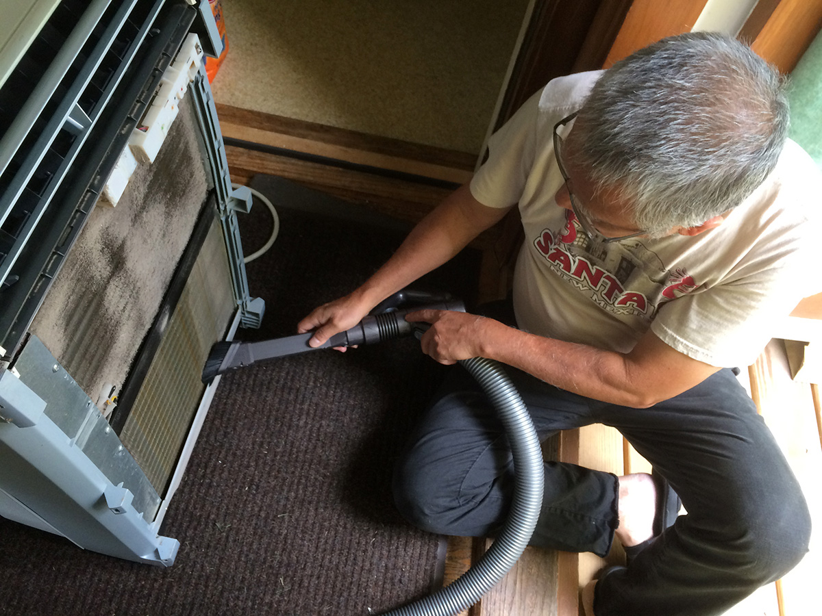 we dragged the AC to the living room and used the dyson vacuum to suck up the dust. none of it was coming off, because apparently there was also grease on the coils and the dust seemed to be glued on. so instead my used a combination of steel brush and plastic brush and gently scrubbed the dust, while i held the vacuum head down below to immediately suck up the debris. that worked well, but my father wanted to clean it even more, so we lifted the AC outside into the backyard so my father could gently scrubbed the coils with a toothbrush and some soapy water.