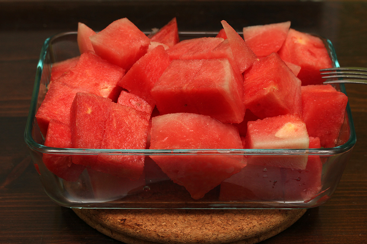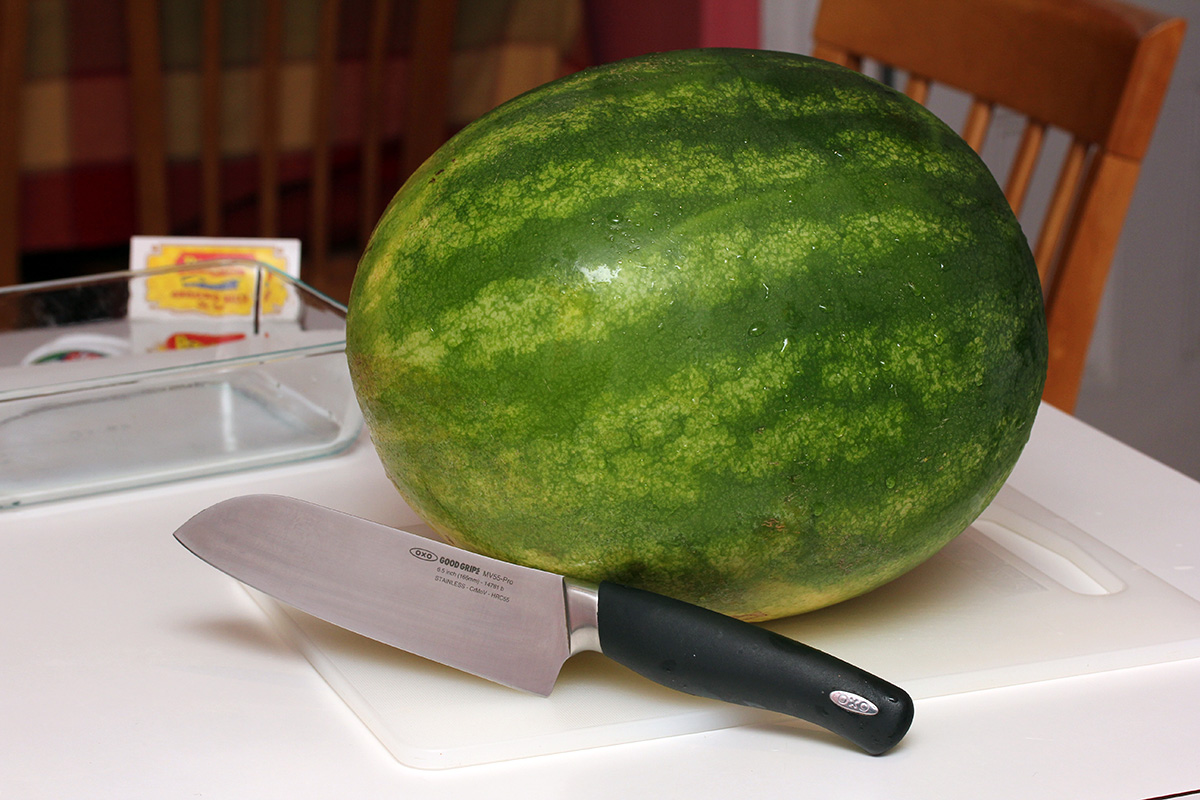 i came home and opened up the watermelon that's been sitting in my fridge since sunday. i'm starting to get better at taking apart a watermelon the more i do it. it cut it into quarters then cut the quarter into cubes. at any one time i can only eat about a quarter of a large watermelon.