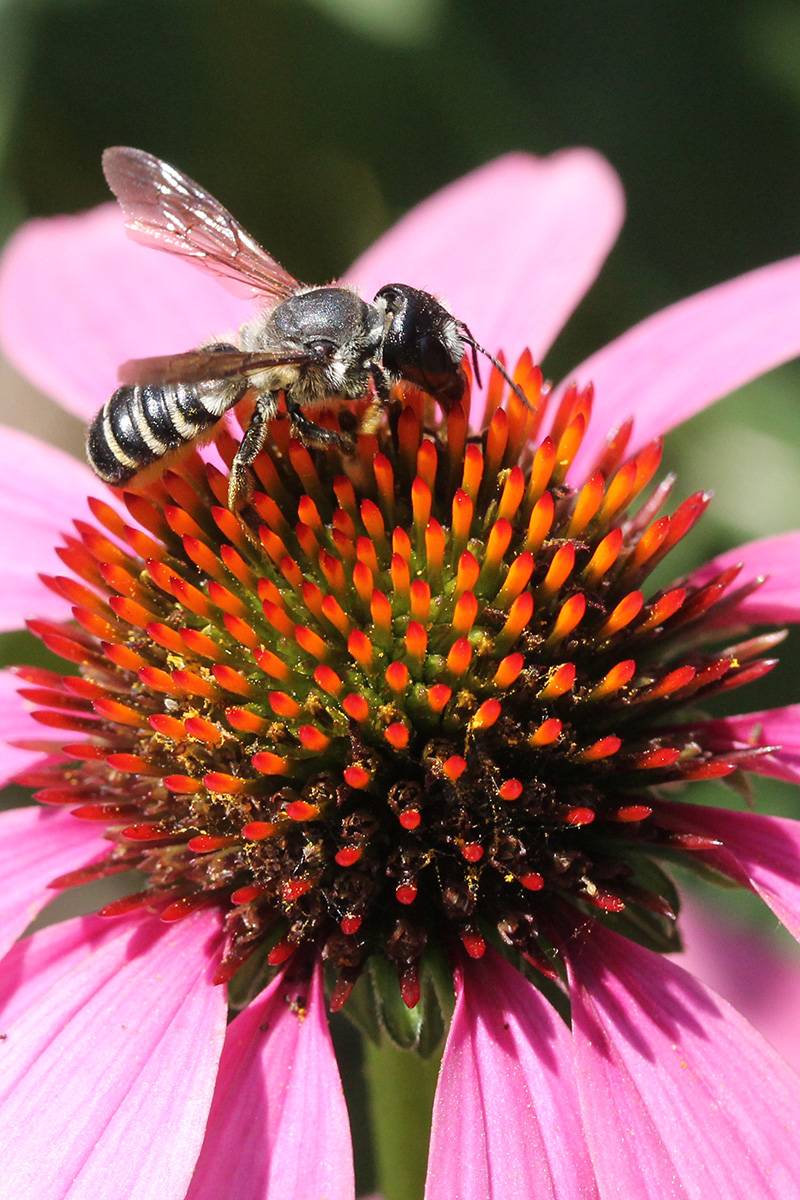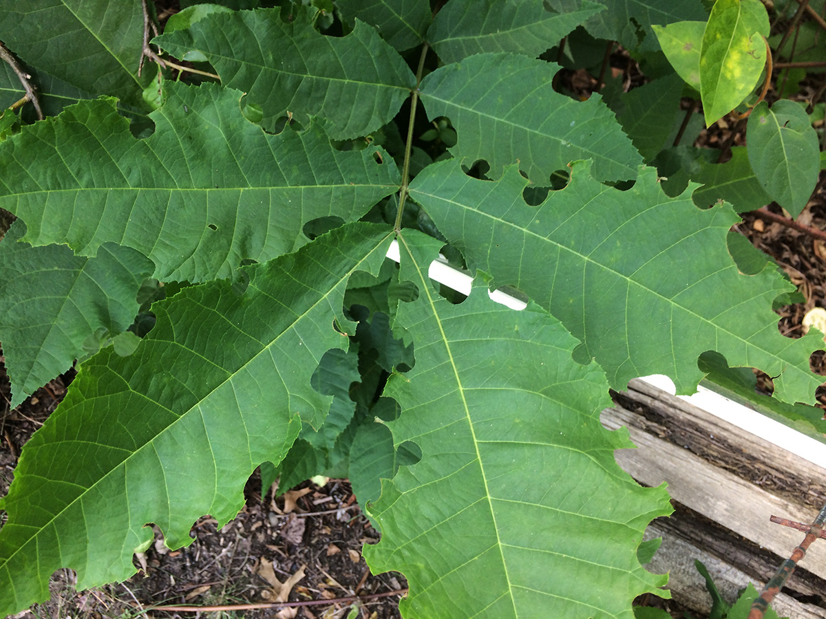 while watering the plants in my parents' backyard, i noticed holes cut out from the edges of large chestnut sapling leaves. there's only one critter in the area that would do that: leafcutter bees! maybe they're using the makeshift solitary bee homes i made a while back with leftover bamboo stalks. i checked the cans but didn't see any activities.