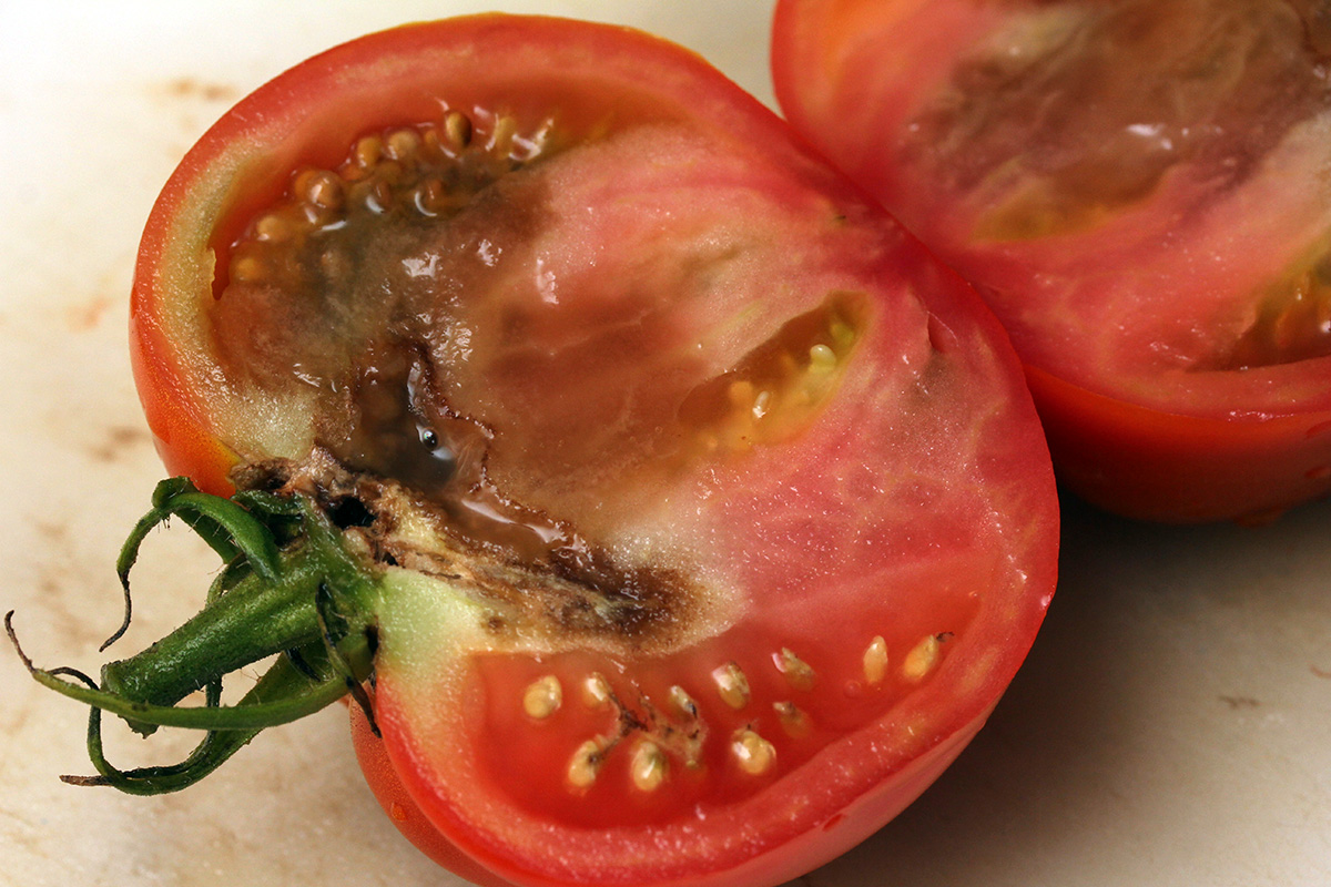 i picked off a medium-sized tomato that had a bit of soft rot on one side, but i figured the other side should still be good to eat. it looked like some form of blight, but when i sliced the tomato in half, it was rotten all the way through. and i'm not sure if it's blight or maybe damaged caused initially by an insect because i thought i saw a hole coming in from the stem.