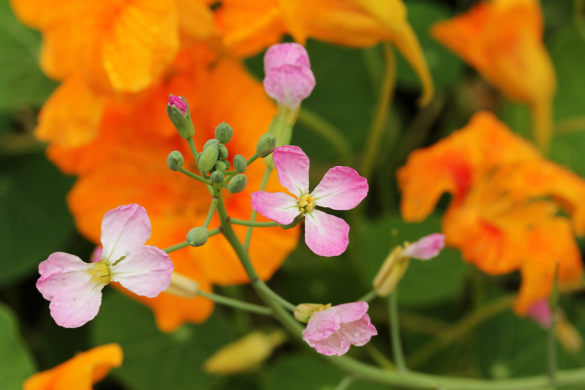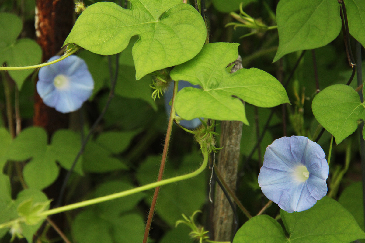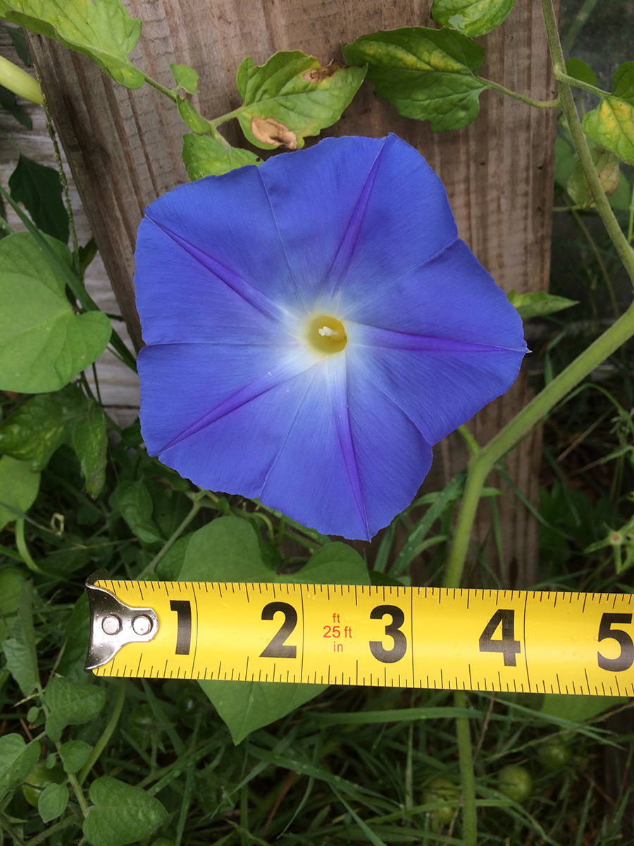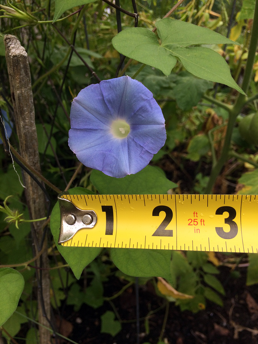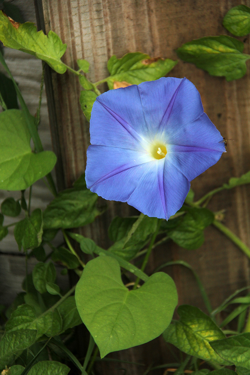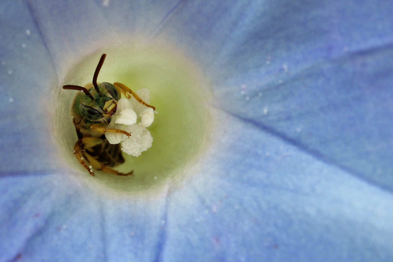 hailey woke up me again at 8am. i thought maybe she needed to use the bathroom again so i let her out, following her this time. i saw some things in the garden that i almost never see: morning glories! they're called morning glory for a reason, since they only open in the mornings then fade by noontime. as i'm never in belmont that early, i took the opportunity to snap some photos. there are two kinds, domesticated 'heavenly blue' with large 4" flowers, and wild morning glories (non-heart-shaped leaves) with small 1-1/2" flowers. there was also a wet metallic green sweat bee "sleeping" in one of the wild morning glory flowers that i hauled out the tripod so i could take some better photos.