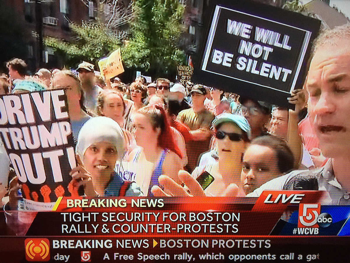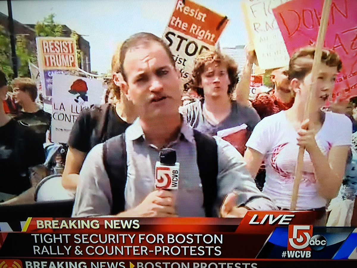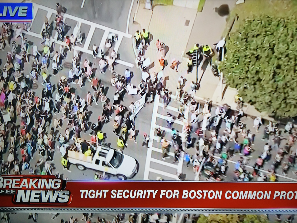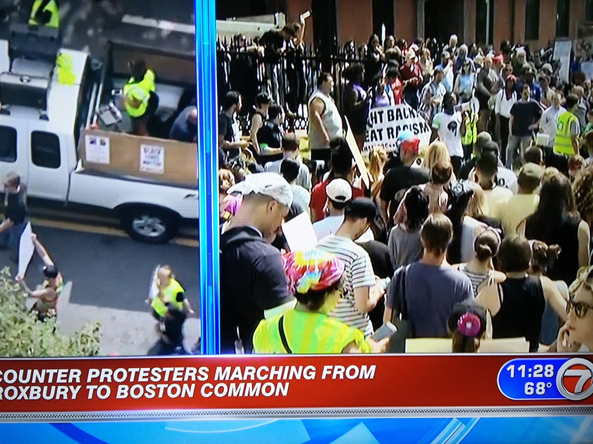 beginning in the late morning, local networks began televising from boston, where counterprotesters were marching against a "free speech" rally on boston common. there seemed be like only a dozen participants in the nationalist rally, compared to the tens of thousands of protesters marching in the street from dorchester 2 miles away into boston.