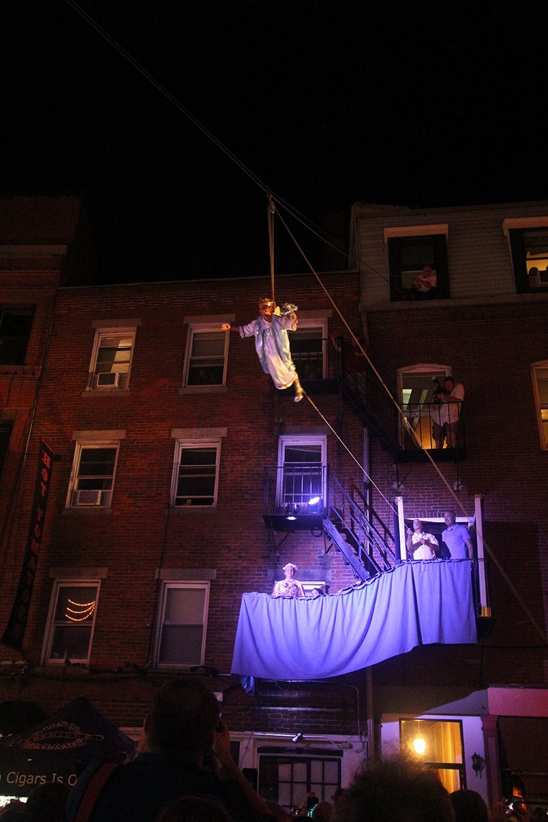 around 8pm they shined spotlights on opposite balconies where 2 side angels would be giving a speech in italian. however, they didn't start until 9pm. 8 minutes later the flying angel presented herself, "flying" from the balcony to the madonna shrine which had arrived before the ceremony.