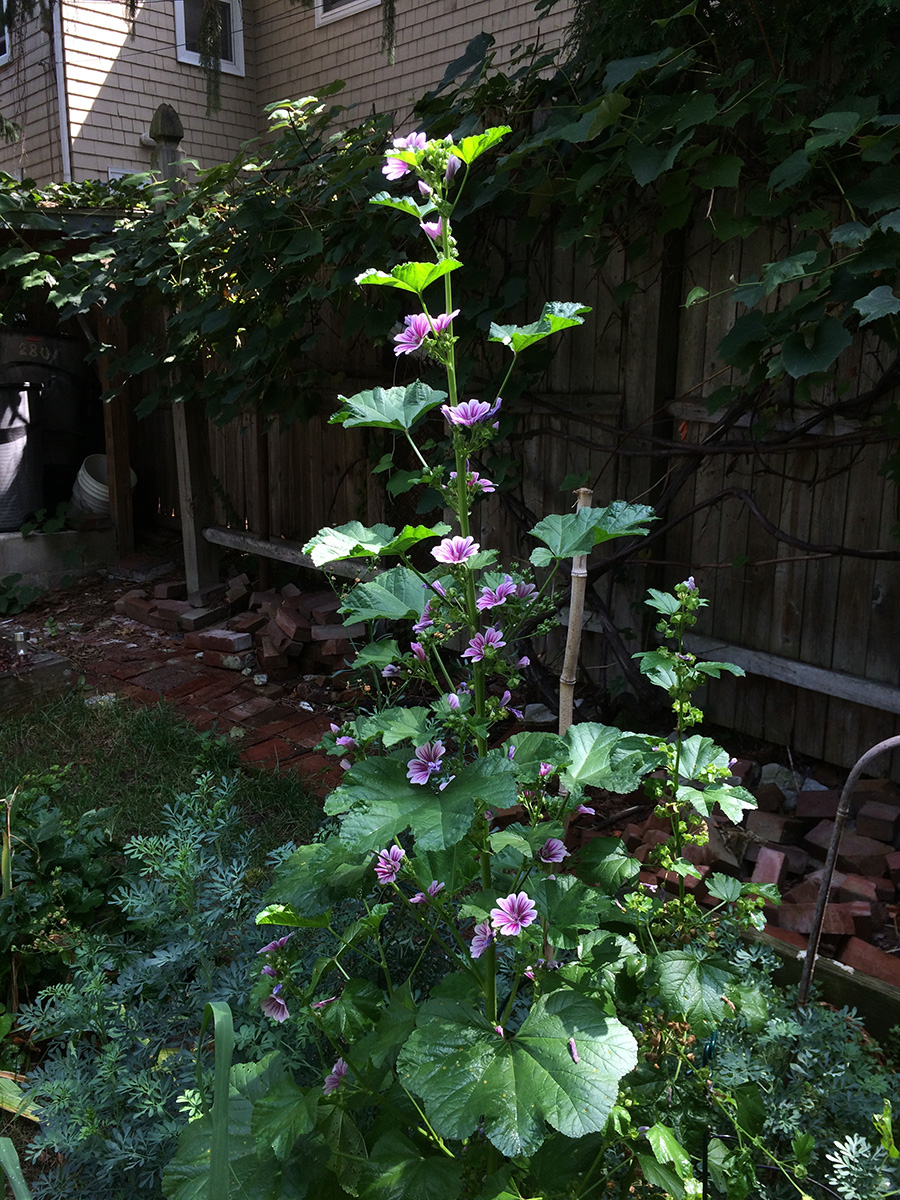 next i went to the cafe to bring in the empty trash bins and water my sister's backyard garden as well. my 2nd aunt greeted me at the shop, didn't notice my new haircut, but instead complained about her swollen itchy eye. my sister's garden doesn't get a whole lot of sunlight, but what limited amount she does have she's managed to grow a lot of plants. i was happy to see the striped mallow seedlings i gave her a few months ago were doing well; hopefully it will reseed and there will be plenty more to come next season.