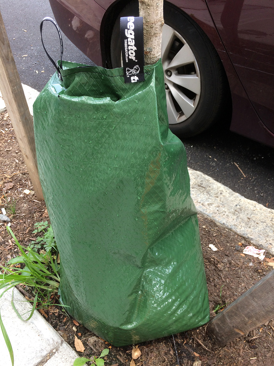 afterwards i filled the treegator bags of the 4 newly-planted trees along the sidewalk. each gator can hold 15 gallons of water, which would take nearly 4 trips with the large rubber flexible watering bucket. i only managed to make 2 trips for the first 2 trees; the other 2 were closer to a faucet and i managed to fill each of them three times. i noticed the one bag outside the florist has a small hole in it, which leaked water. i'll need to patch it up at some point. treegators are actually kind of expensive, around $25 a bag.