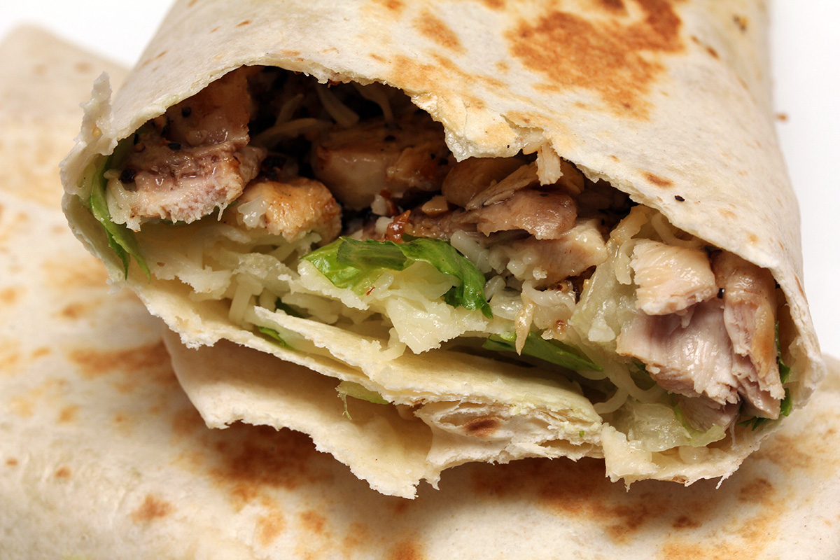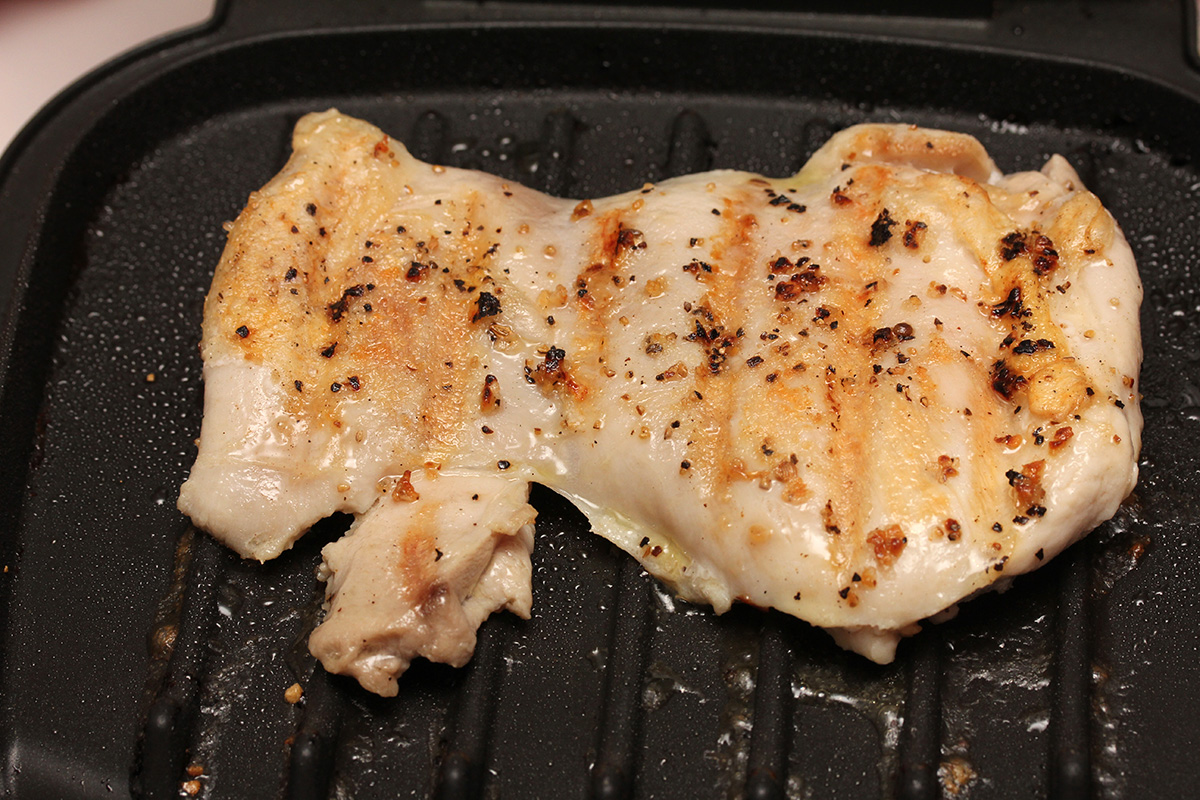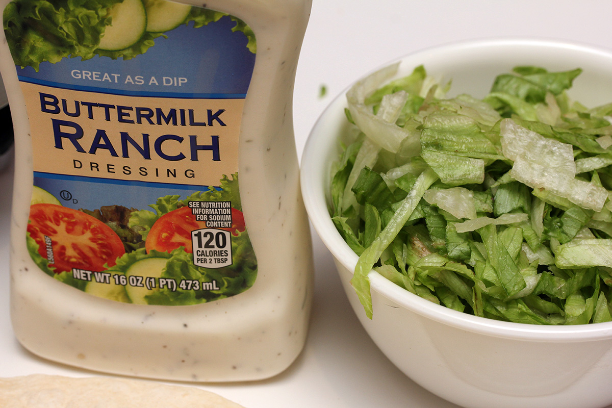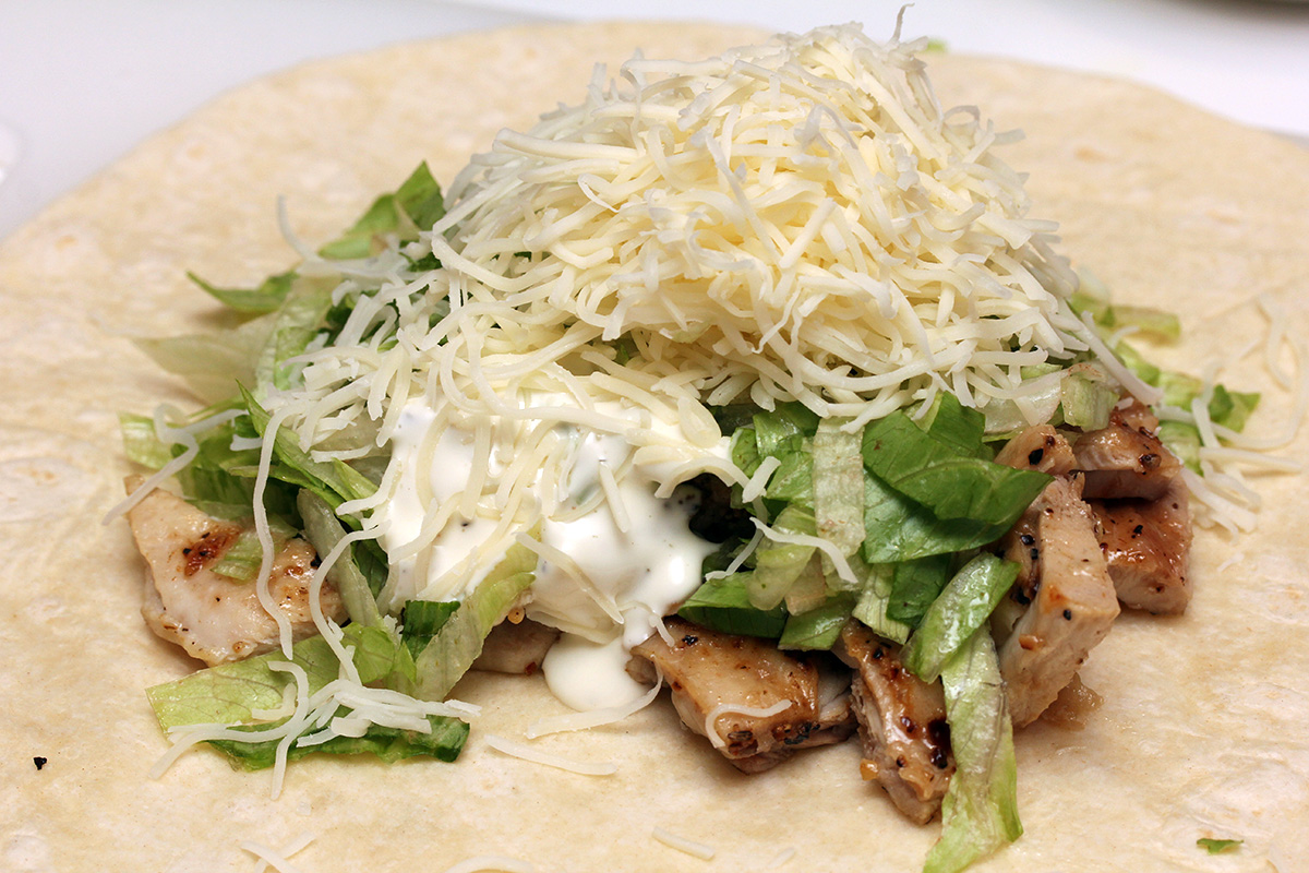 i started preparing the chicken burrito wraps around 8pm. first i pounded the boneless skinless chicken thighs and seasoned them in olive oil, salt, montreal steak spice, and some fresh ground pepper. i then grilled the chicken on the foreman. i used 10" tortillas, adding the chopped chicken, a handful of chopped lettuce, a tablespoon of ranch dressing, and 2 tablespoon of italian cheese blend.
