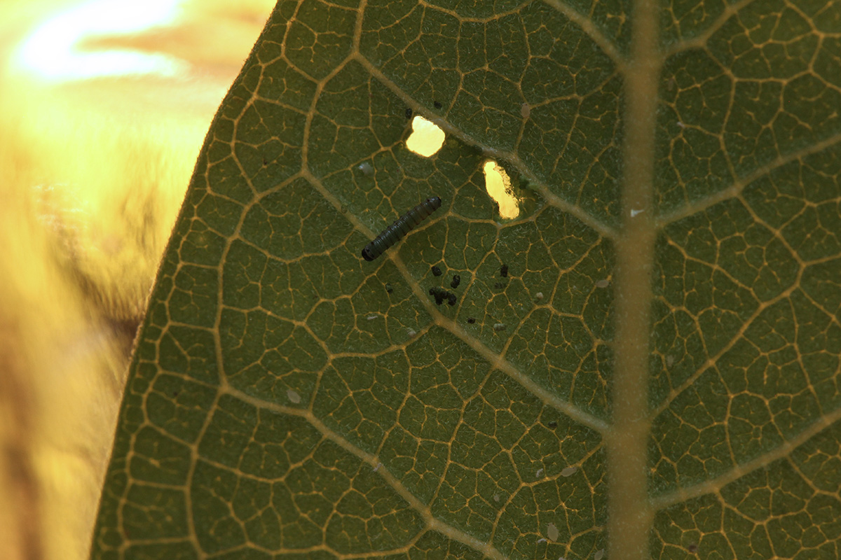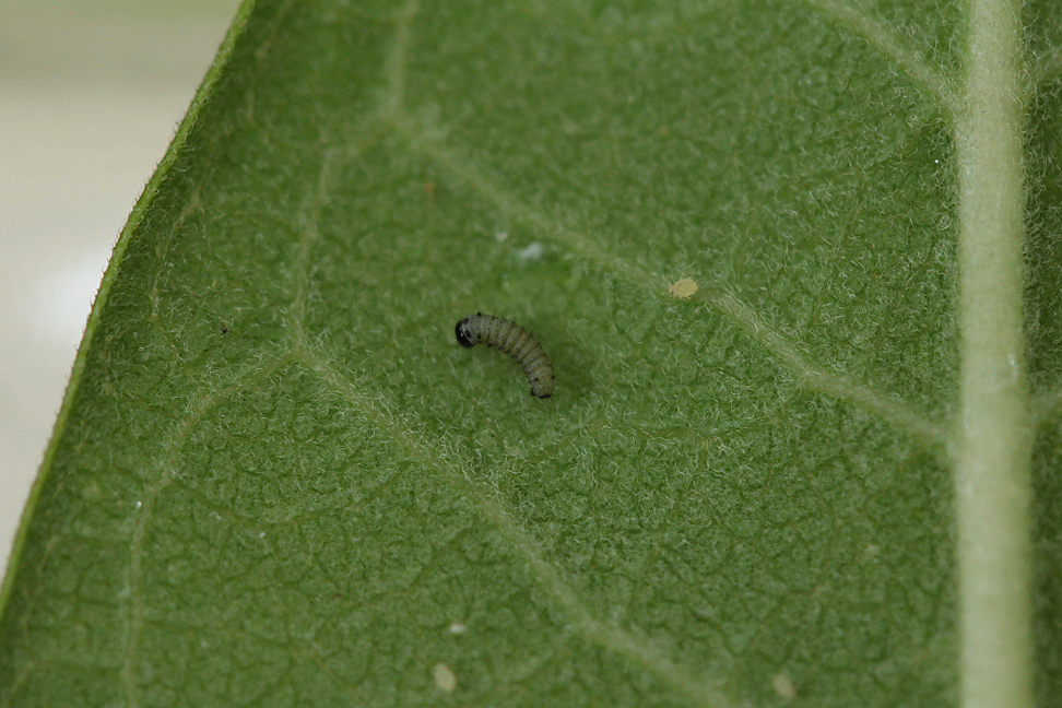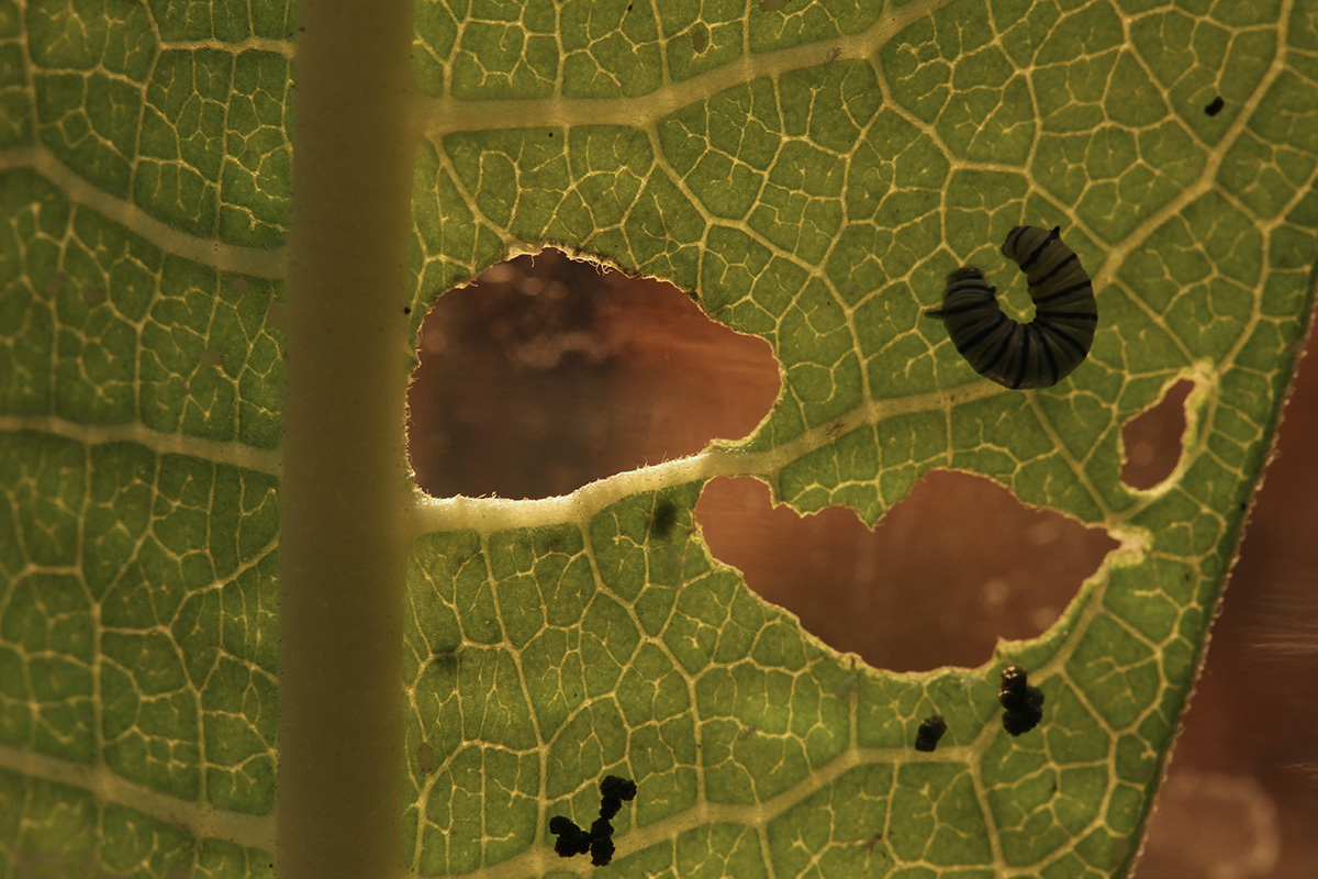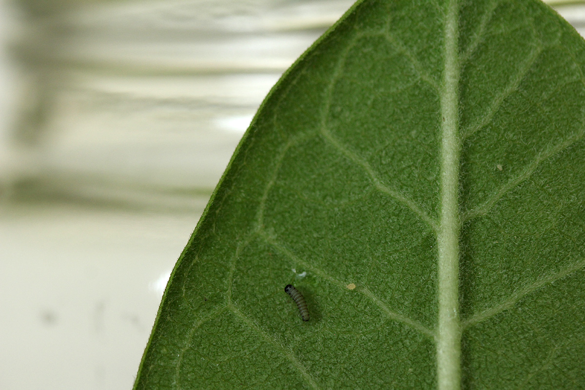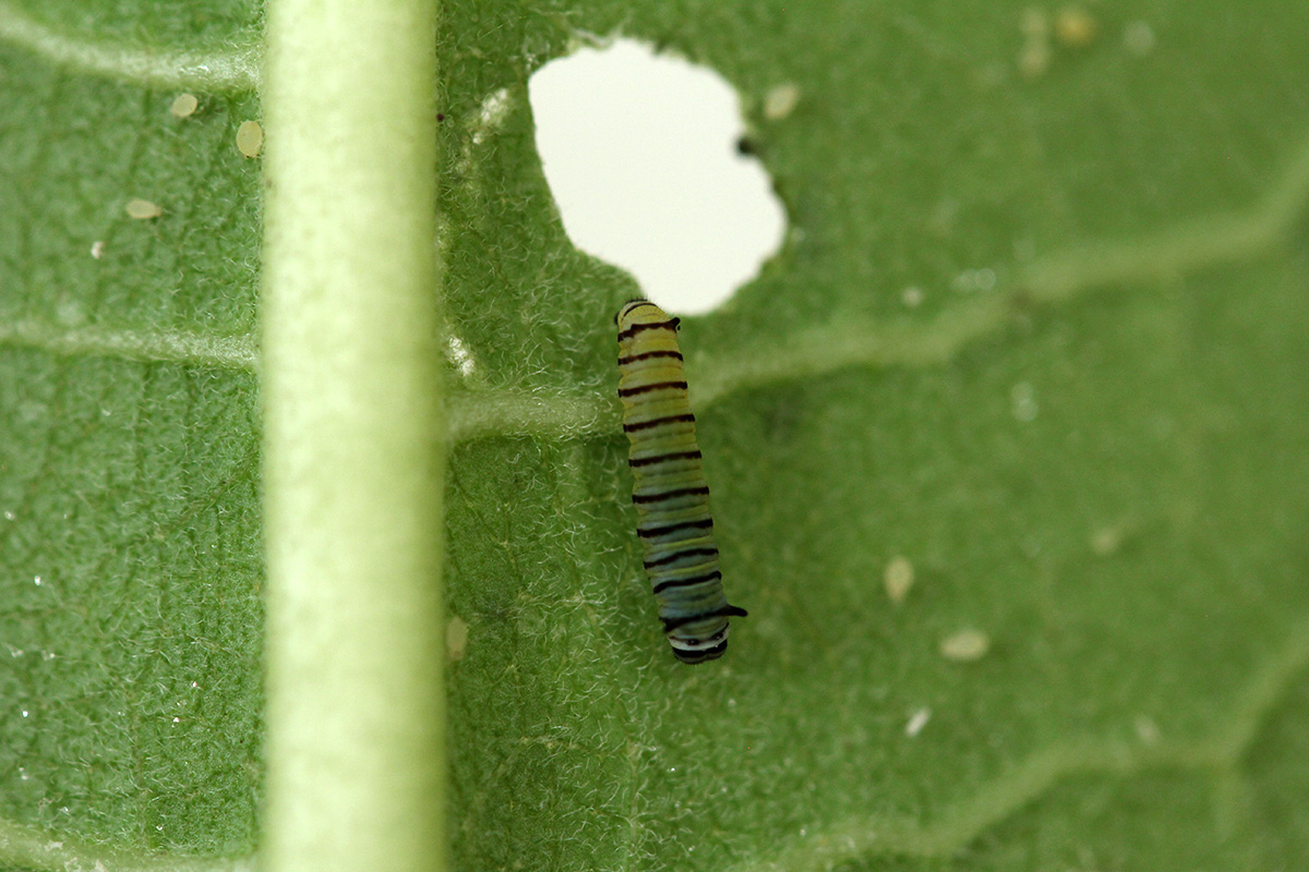 that monarch caterpillar that suddenly stopped eating yesterday and crawled to the center of the leaf? definitely a molt, because this morning it was back to eating again, with a different look than before, more monarch caterpillar and less nondescript worm. the other monarch egg has also hatched, producing a tiny caterpillar. the first thing the caterpillar eats is the egg case. the two caterpillars are a few days apart in birth, and most likely from different monarchs. bruce was thinking these might be 4th generation since we found so many eggs; these will become the butterflies that fly down to warm mexico to spend the winter.