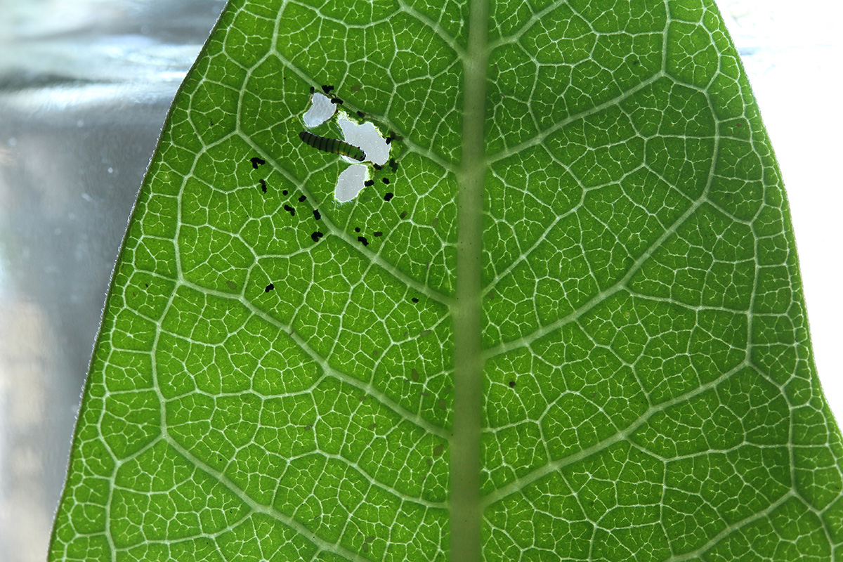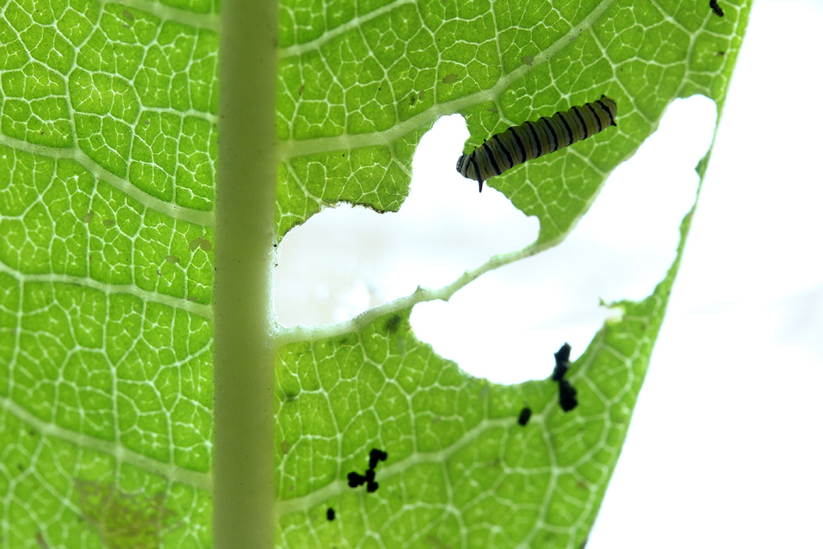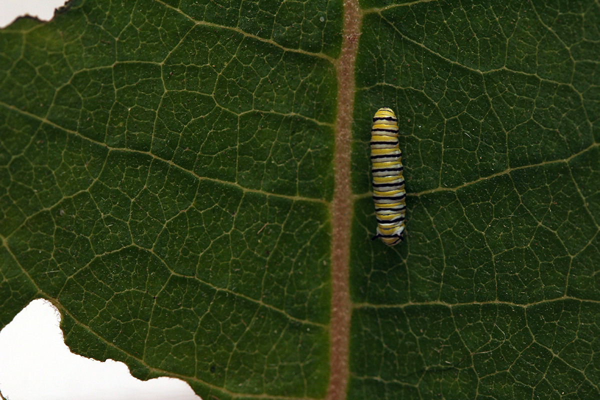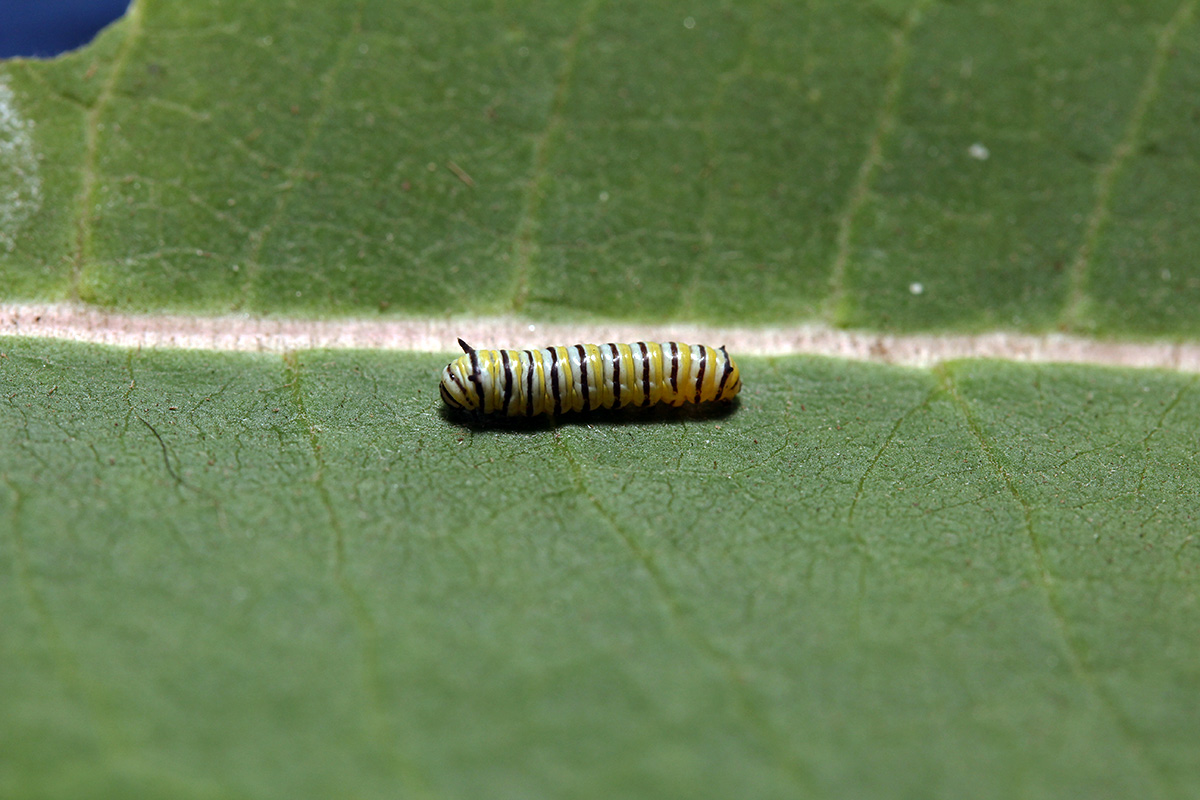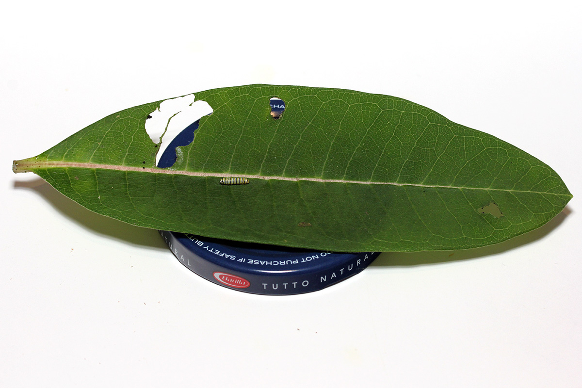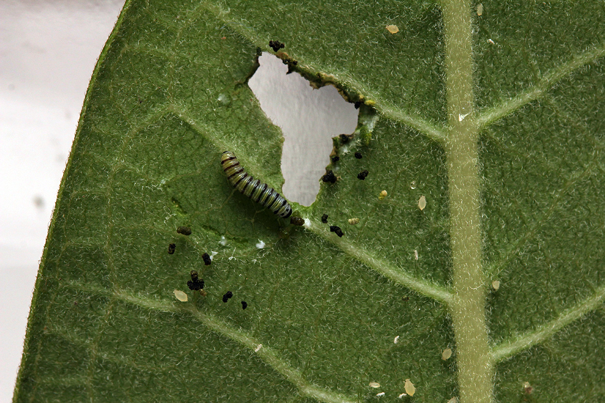 monarch caterpillars continue to feed. one thing i've noticed is that there are also some aphids living on the milkweed leaf as well. so far they're not a problem, but aphids can breed asexually and just one can lead to a bunch in a short amount of time. i'll have to keep an eye on them.