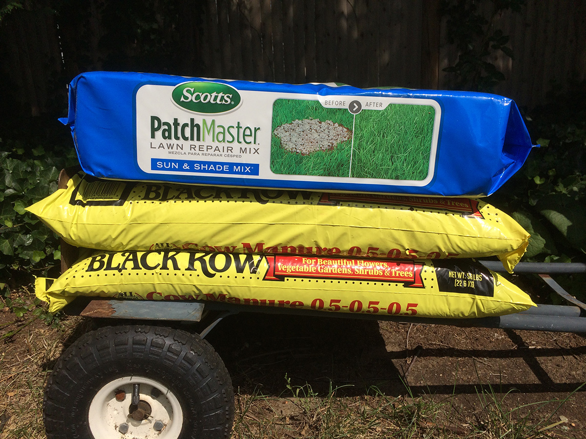 grass seed can be pretty expensive, especially these new fancy formulation that also includes water absorbing material and fertilizer. i ended up getting a 14.25 lbs. bundle of scotts patchmaster for $25. two additional 50 lbs. bags of manure set me back $5/each. i also bought 2 bottles of bonine stump remover ($7/each).