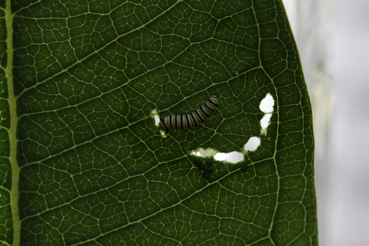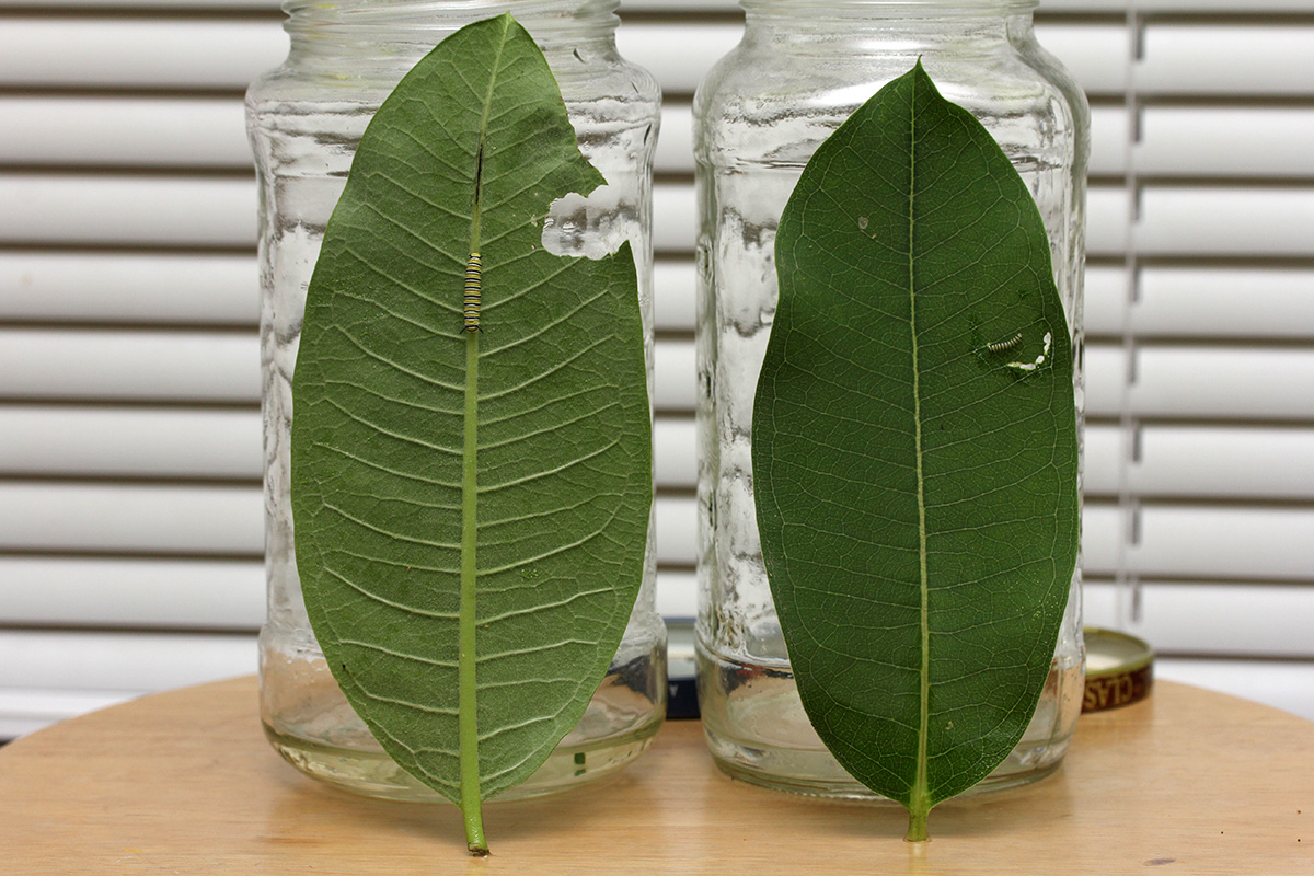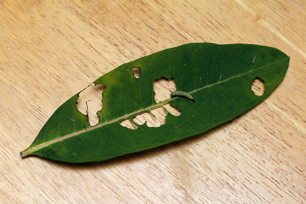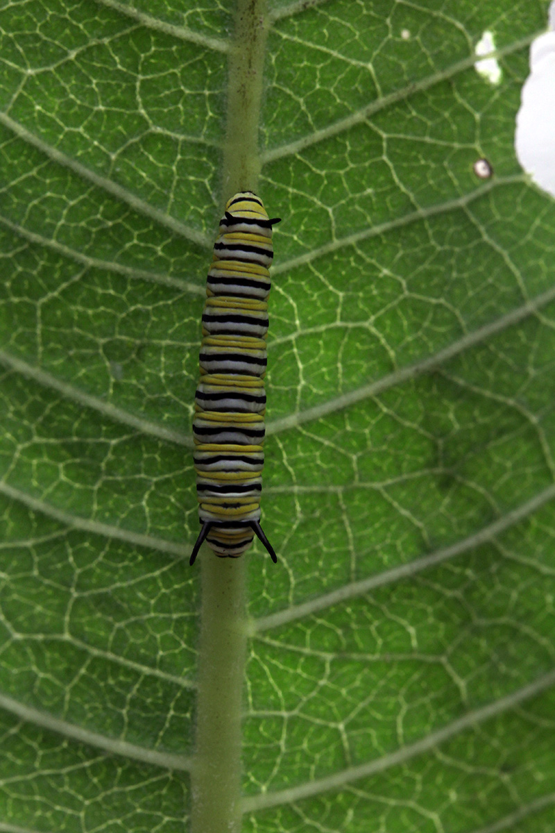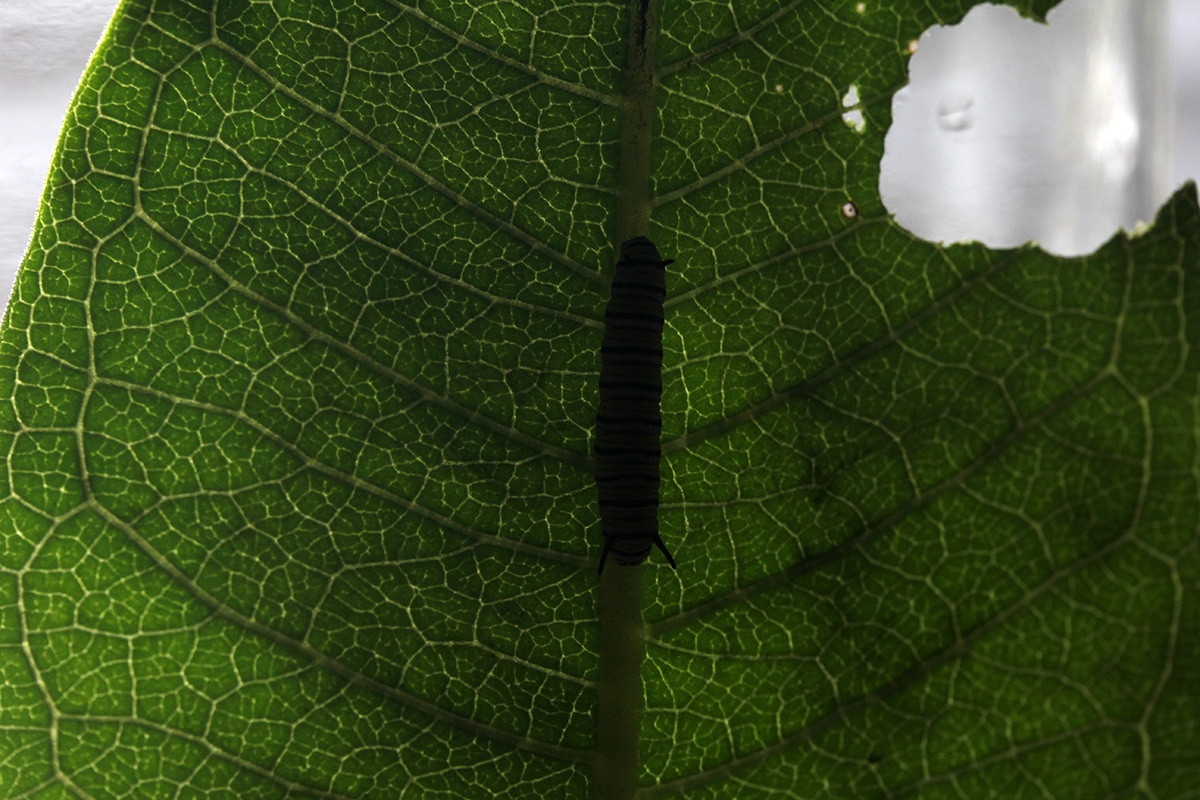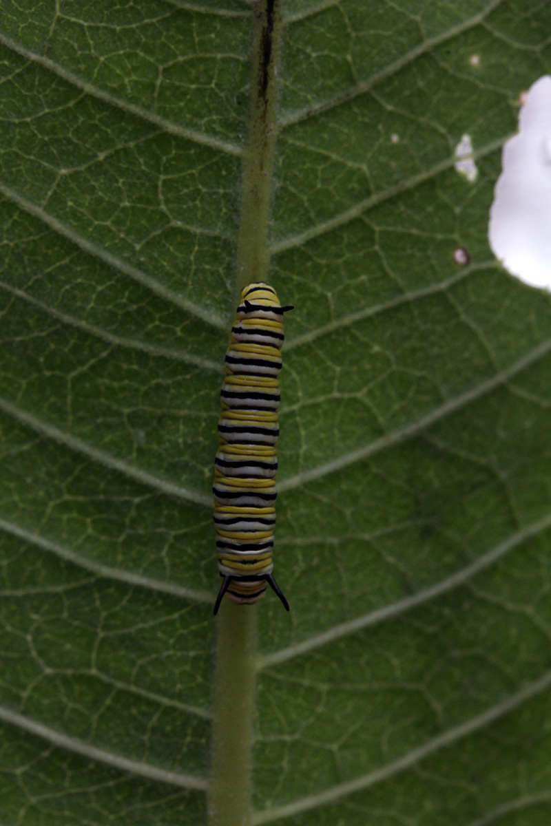 i came home to find both monarch caterpillars had been feeding on their respective belmont milkweed leaf. catone (3rd instar) managed to eat out a big chunk from the side, while cattwo (2nd instar) a discreet arch. both caterpillars began eating about where i put them on the new leaf, weren't picky as to where to eat. cattwo was still busy feeding while catone had once again stopped for the night and crawled to the center of the leaf to rest.