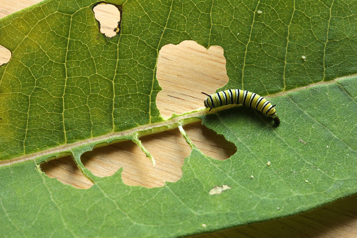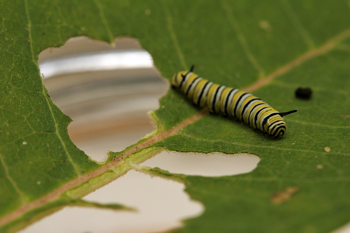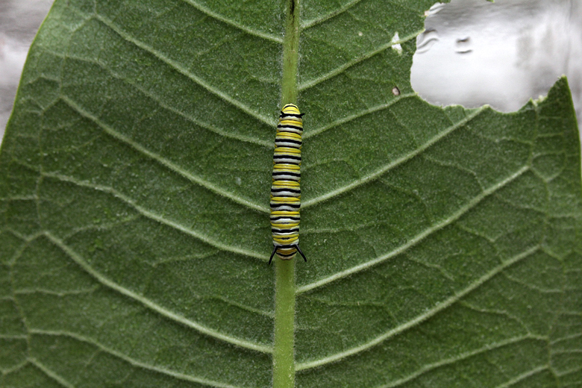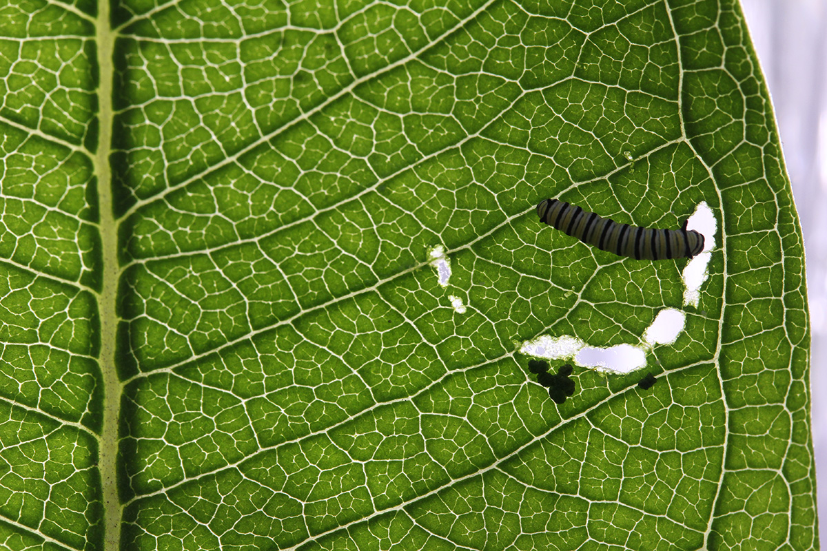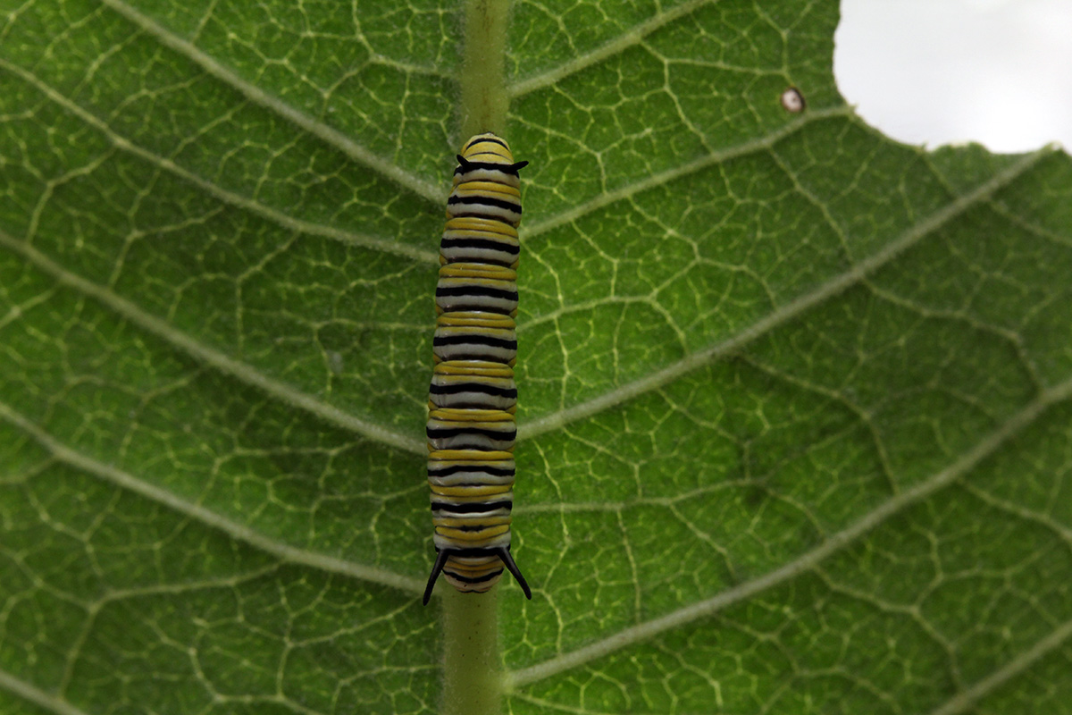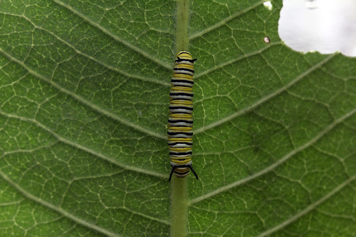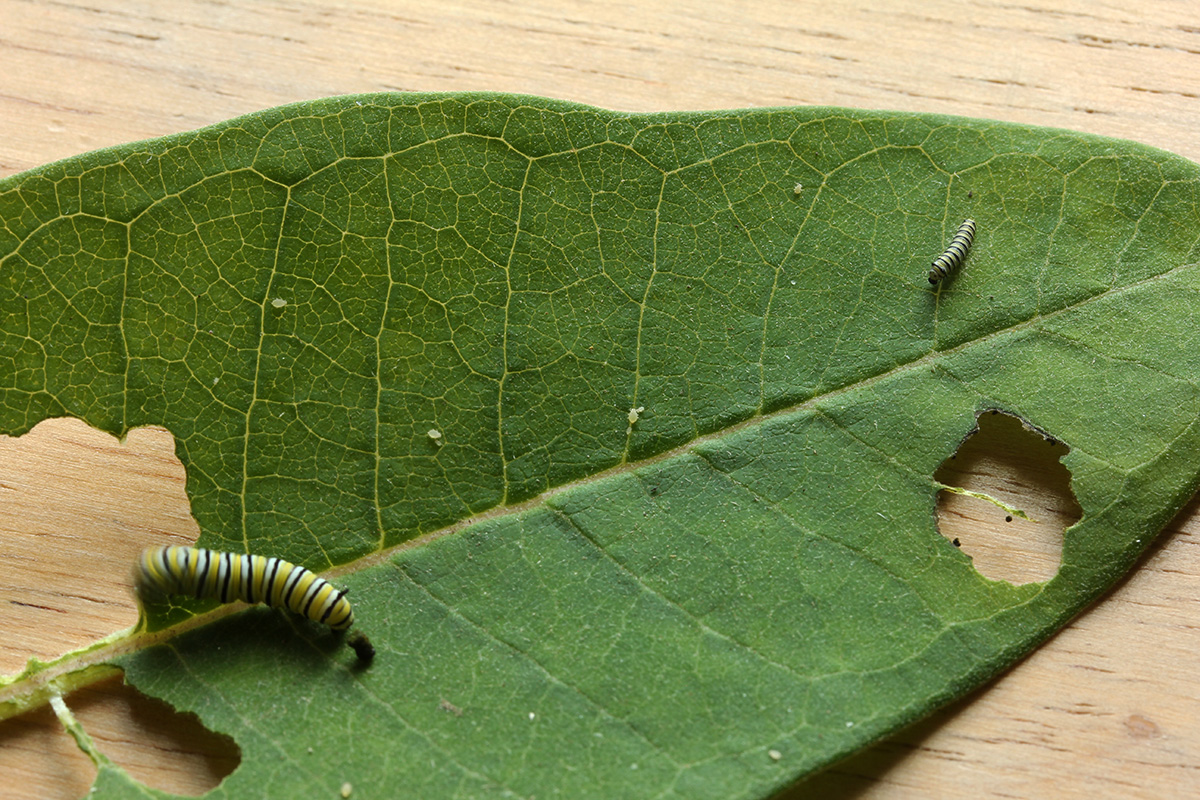 i came home to find both monarch caterpillars had been feeding on their respective belmont milkweed leaf. catone (3rd instar) managed to eat out a big chunk from the side, while cattwo (2nd instar) a discreet arch. both caterpillars began eating about where i put them on the new leaf, weren't picky as to where to eat. cattwo was still busy feeding while catone had once again stopped for the night and crawled to the center of the leaf to rest.