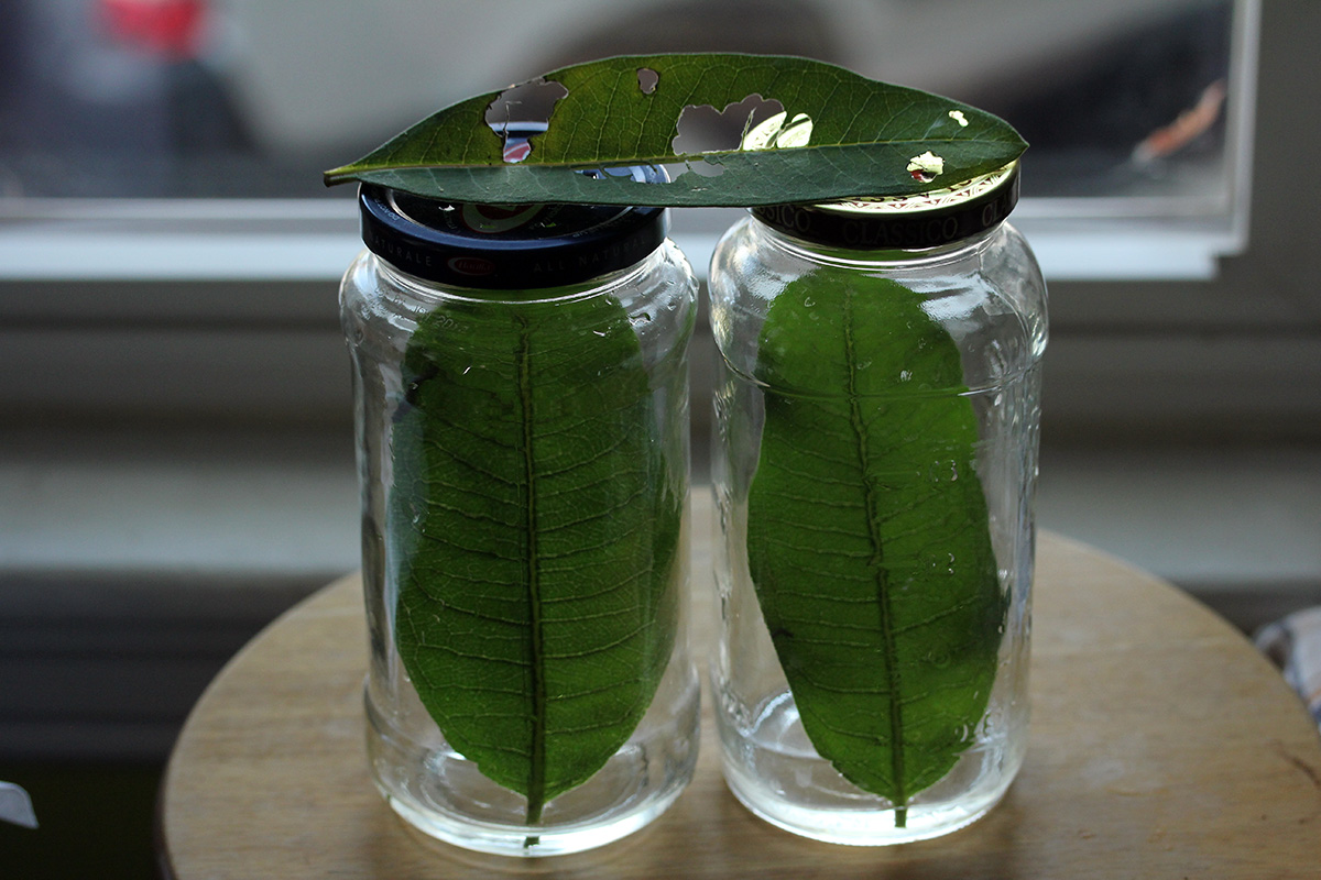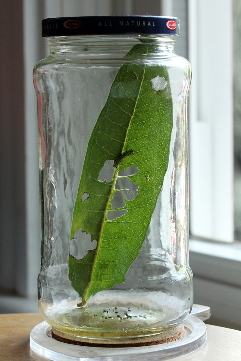 while catone (3rd instar) was busy feeding this morning, cattwo (1st instar) was still molting into its next instar. i was afraid that catone would eat so much that it was accidentally eat the still-molting cattwo as well, especially now that catone was feeding closer and closer to cattwo. a leaf change would be in order once cattwo finished its molt.