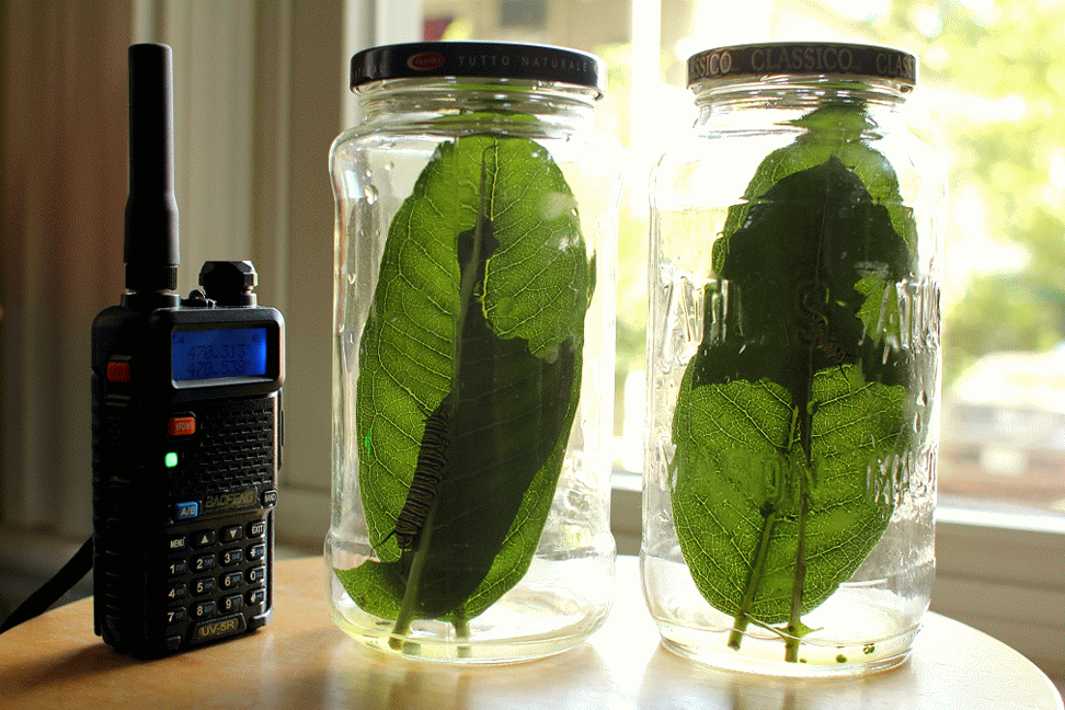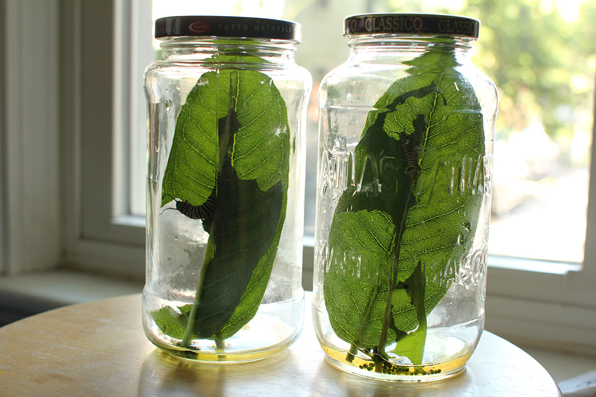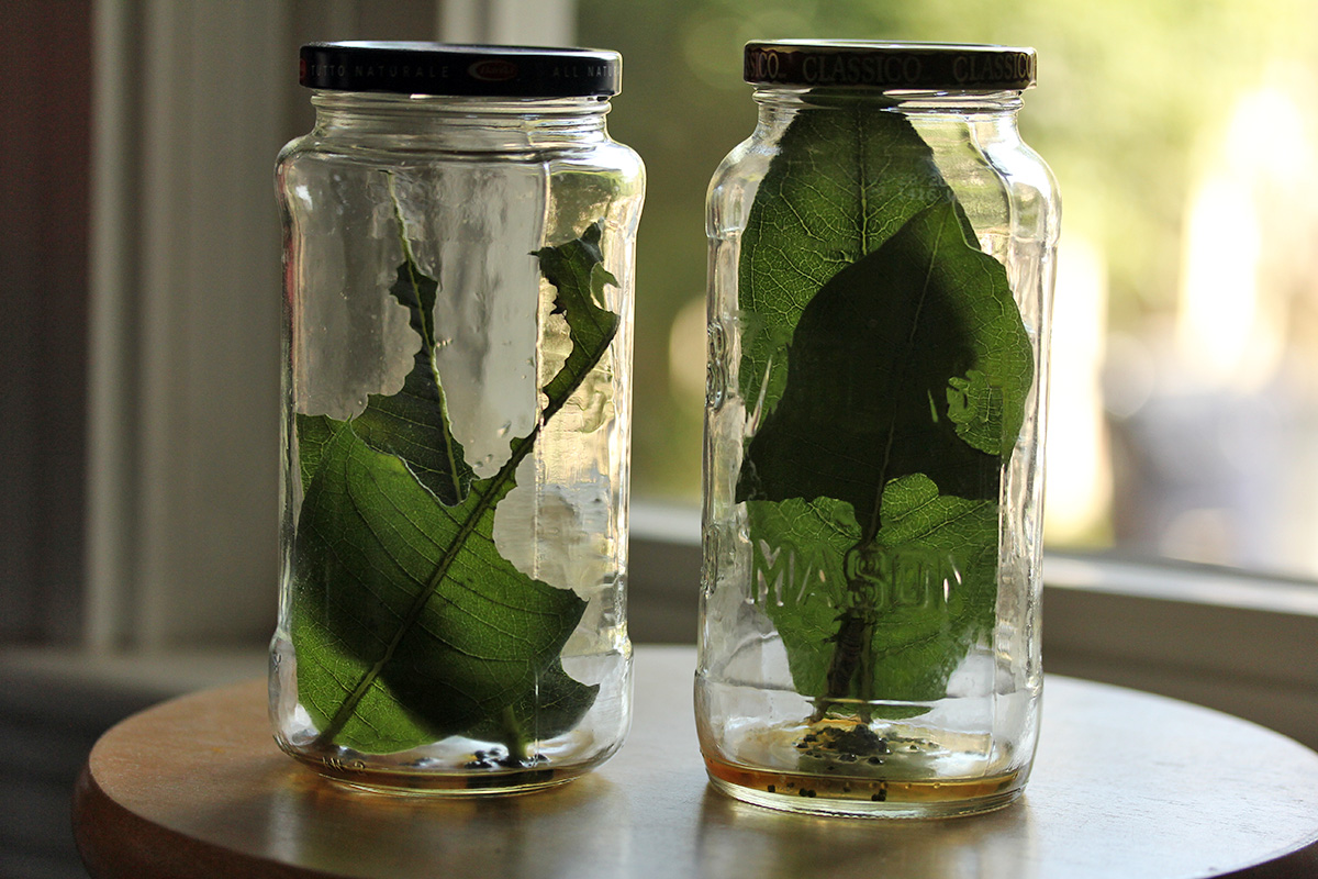 4:30pm i took another snapshot of the caterpillar jars. catone seemed to have completely ignored the old leaf and began feeding on the fresh new leaf. cattwo wasn't as wasteful, eating the first leaf so that it was nearly just a stem before moving onto the new leaf.