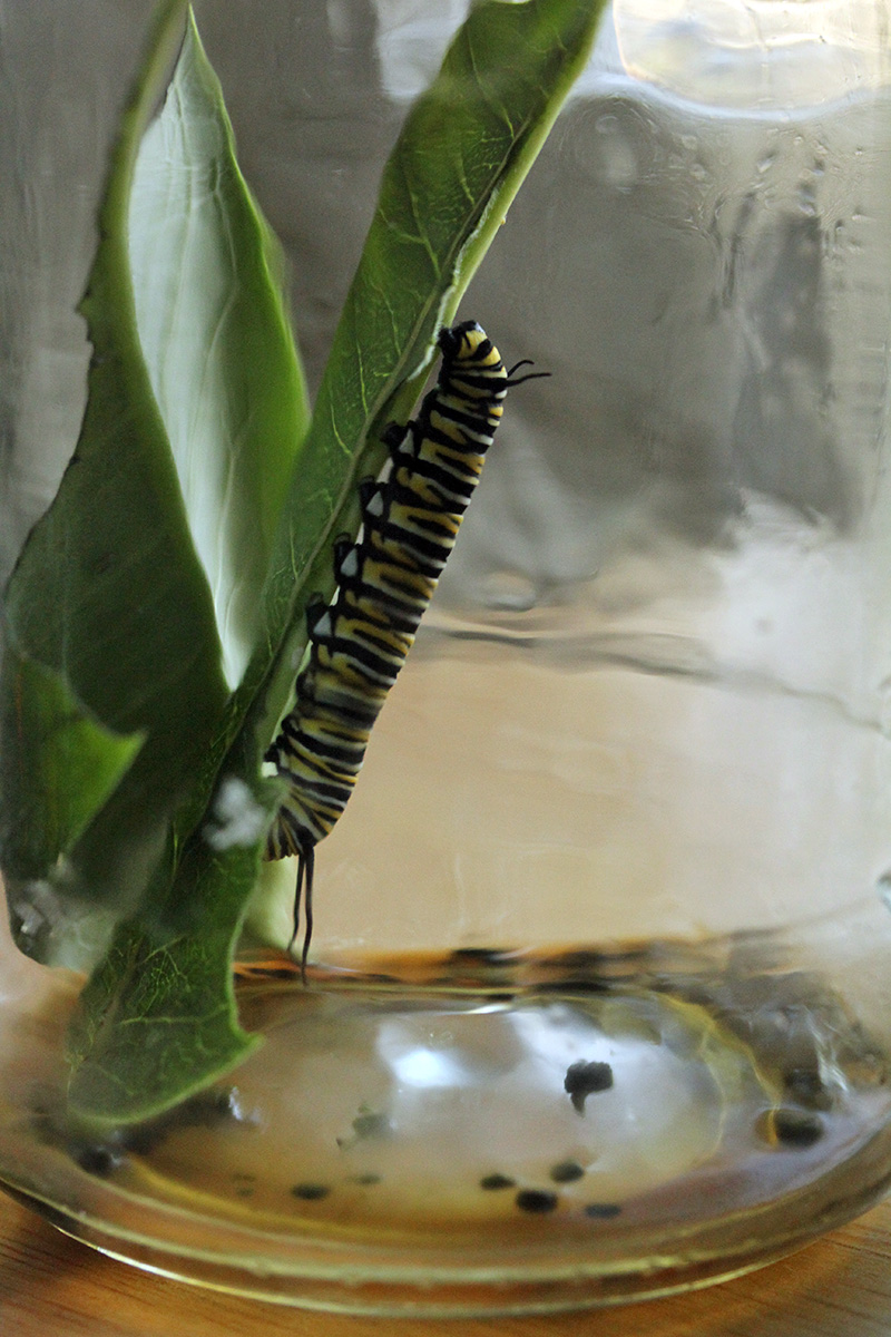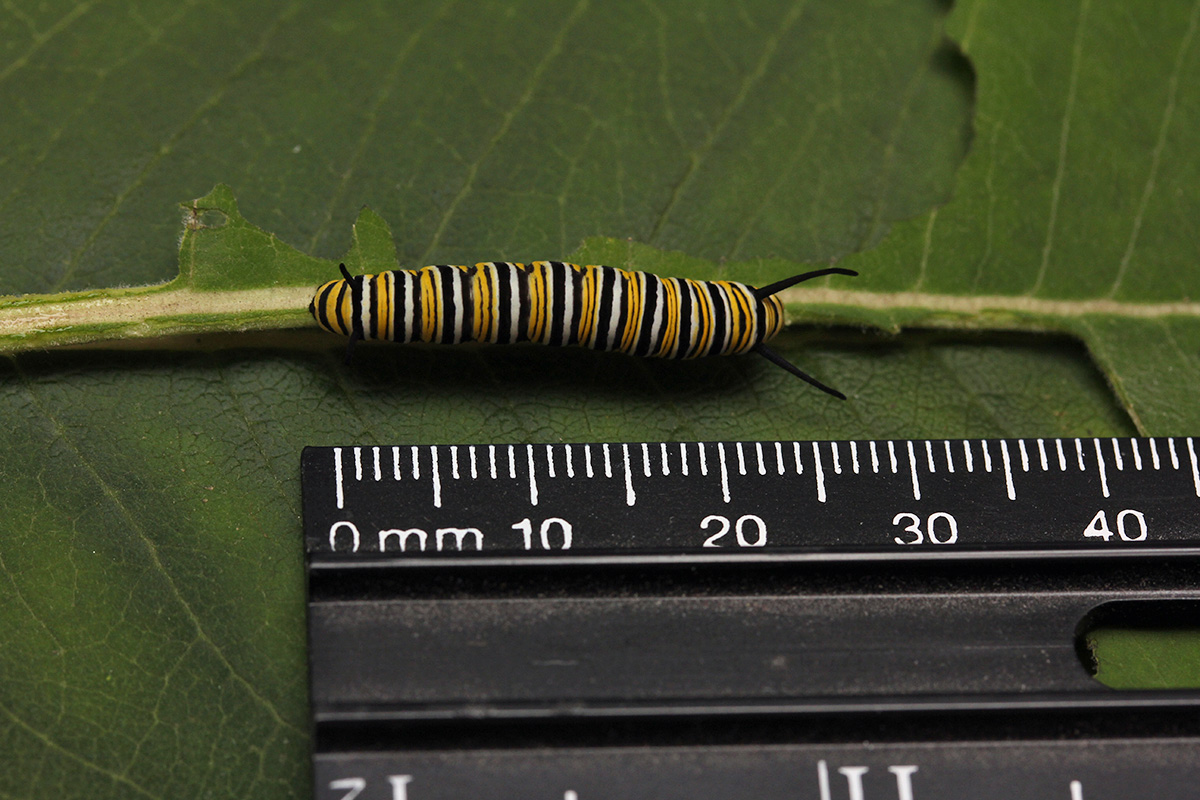 catone (5th instar) is doing all sorts of weird things. when i took a photo of the jars at 8:30pm, catone seemed normal looking. 3 hours later around midnight, it seemed to have grown 50% in size. i didn't want to disturb it by taking it out for a measurement, but an eyeball estimate with a ruler on the side says catone is now approximately 50mm long, which the maximum size for 5th instar caterpillars. it alternates between resting in the center of the leaf and climbing to the top of the leaf and eating the milkweed in a hurry. it should be at 5th instar between 3-5 days before turning into a chrysalis. today is just day 2 so it still has a few more days of eating left. fortunately i have a milkweed stockpile. i think i might've caught it while it was doing a stretch, that's why it seemed so much bigger. later when it started eating again, it seemed to be a bit smaller, though still a big caterpillar.