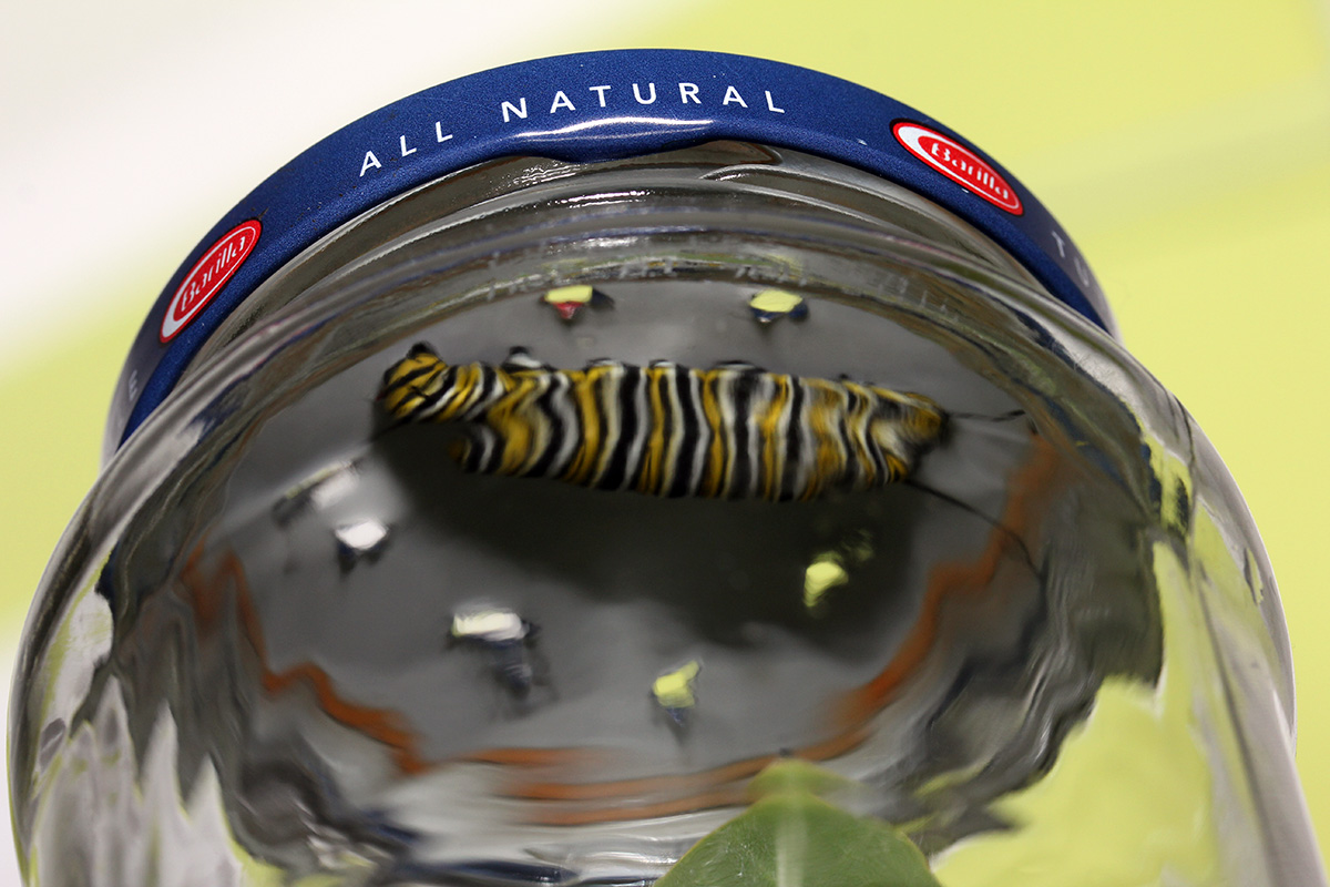 i saw catone on the bottom of the lid tonight. this meant it'd stopped eating and would now undergo the transformation into a chrysalis. i was going to unscrew the lid so i could take a better look but i didn't want to disturb the chrysalis transformation process.