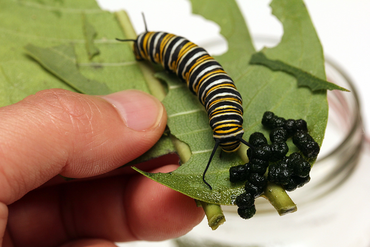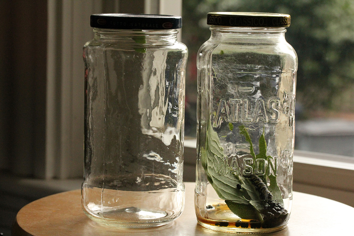 i thought cattwo had drowned this morning because i saw it at the bottom of the jar, but it was still on a piece of leaf, surrounded by its own droppings. i guess it got hungry from all that roaming around it did last night and ate most of the milkweed in the jar. so the first thing i did was go down to my garden and finally pick off a piece of fresh milkweed leaf for it to eat. chances are it wouldn't eat much if any, but at least it'd give it a platform to crawl up and hopefully find a spot to transition at the bottom of the lid.