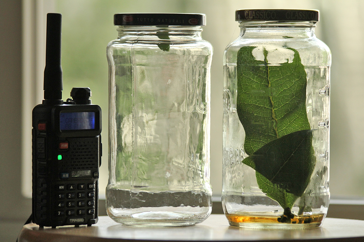the leaf that i picked turned out to be longer than the jar, so i had to fold the tip a bit in order to fit. but i was worried that cattwo wouldn't know how to get to the lid bottom so i snipped off the tip with a pair of scissors.