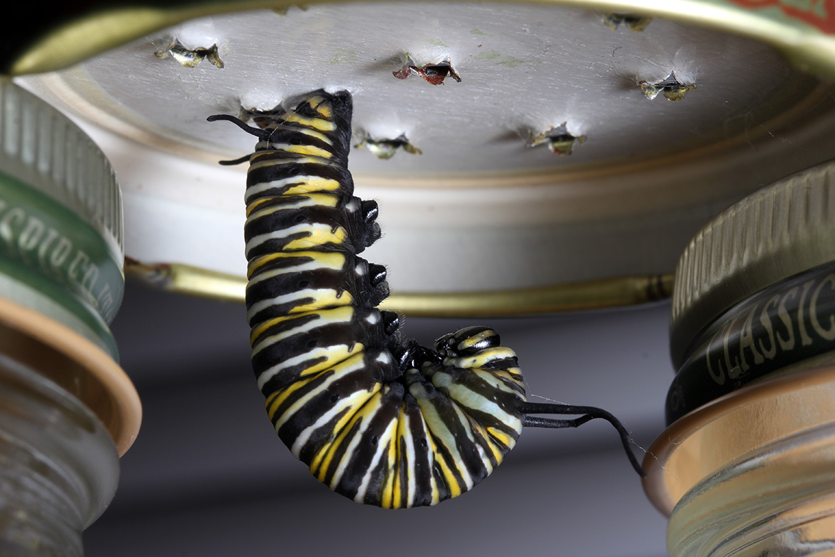 as i was getting ready for bed i noticed that cattwo was already hanging from the lid in the j-hook pose. i took the opportunity to clean out the jar then take a bunch of photos. i don't know how long it takes before it transitions to a full chrysalis, but at least half a day, so hopefully tomorrow i'll get to see it in progress.